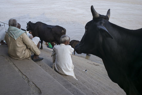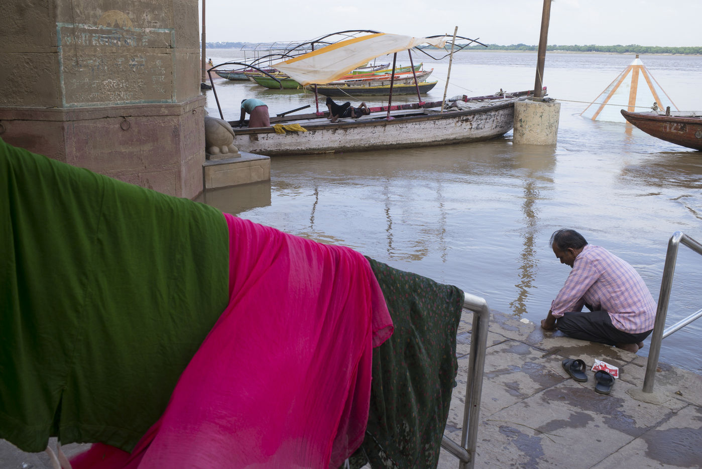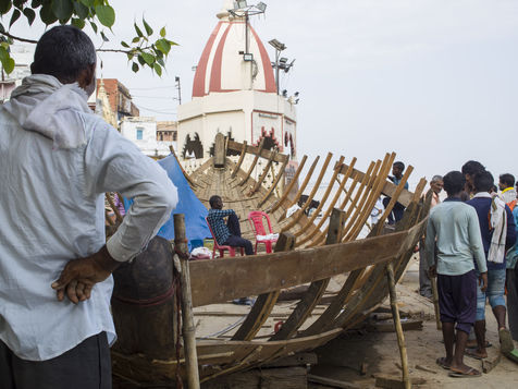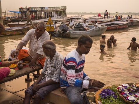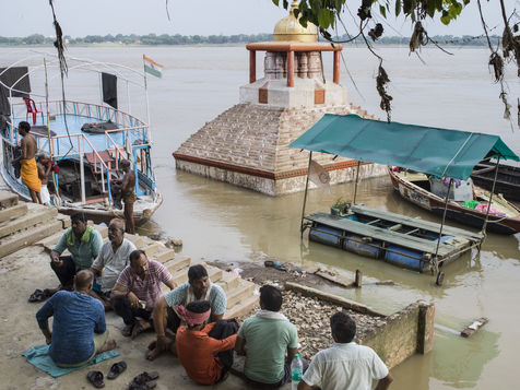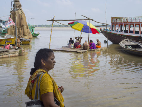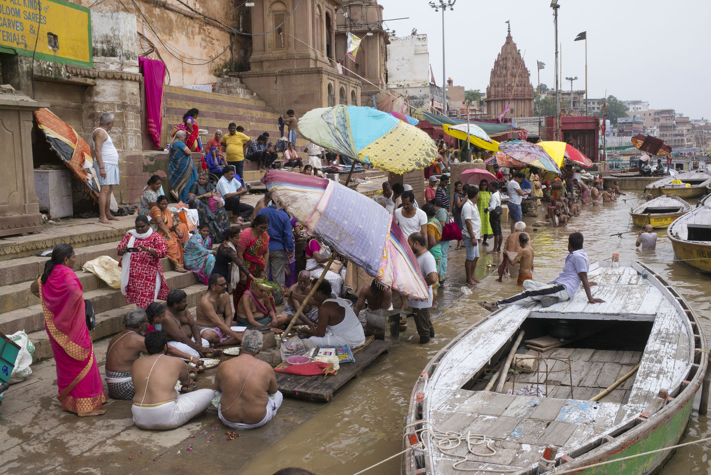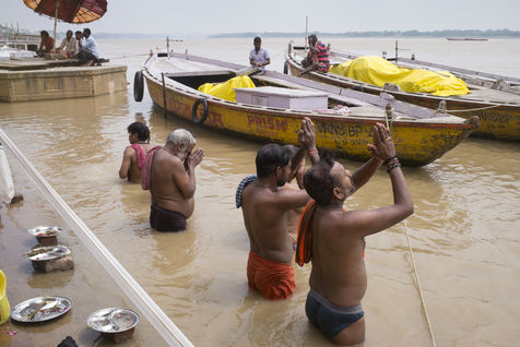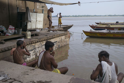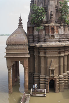Located on the left bank of the Ganges, Varanasi is the holiest city in Hinduism and Jainism. It hosts the largest number of pilgrims in India. At the end of the monsoon season, the ghats are reduced to a bare minimum as the waters of the Ganges rise