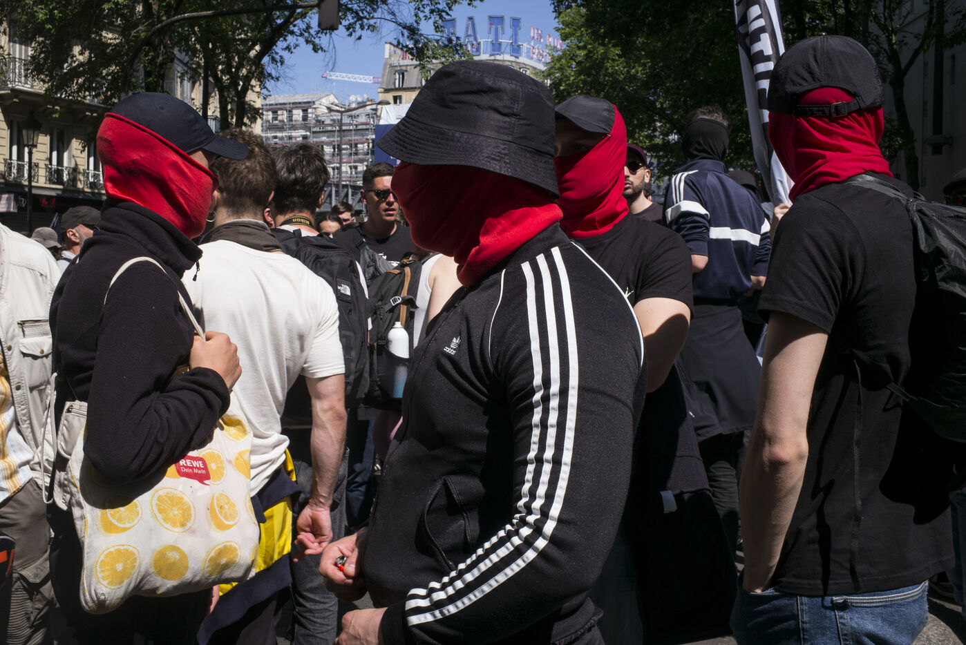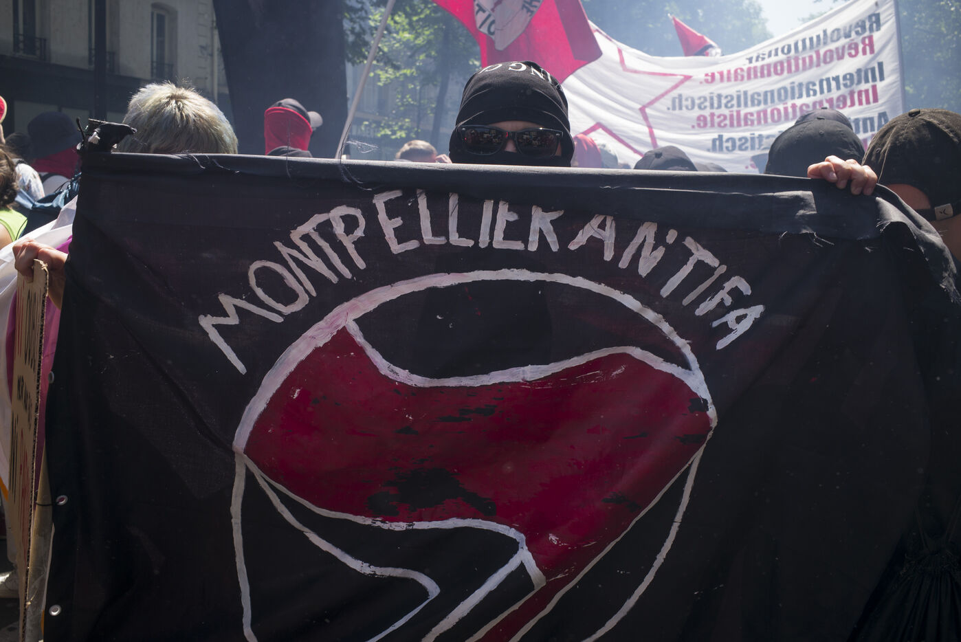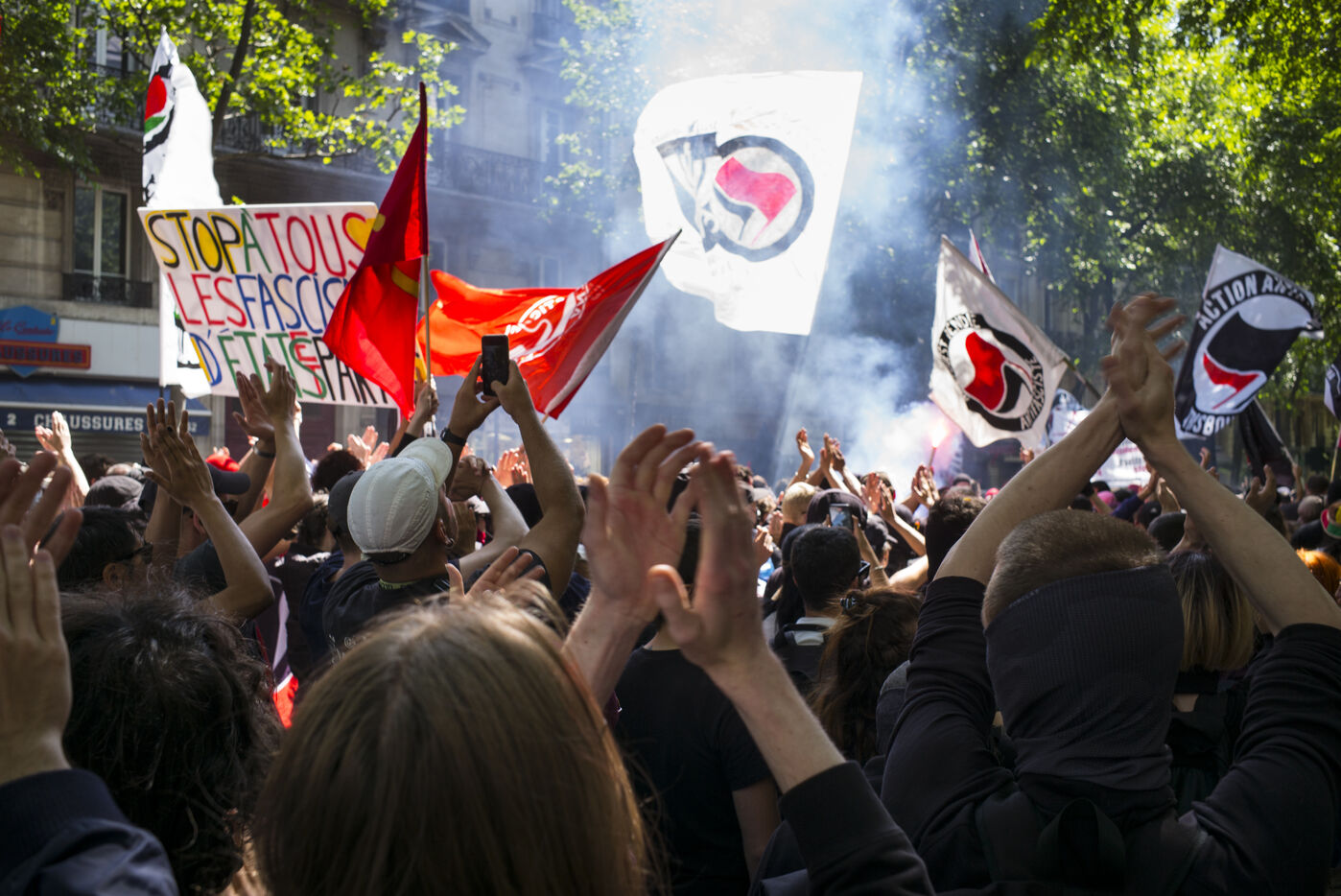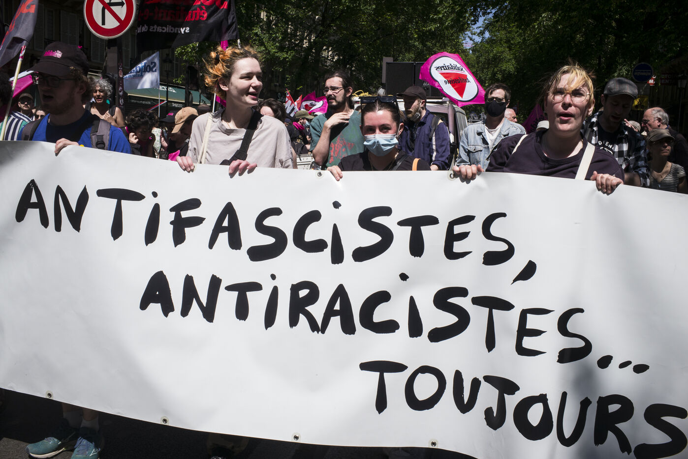 Manifestation à Barbes Rochechouart antifasciste pour le dixième anniversaire du meurtre de Clement Méric, militant antifasciste de 18 ans, par des skinheads