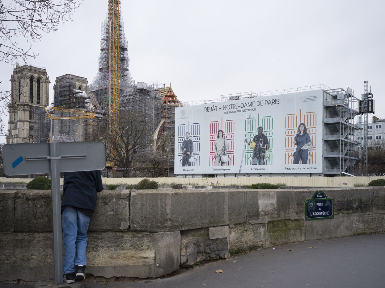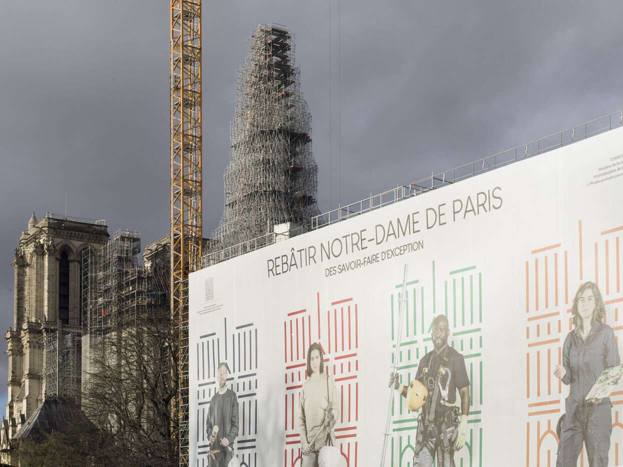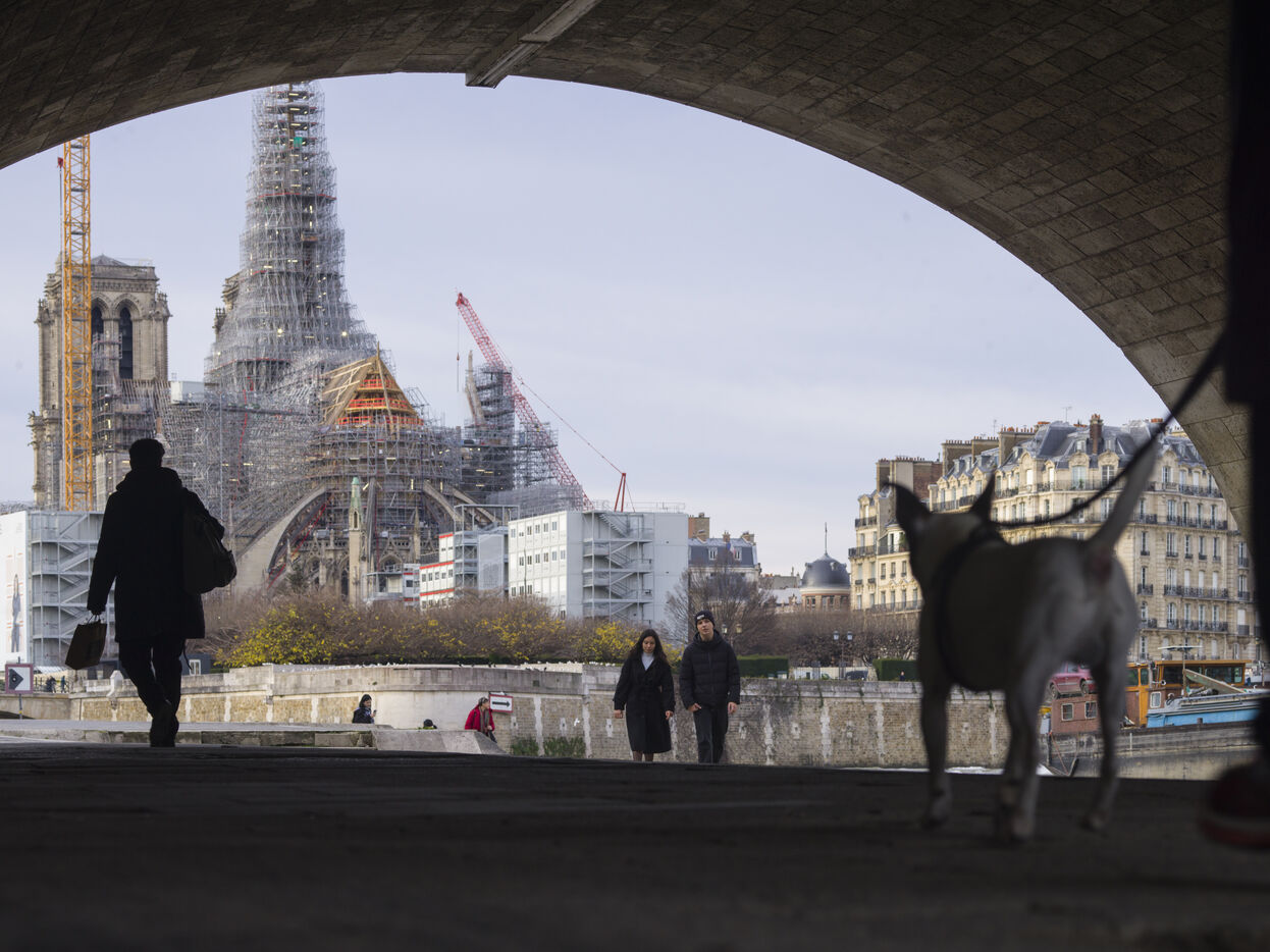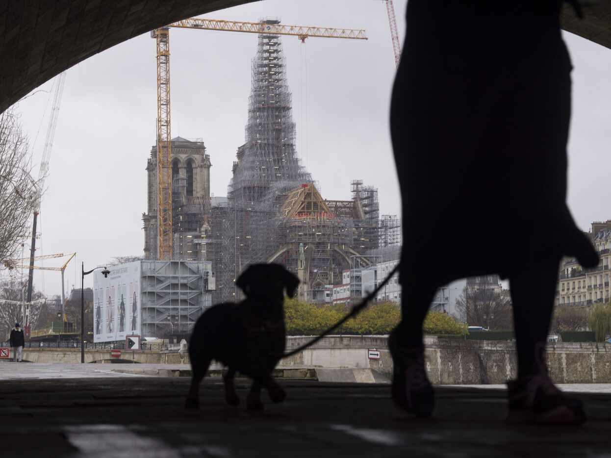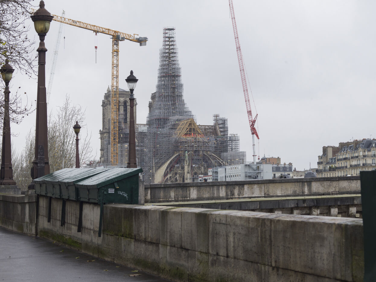 Four and a half years after the fire at Notre-Dame Cathedral and a year before its reopening, the silhouette of the spire can once again be seen through the scaffolding.