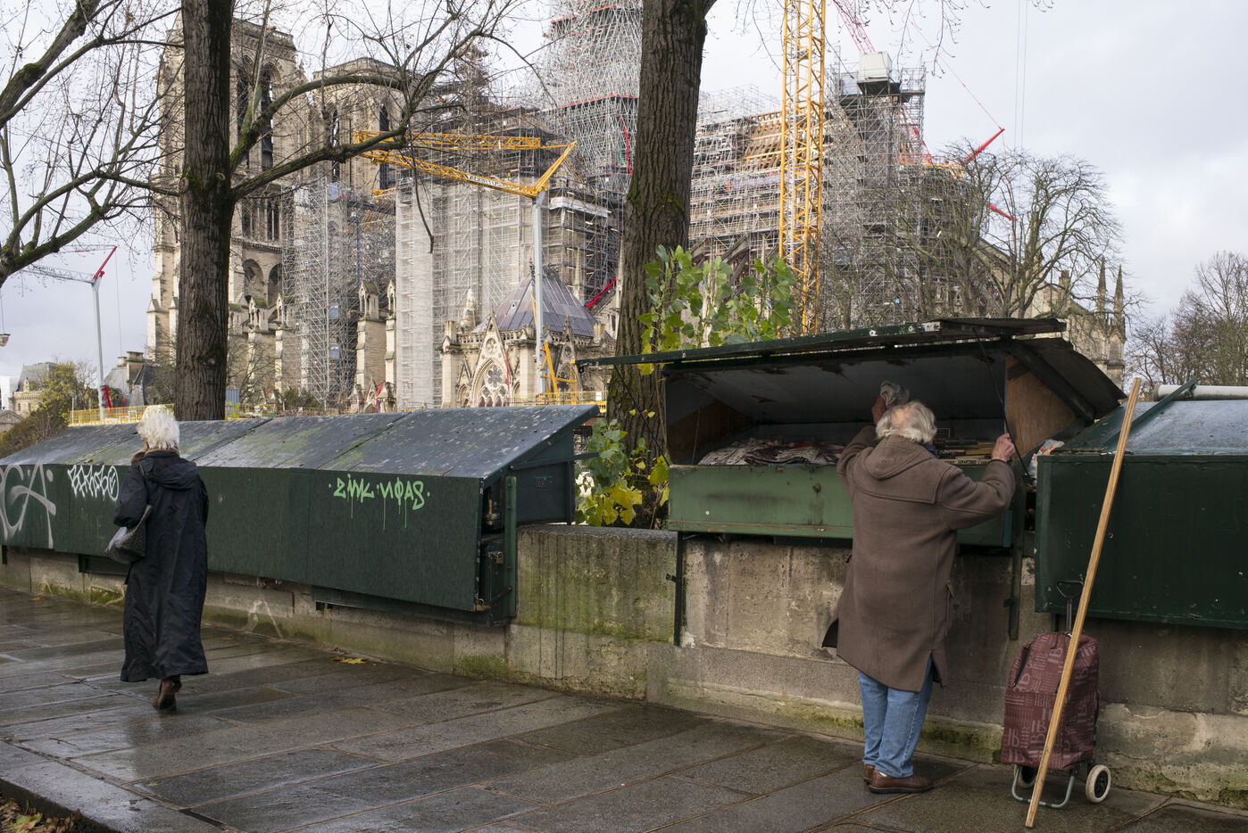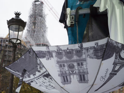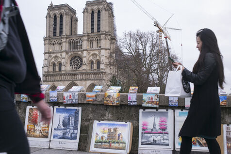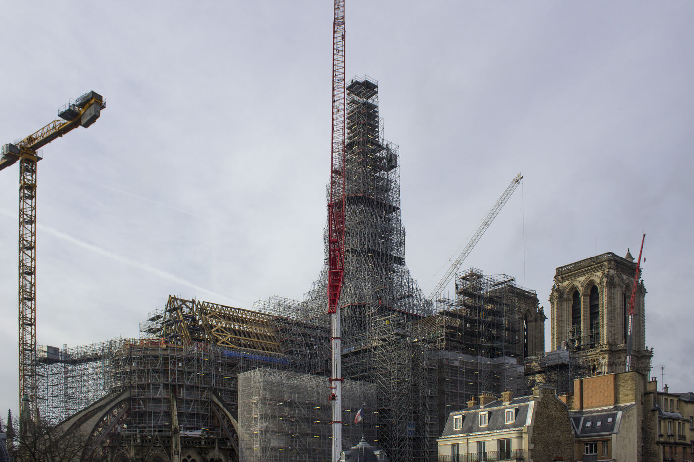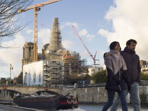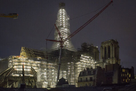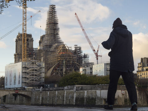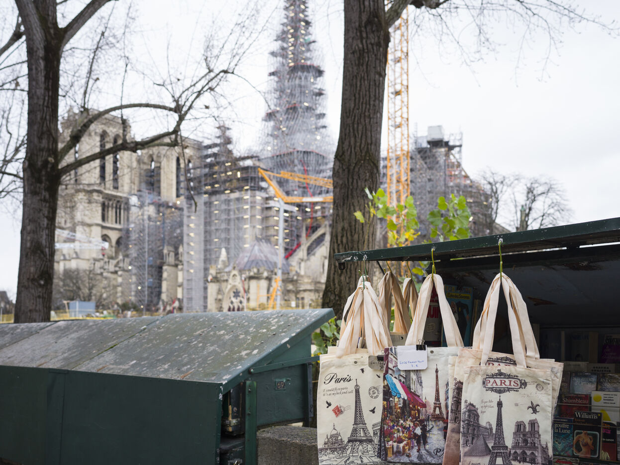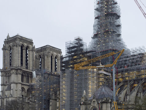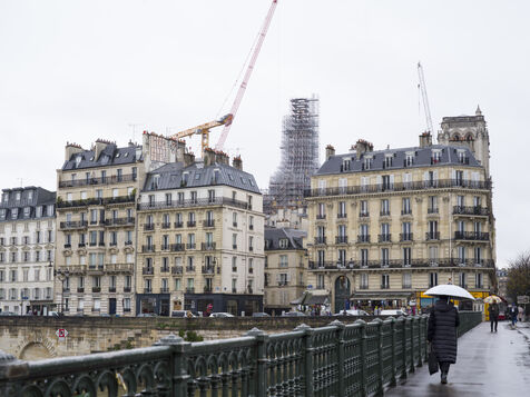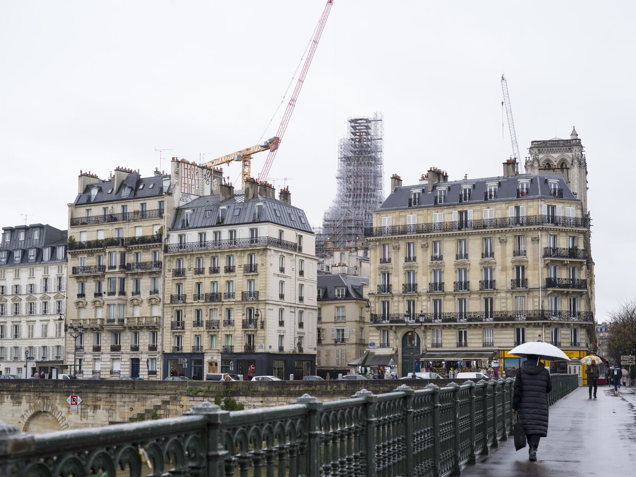 Four and a half years after the fire at Notre-Dame Cathedral and a year before its reopening, the silhouette of the spire can once again be seen through the scaffolding.