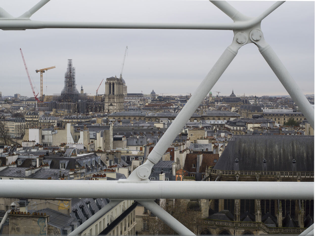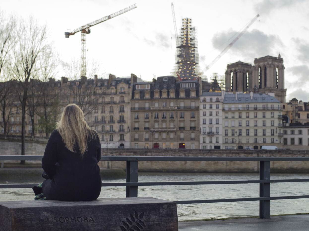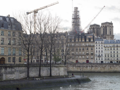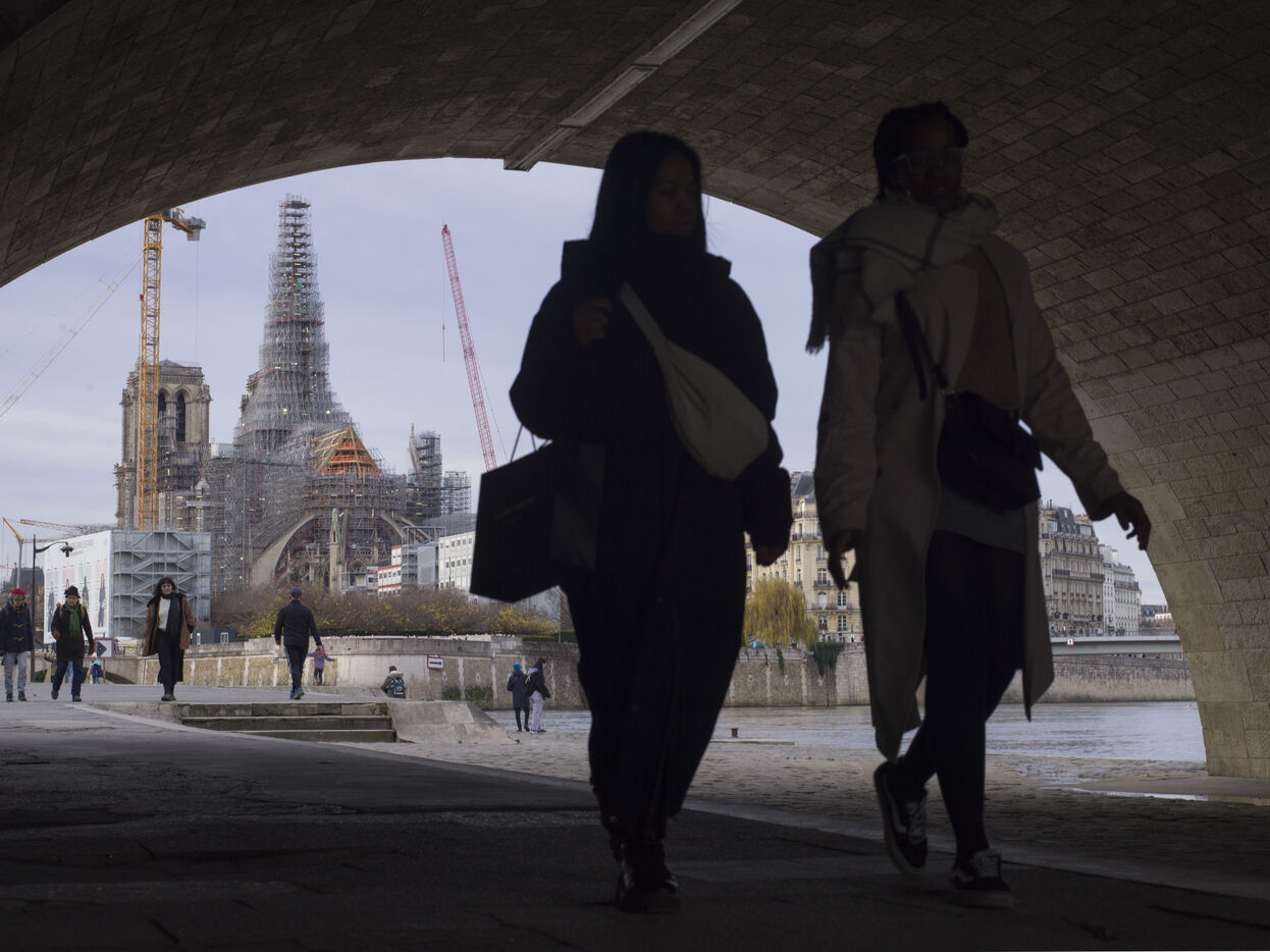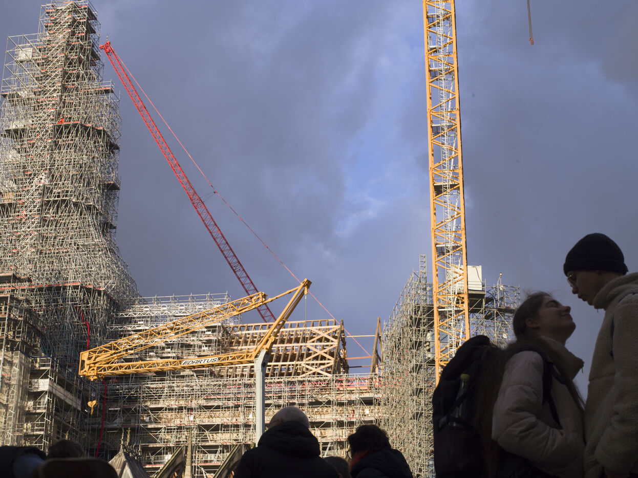 Quatre ans et demi après l'incendie de la cathédrale Notre-Dame et un an avant sa réouverture, on distingue à nouveau la silhouette de la flèche à travers les échafaudages.