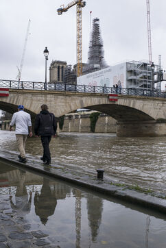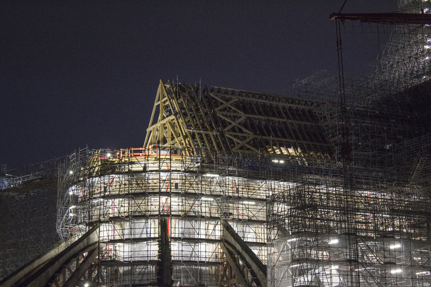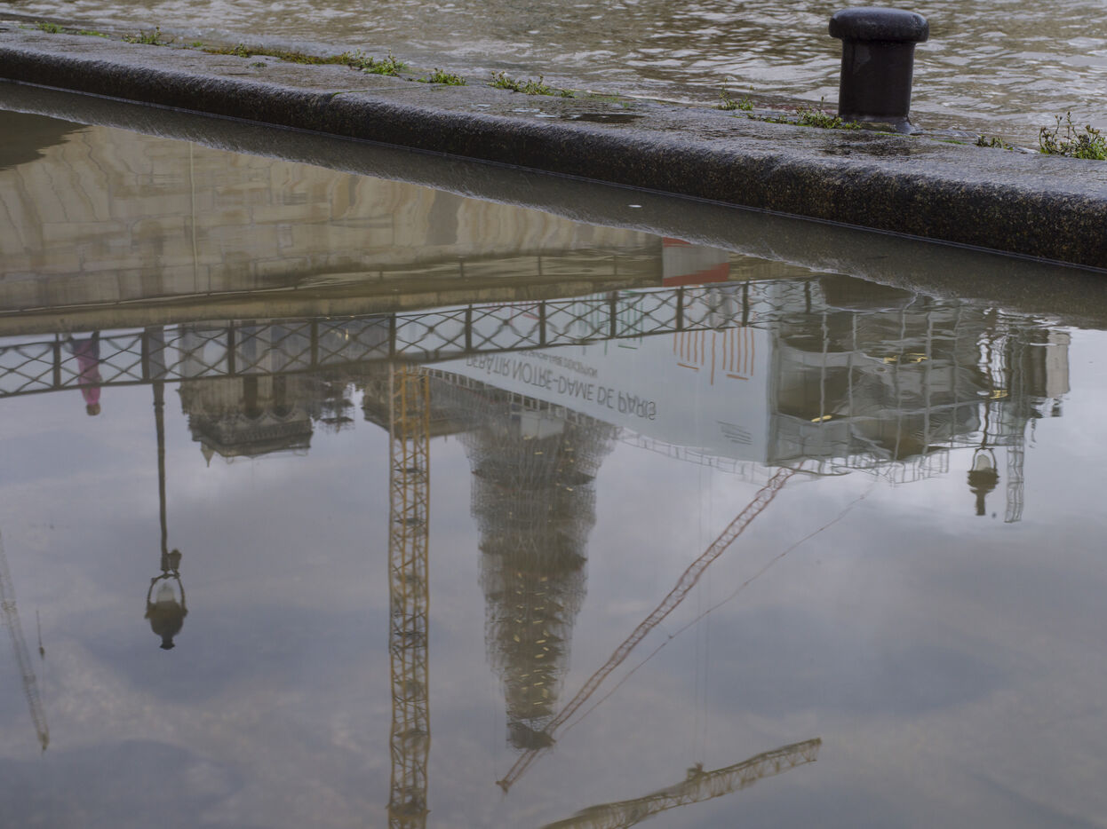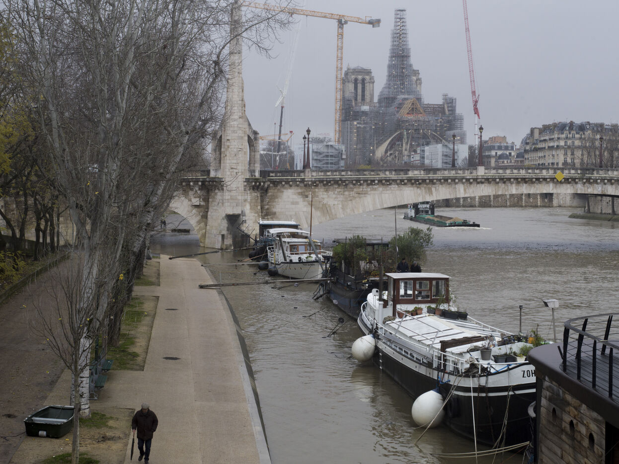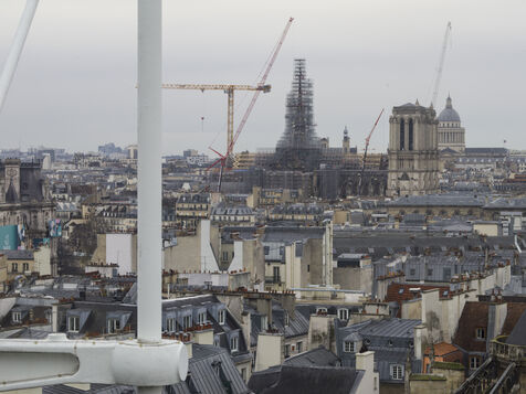 Quatre ans et demi après l'incendie de la cathédrale Notre-Dame et un an avant sa réouverture, on distingue à nouveau la silhouette de la flèche à travers les échafaudages.