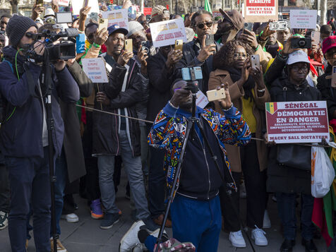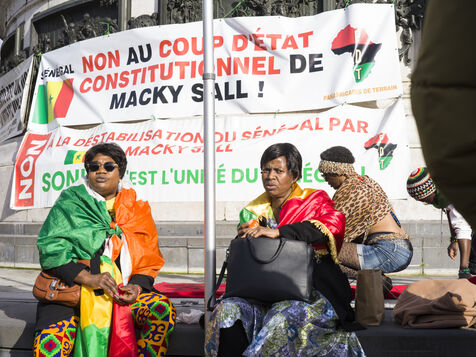 Around two hundred demonstrators, mostly members of the Senegalese diaspora, protest against President Macky Sall at the Place de la République in Paris following the announcement of the postponement of the presidential election