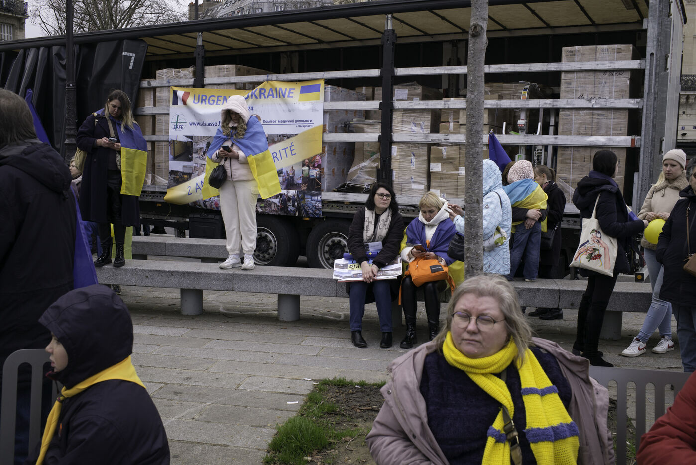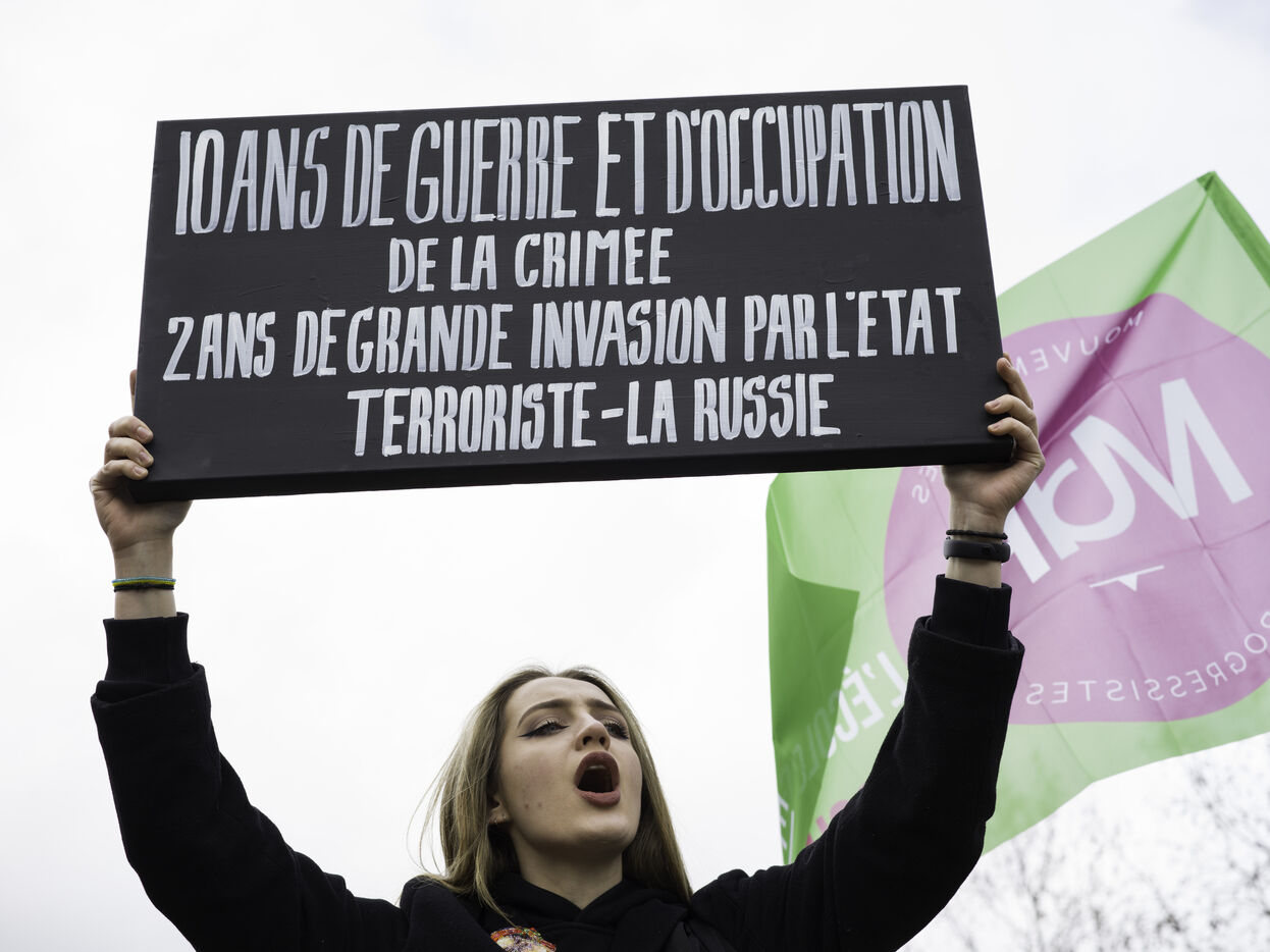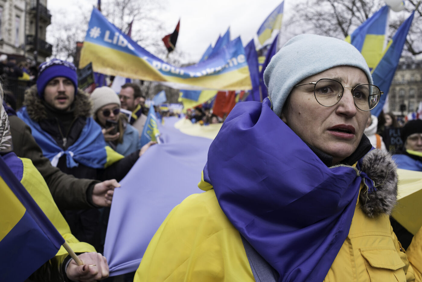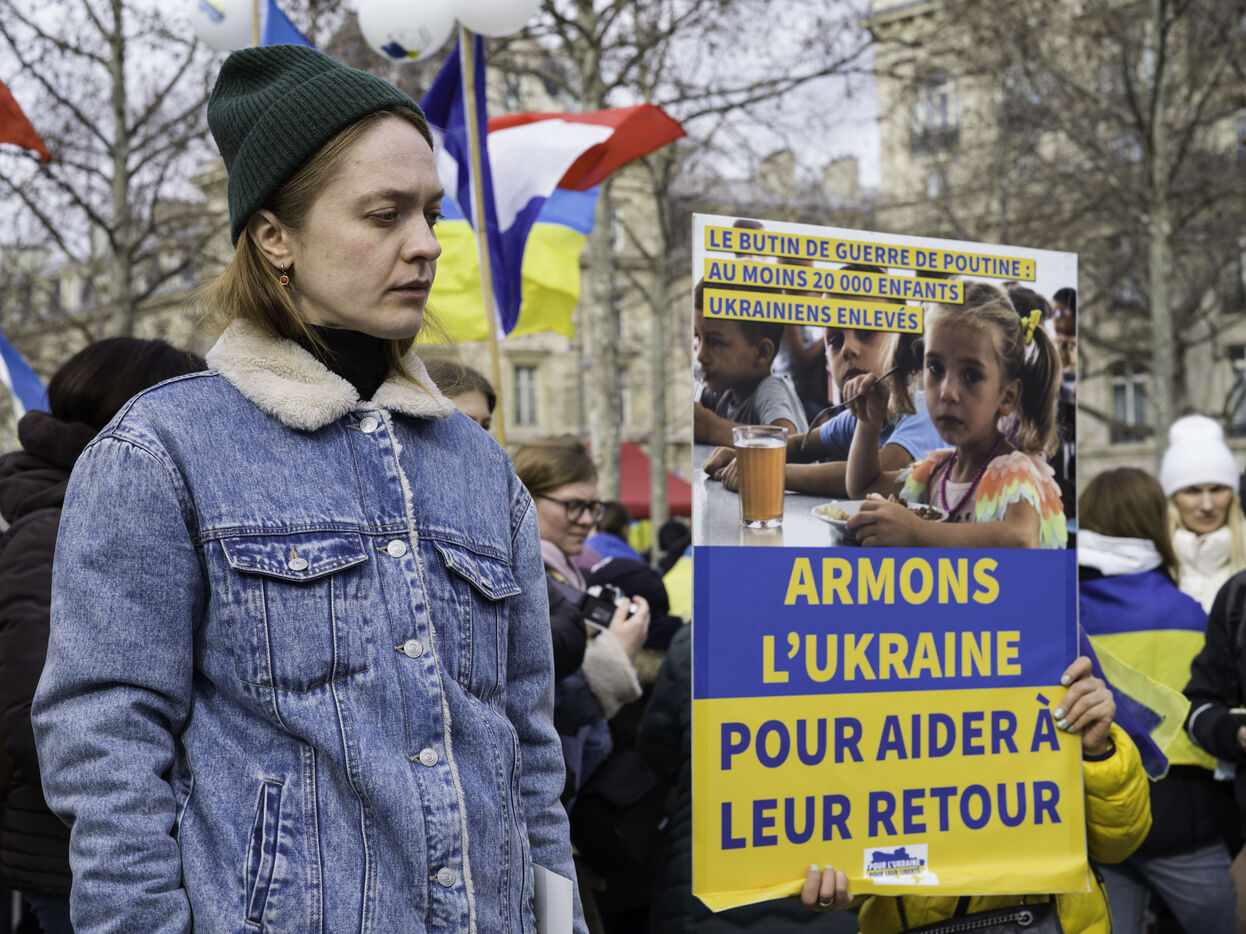 France, Paris, 2024-02-14. For 2 years, Russia has been waging a criminal war in Ukraine. On 24 February, a march through Paris was organised to show solidarity with the Ukrainian people and to denounce the atrocious crimes against humanity committed by Putin and his army. Photograph by Eric Broncard/Hans Lucas.
