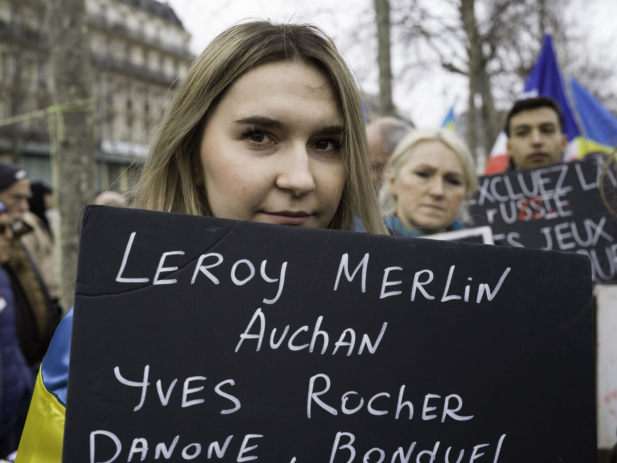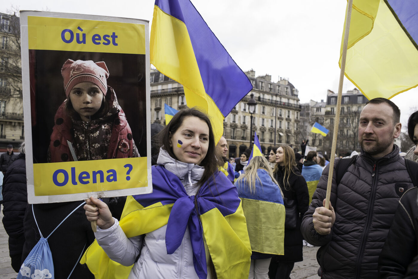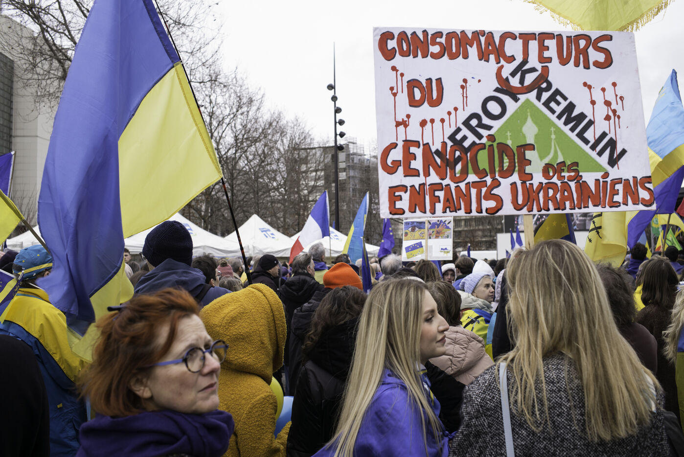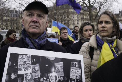 France, Paris, 2024-02-14. For 2 years, Russia has been waging a criminal war in Ukraine. On 24 February, a march through Paris was organised to show solidarity with the Ukrainian people and to denounce the atrocious crimes against humanity committed by Putin and his army. Photograph by Eric Broncard/Hans Lucas.