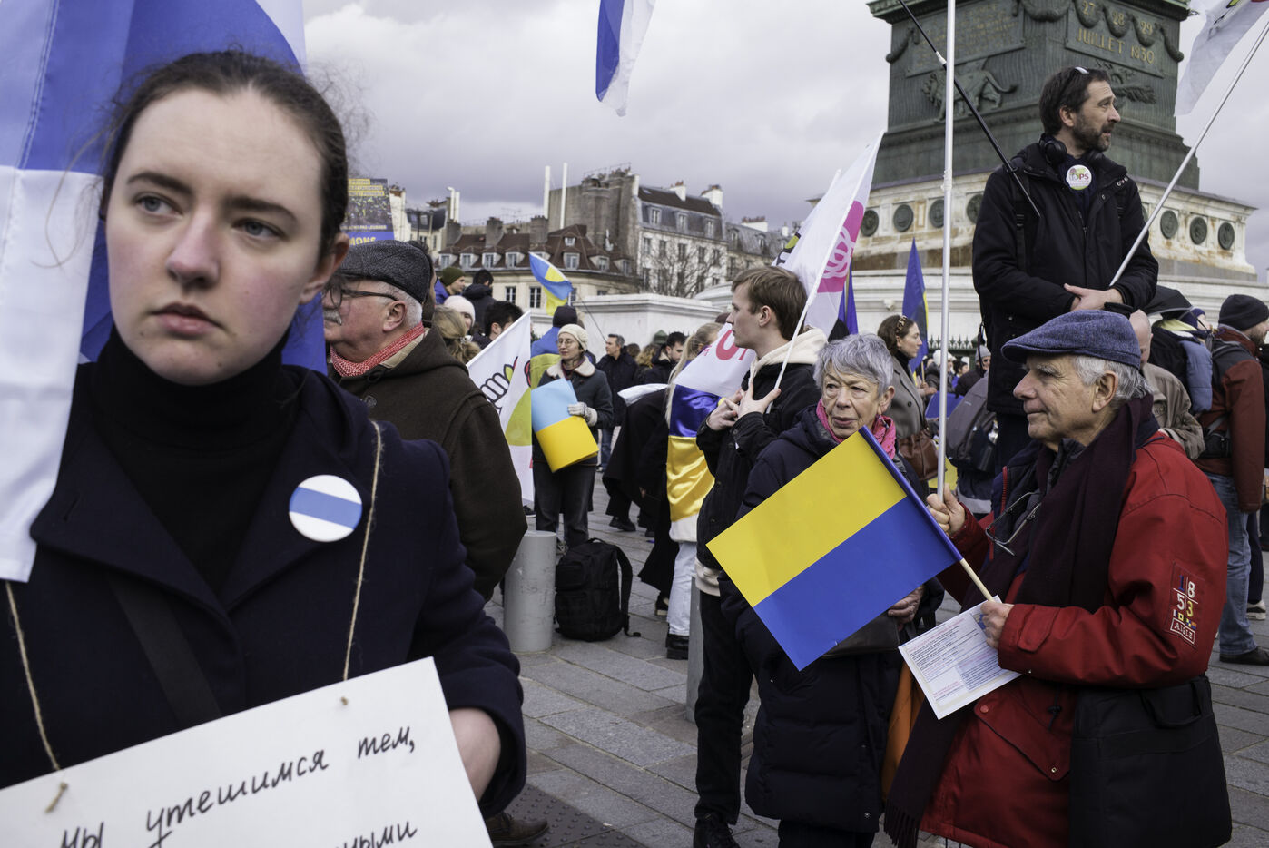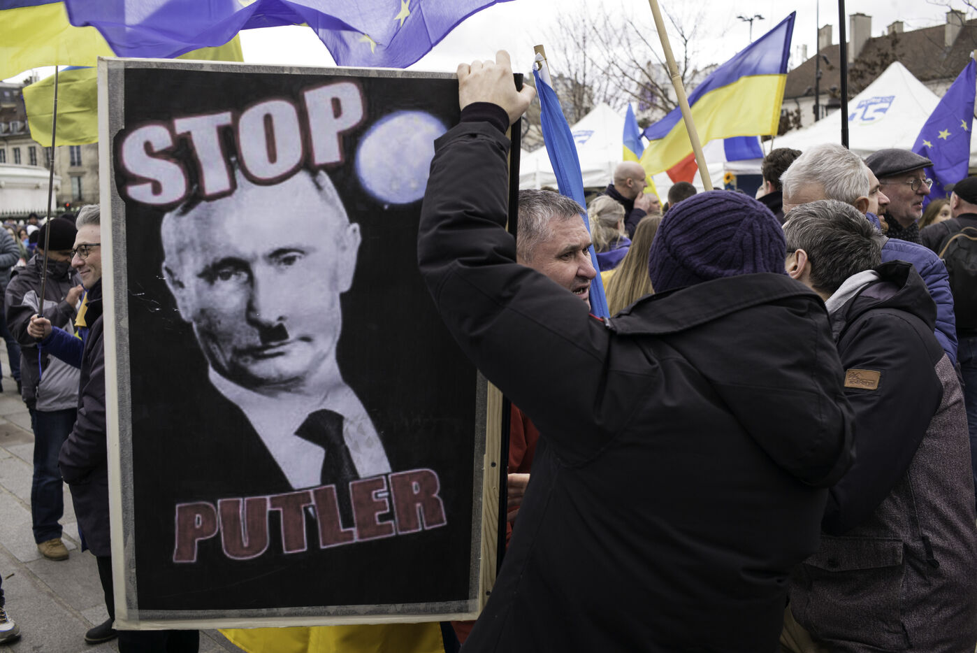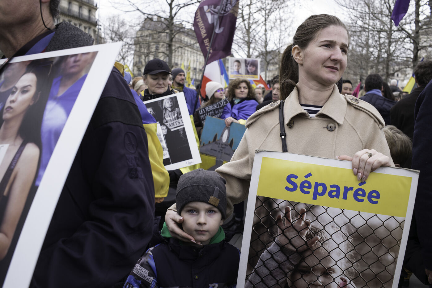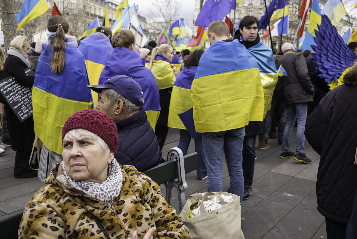 France, Paris, 2024-02-14. For 2 years, Russia has been waging a criminal war in Ukraine. On 24 February, a march through Paris was organised to show solidarity with the Ukrainian people and to denounce the atrocious crimes against humanity committed by Putin and his army. Photograph by Eric Broncard/Hans Lucas.
