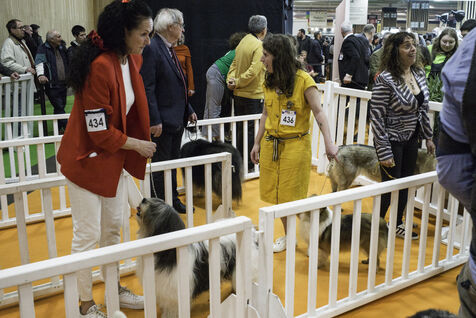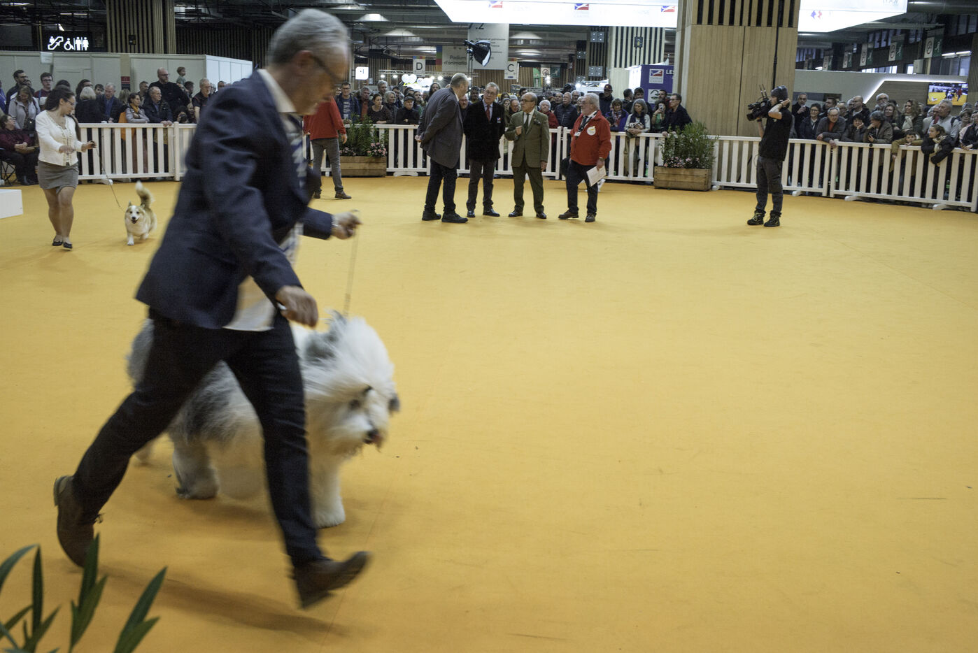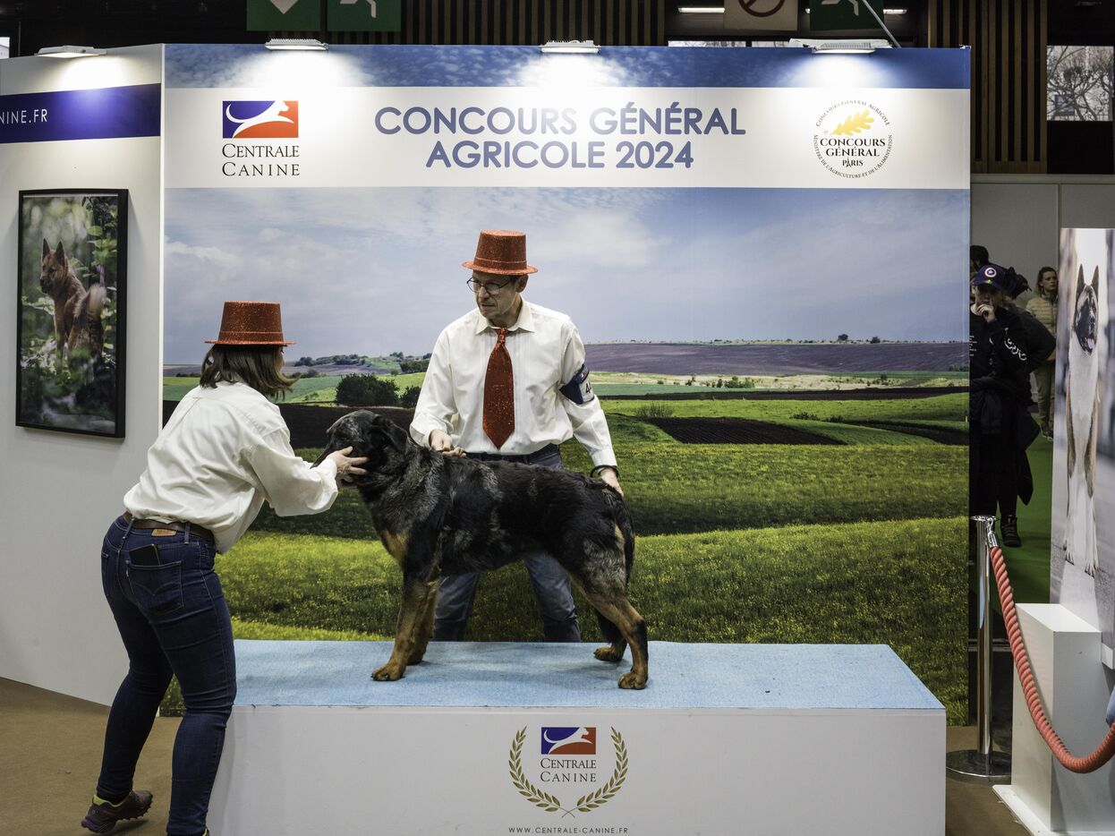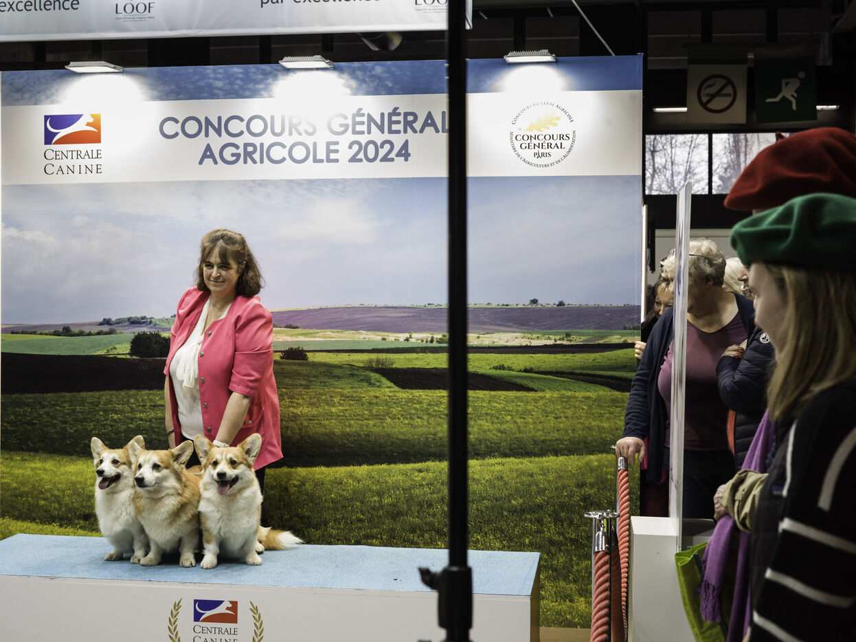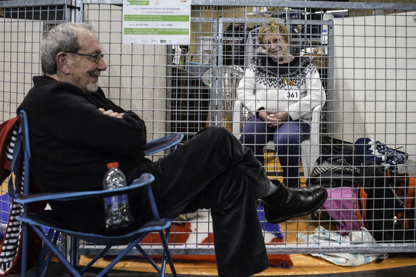 Au Salon de l'Agriculture, de nombreuses chiens se font brosser et peigner avant de passer devant le jury. Les autres attendent leur tour enfermés dans des cages avec leur propriétaire.
