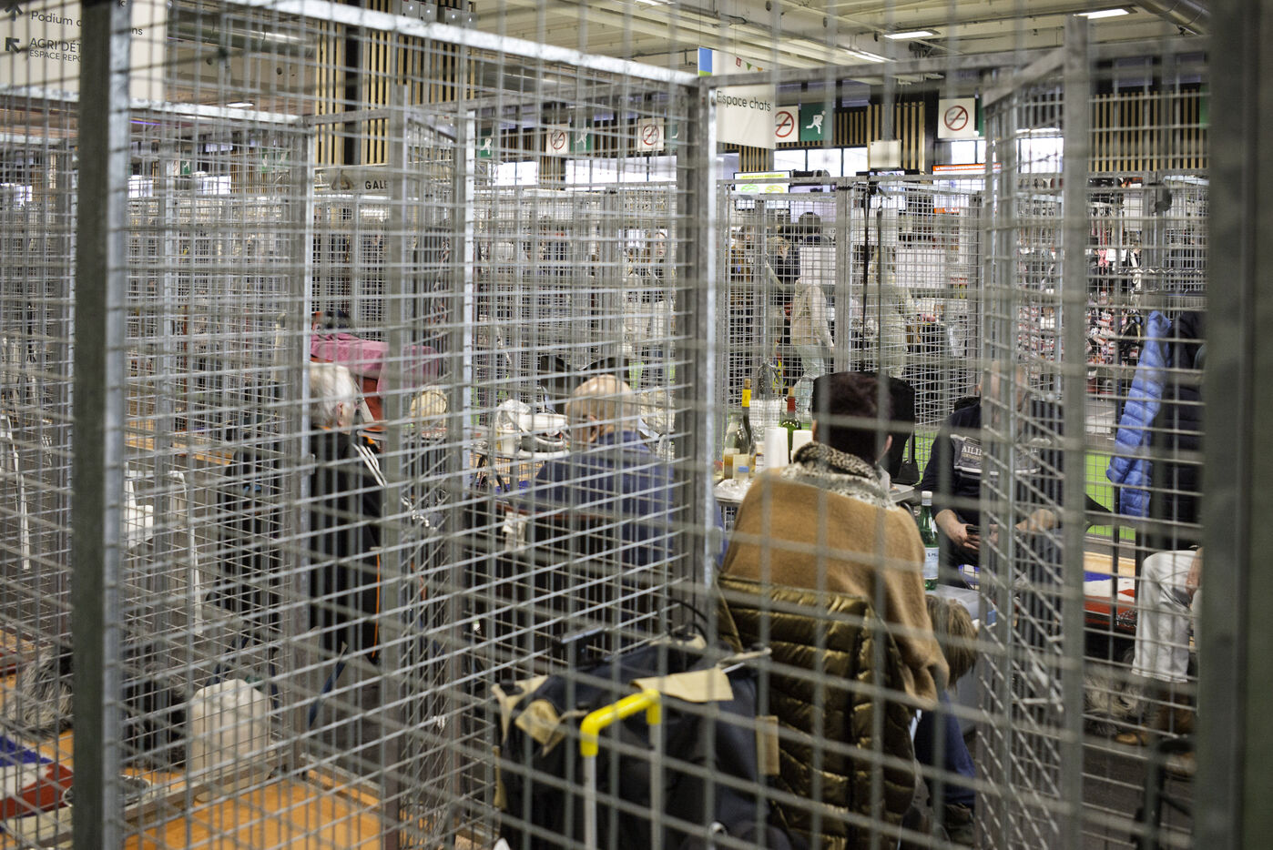 At the Salon de l'Agriculture, many dogs are brushed and combed before going before the jury. The others wait their turn, locked in cages with their owners.