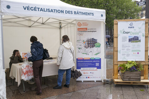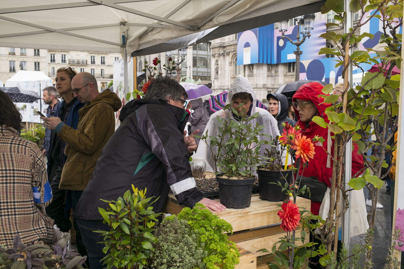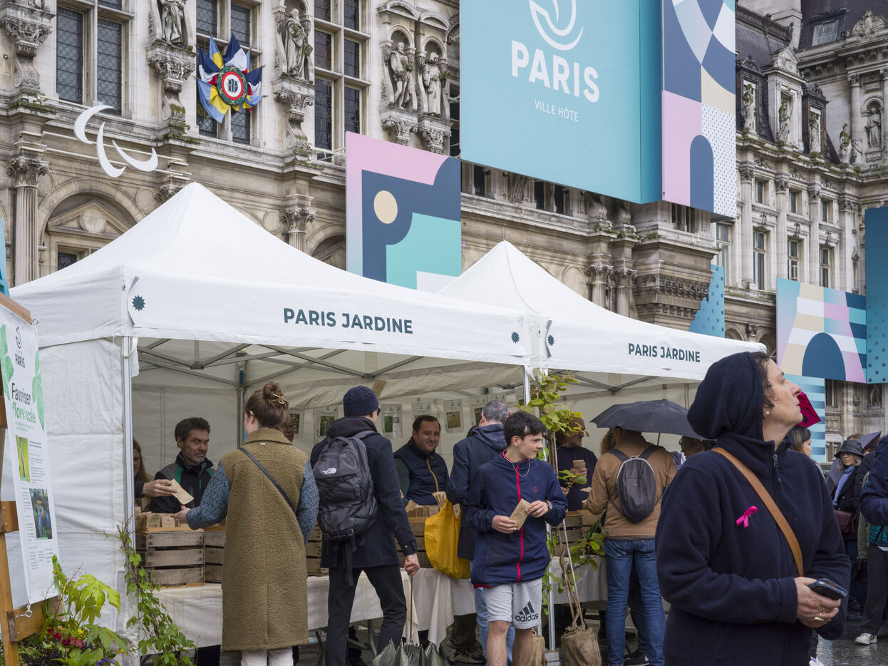 Paris fête le printemps sur la place de l'Hotel de Ville sous la pluie. La ville de Paris distribue des sachets de graines et des semis de plantes locales aux parisiennes et Parisiens désireux de contribuer à la végétalisation de la Ville et d?agir pour la biodiversité de la capitale.