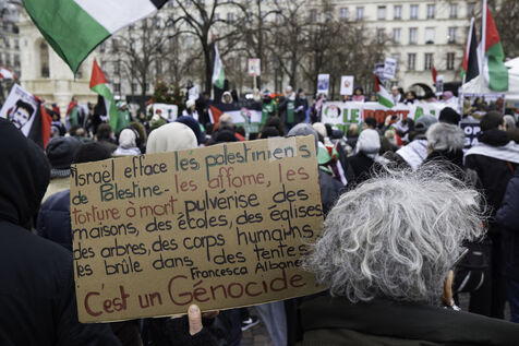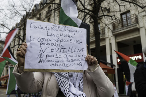 Après 14 mois de guerre à Gaza, un rassemblement est organisé à la fontaine des Innocents, en soutien au peuple de Palestine, au Liban et aux Syriens qui subissent des bombardements israéliens.