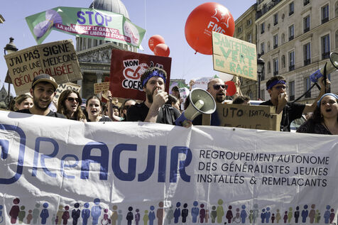 Les médecins en gréve, depuis lundi, manifestent contre la proposition de loi Garot et une contre proposition du gouvernement les obligeant à travailler 2 jours par mois en désert medical. Une manifestation part de la place du Panthéon en direction du ministère de la santé.