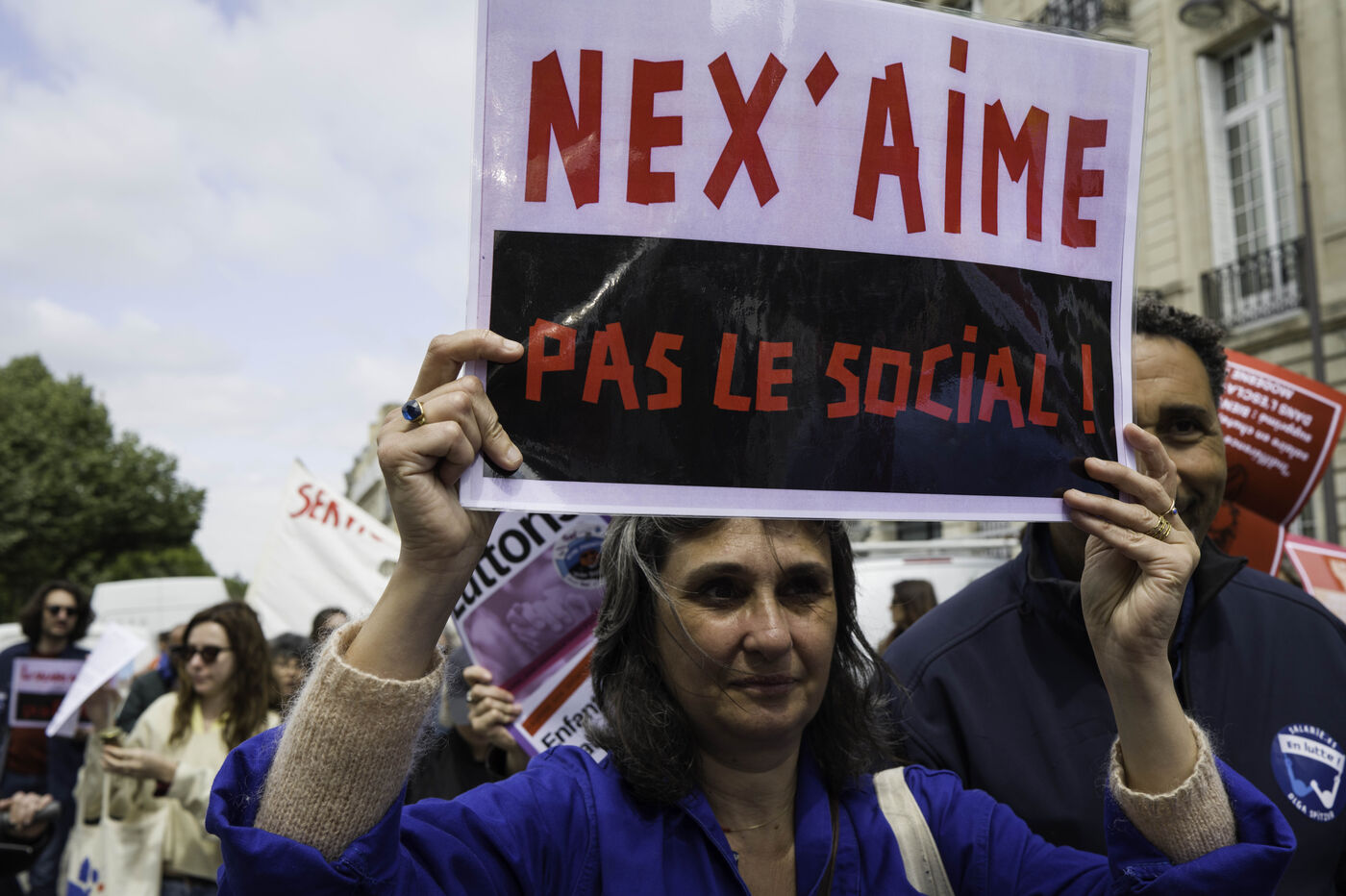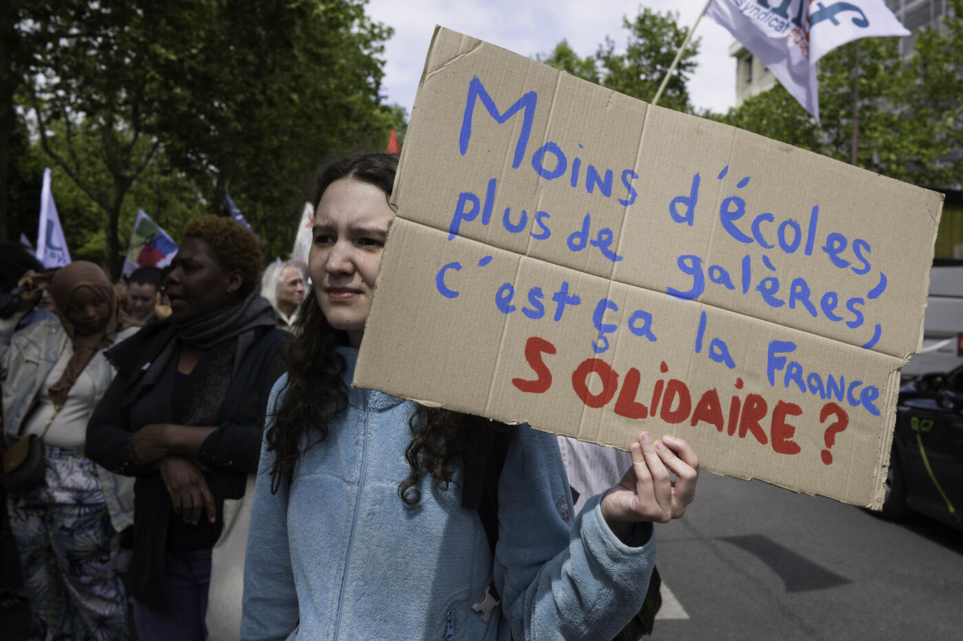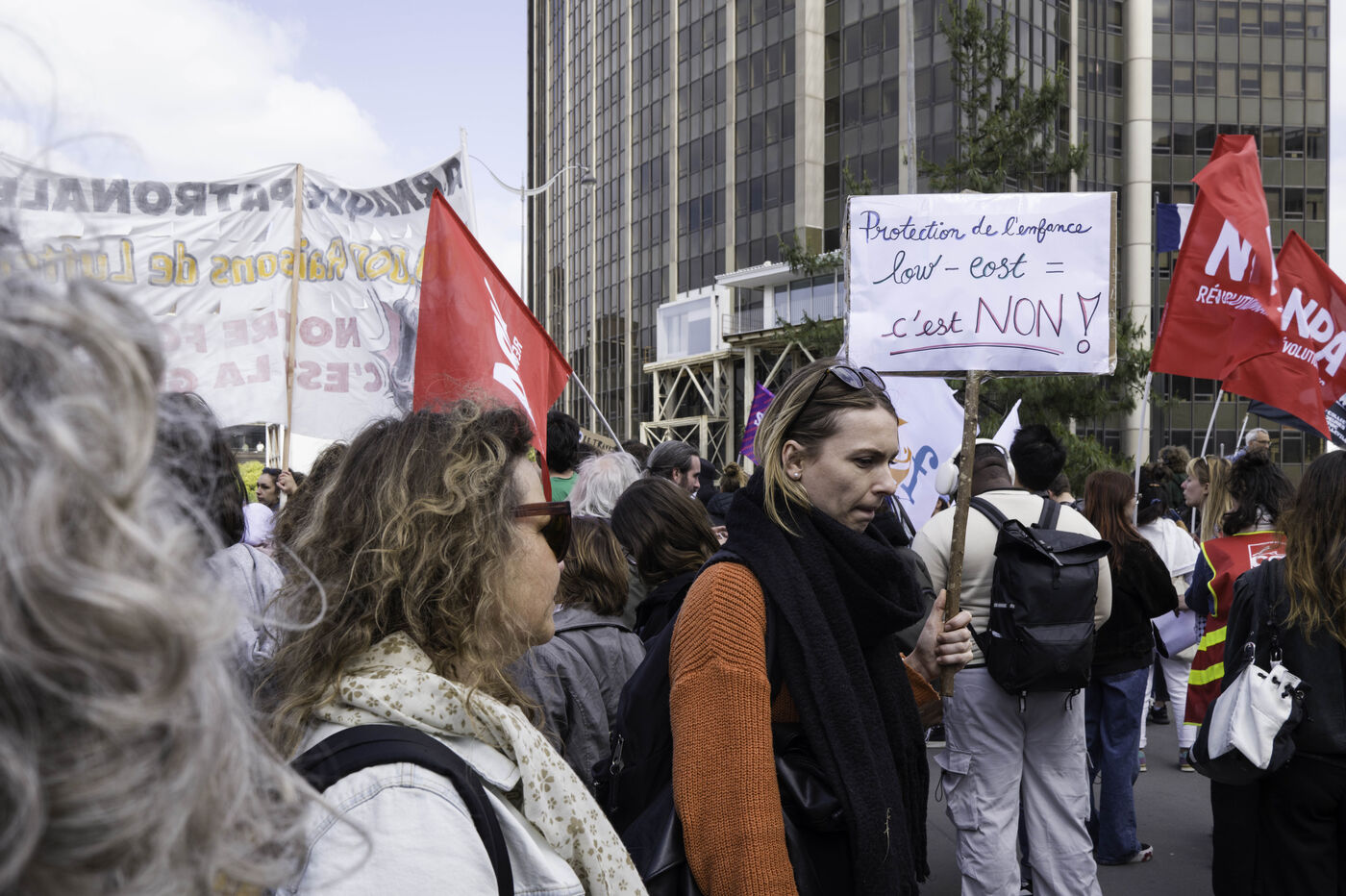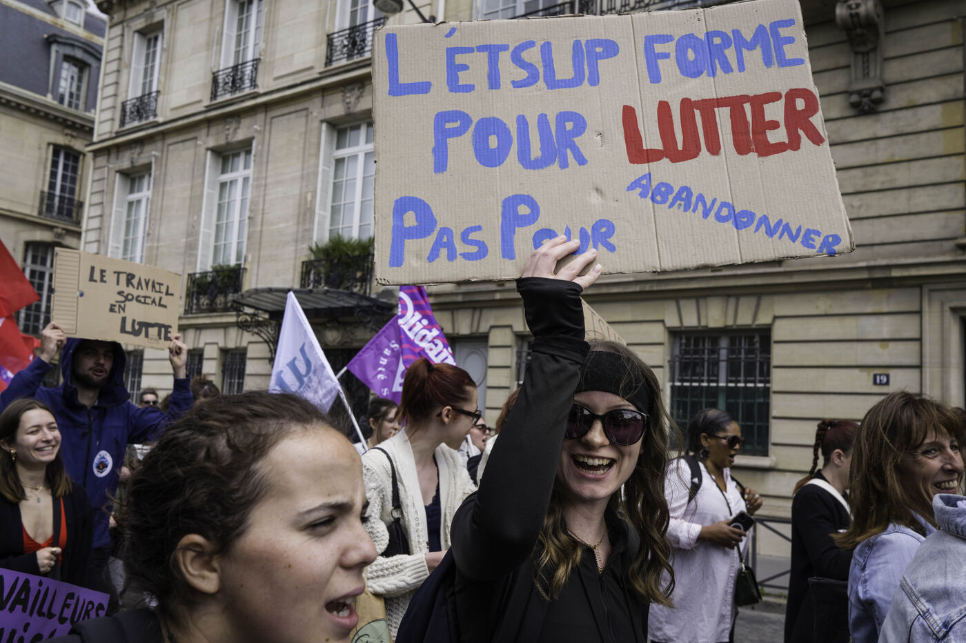e jeune femme porte une pancarte avec le texte «Moins d’écoles, plus de galères, c’est ça la France Solidaire». Les travailleurs du secteur social et médico- social appellent à une gréve pour une hausse des salaires, de meilleurs conditions de travail et une meilleur valorisations des diplômes et des formations. Une manifestation au depart de l’Esplanade des Invalides doit se diriger vers l’ETSUP au pied de la tour Montparnasse.