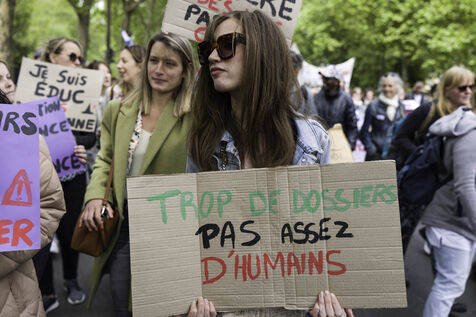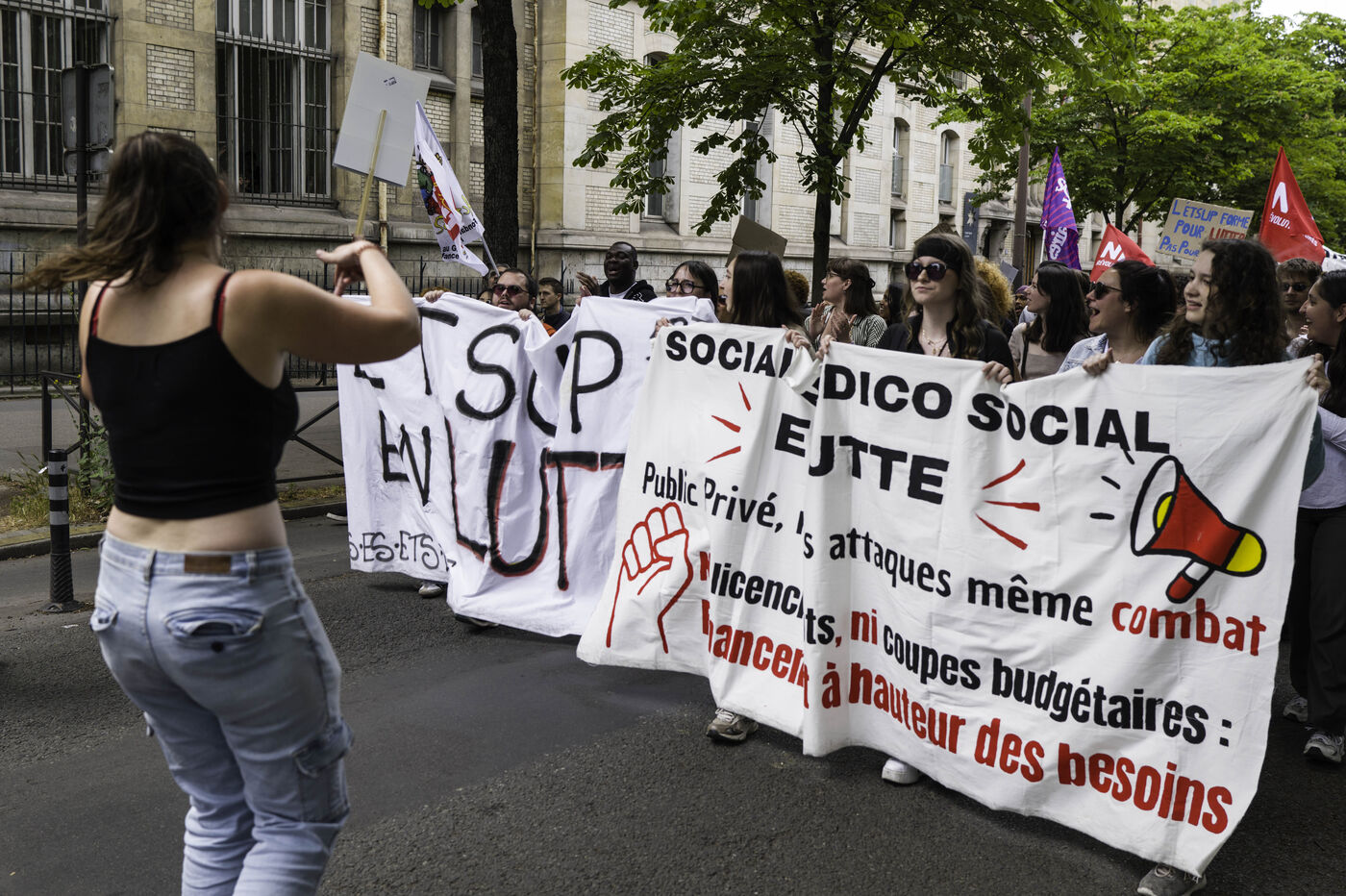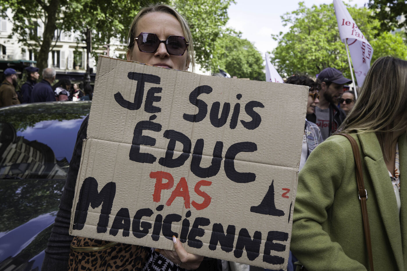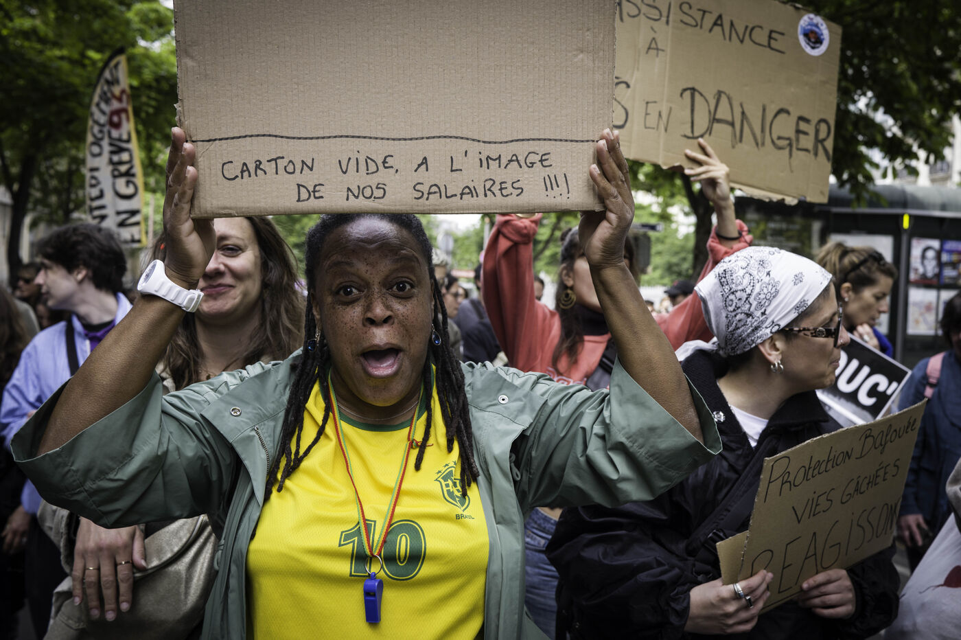 e jeune femme porte une pancarte avec le texte «Moins d’écoles, plus de galères, c’est ça la France Solidaire». Les travailleurs du secteur social et médico- social appellent à une gréve pour une hausse des salaires, de meilleurs conditions de travail et une meilleur valorisations des diplômes et des formations. Une manifestation au depart de l’Esplanade des Invalides doit se diriger vers l’ETSUP au pied de la tour Montparnasse.