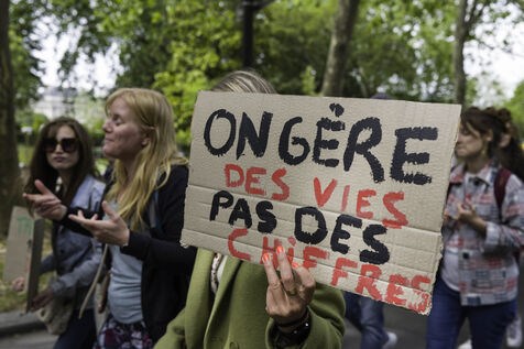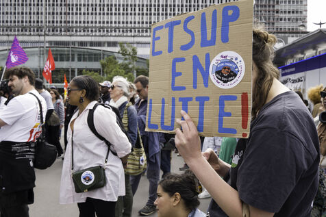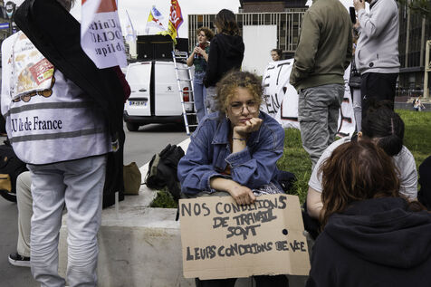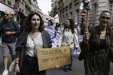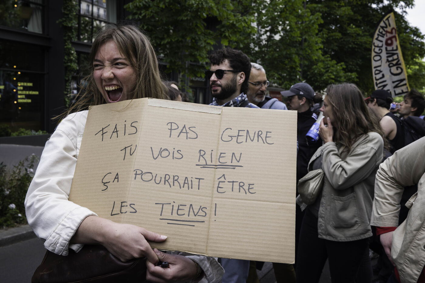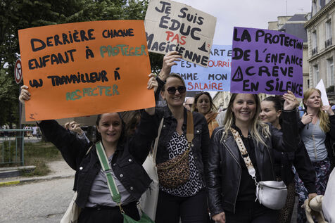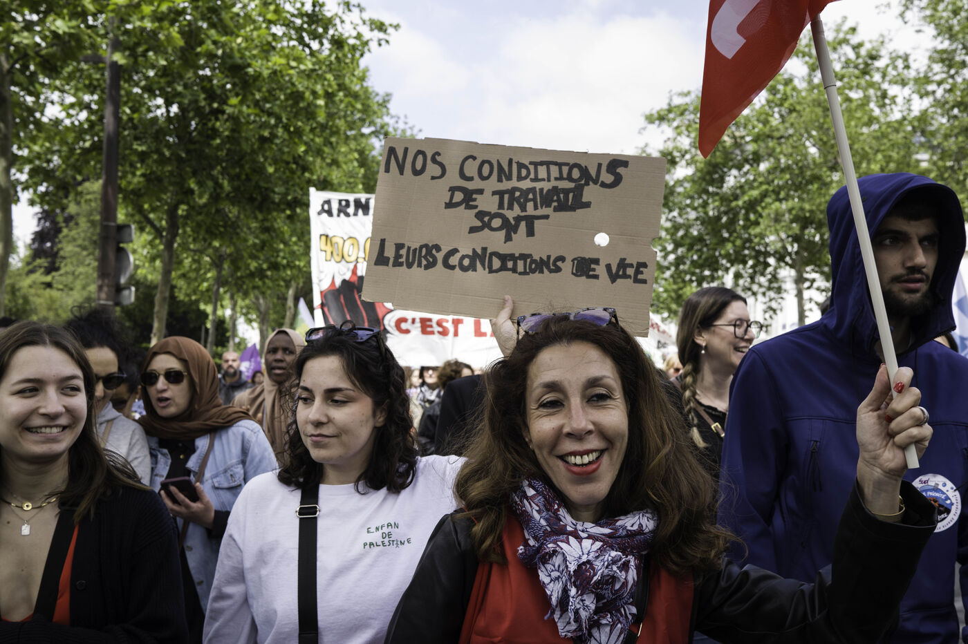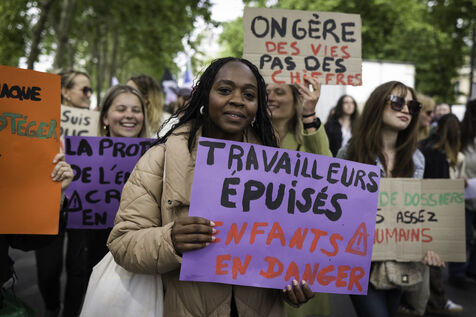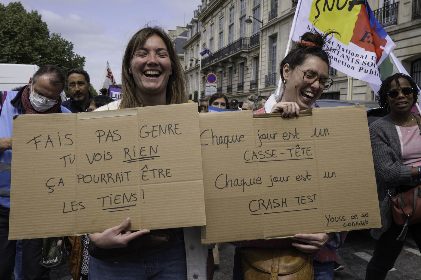 e jeune femme porte une pancarte avec le texte «Moins d’écoles, plus de galères, c’est ça la France Solidaire». Les travailleurs du secteur social et médico- social appellent à une gréve pour une hausse des salaires, de meilleurs conditions de travail et une meilleur valorisations des diplômes et des formations. Une manifestation au depart de l’Esplanade des Invalides doit se diriger vers l’ETSUP au pied de la tour Montparnasse.