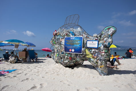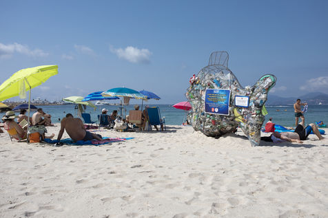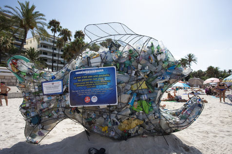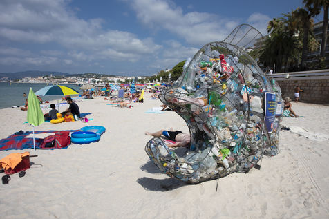 Educational fish installed on a public beach on the Croisette. This metallic fish is filled with 2.5 m3 of waste found during a sea bed clean-up operation on the beaches of the Cannes coastline. It allows to call the swimmers on the necessity not to take the sea for a dustbin.