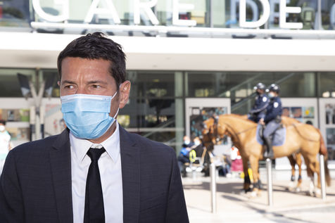 The Mayor (LR) of Cannes David Lisnard presents the installation of an emergency call button in the public space, in front of the station, to protect the population and visitors. These alarm buttons are directly linked to the Urban Protection Center and complete the Communal Plan for the Prevention of Terrorist Risks.