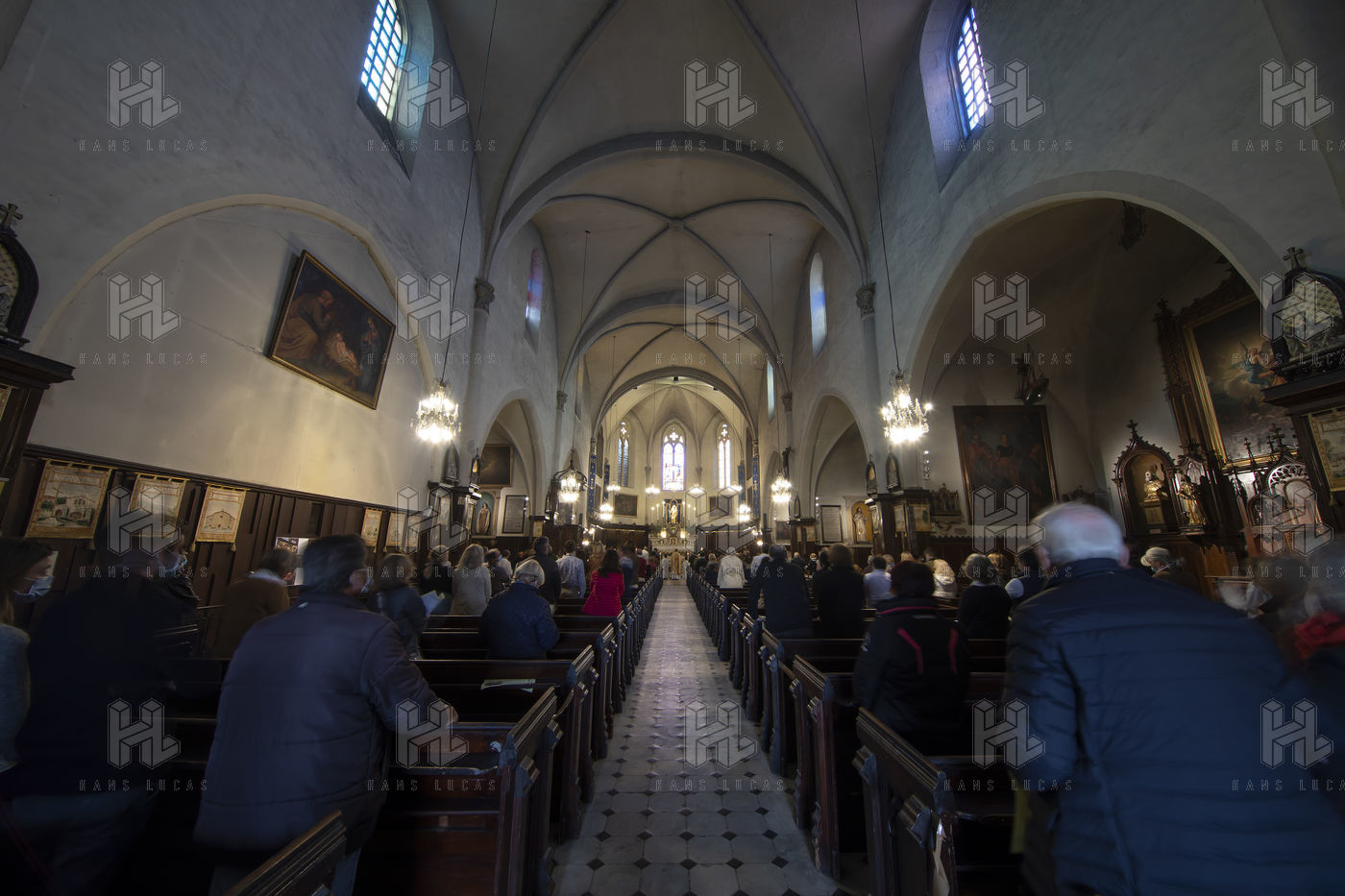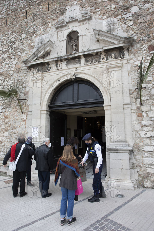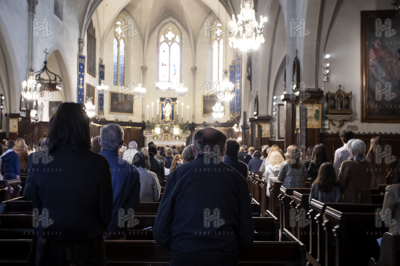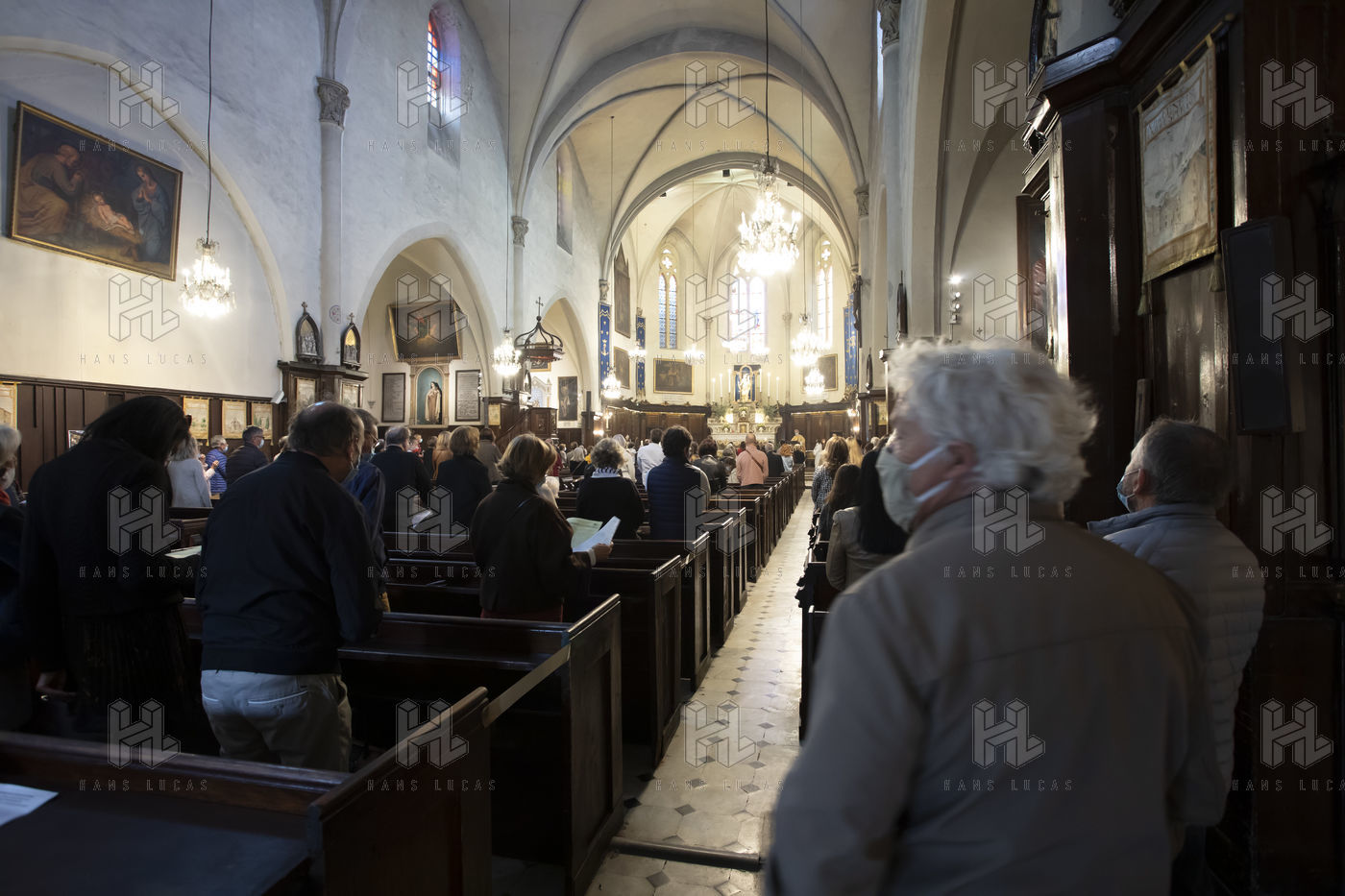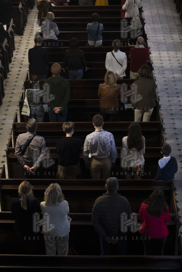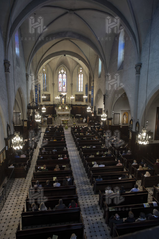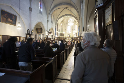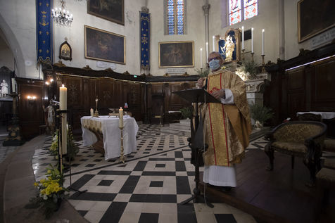 Les croyants assistent à la messe de Paques dans l église Notre Dame d Esperance pendant la crise sanitaire du coronavirus (COVID-19). Un banc sur deux est interdit d'accès pour que les fidèles respectent la distanciation sociale.