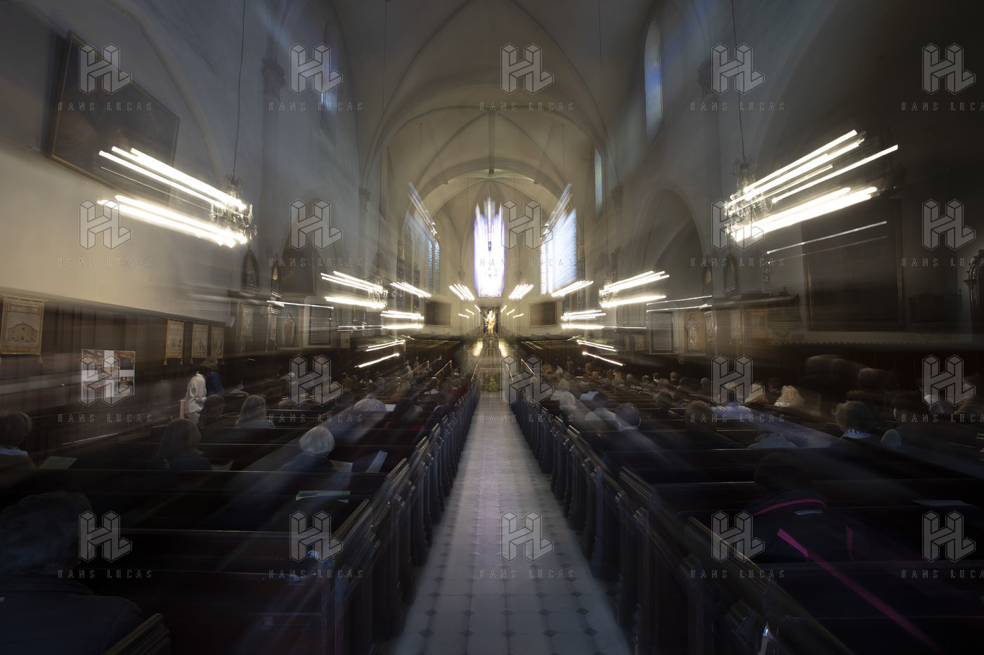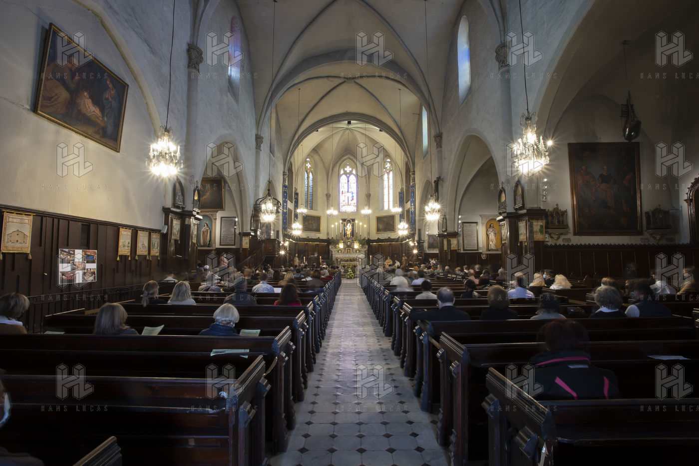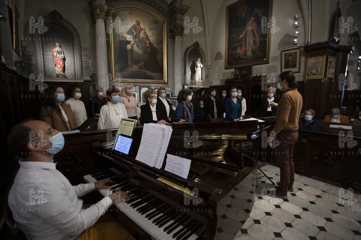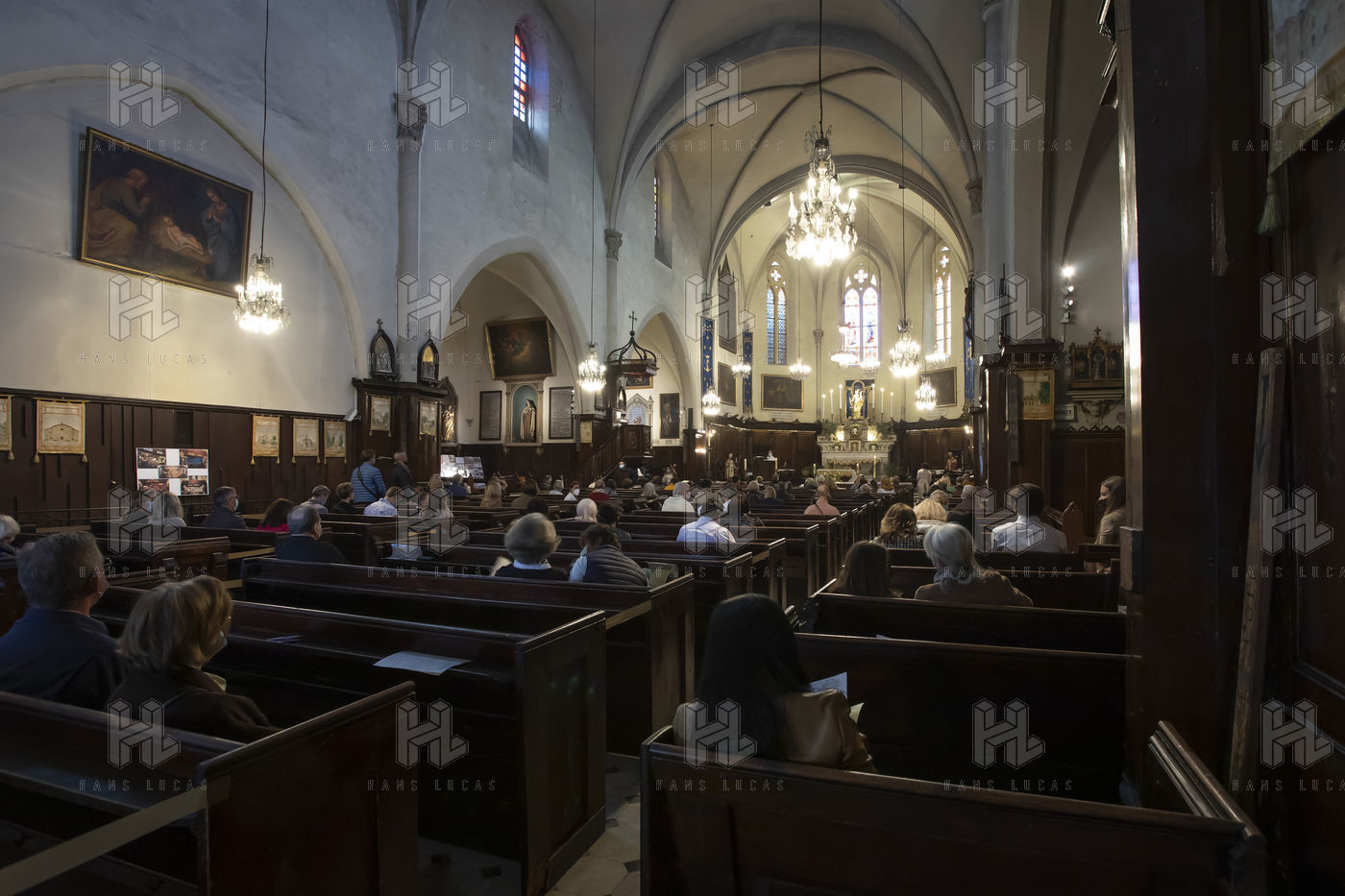 Les croyants assistent à la messe de Paques dans l église Notre Dame d Esperance pendant la crise sanitaire du coronavirus (COVID-19). Un banc sur deux est interdit d'accès pour que les fidèles respectent la distanciation sociale.