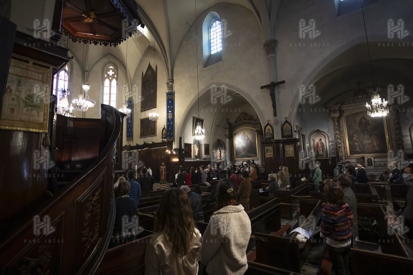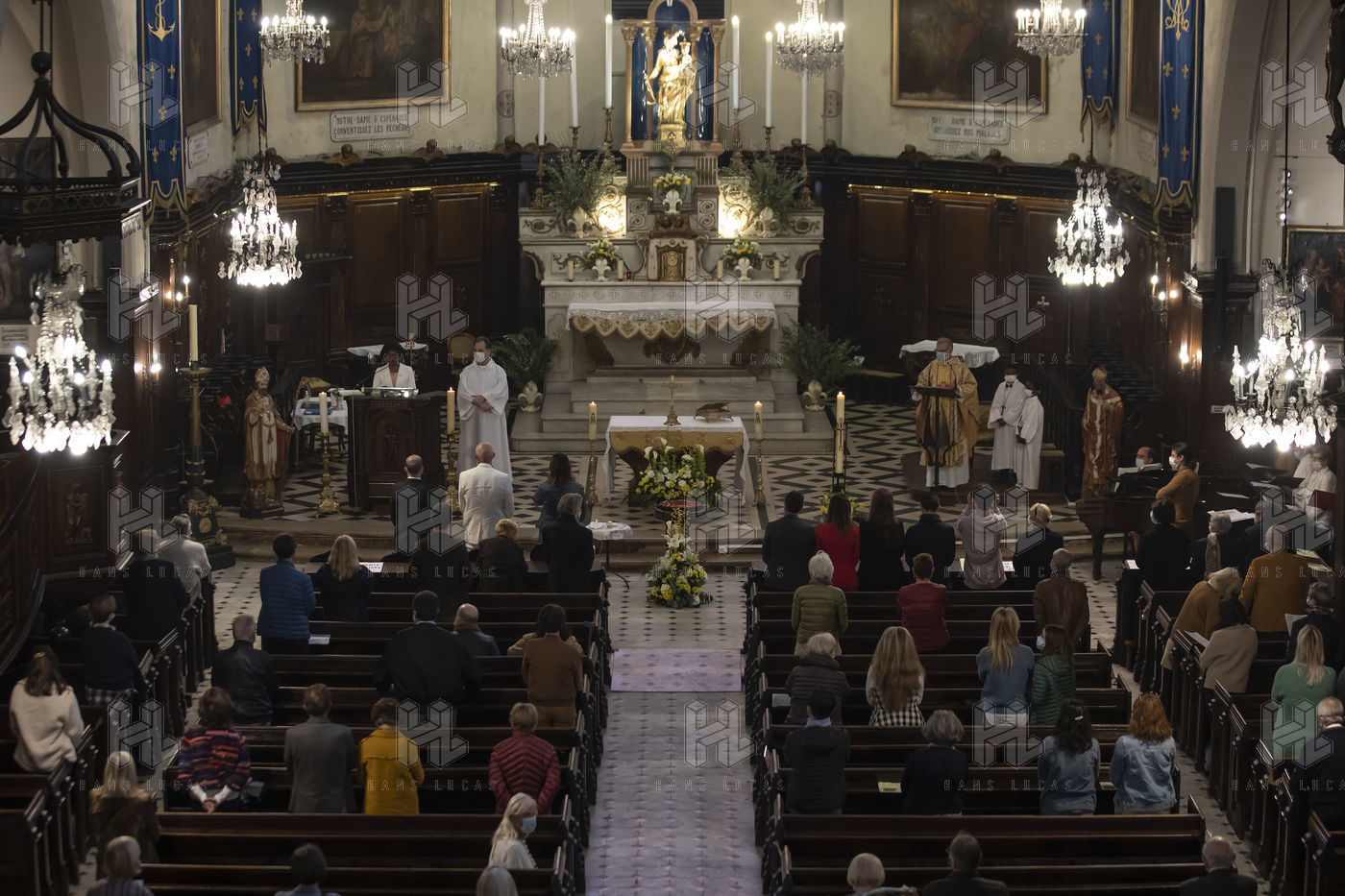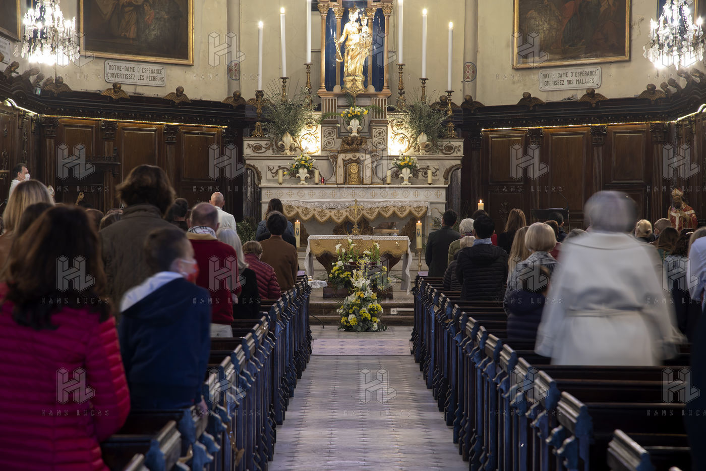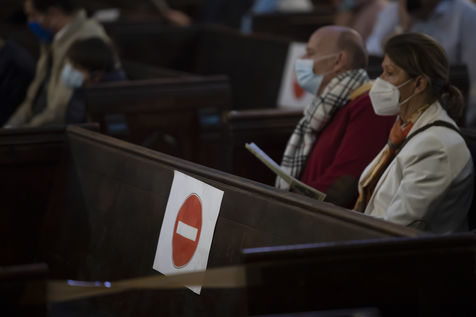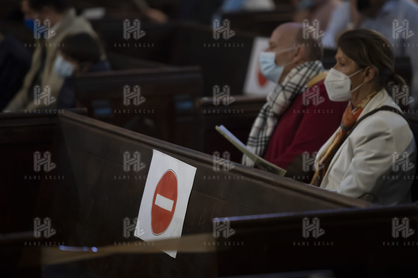 Believers attend Easter Mass in Notre Dame d'Esperance Church during the coronavirus (COVID-19) health crisis. One in two benches is forbidden to access so that the faithful respect social distancing.