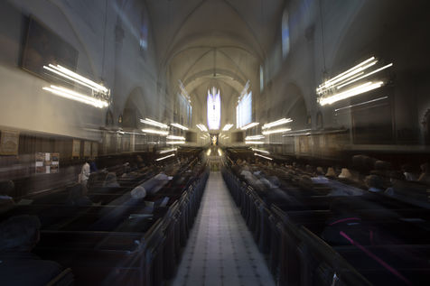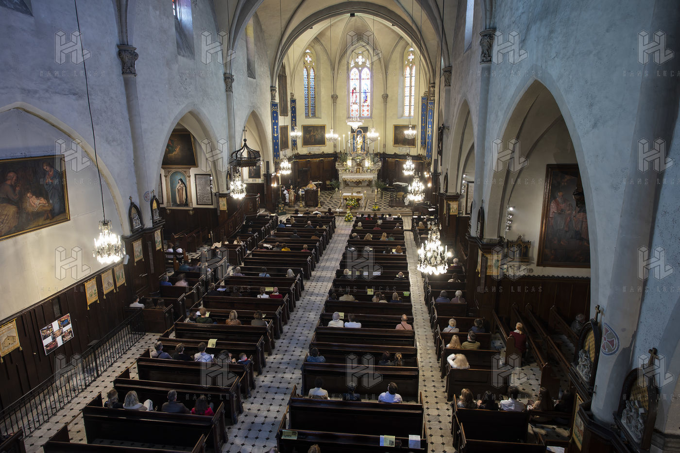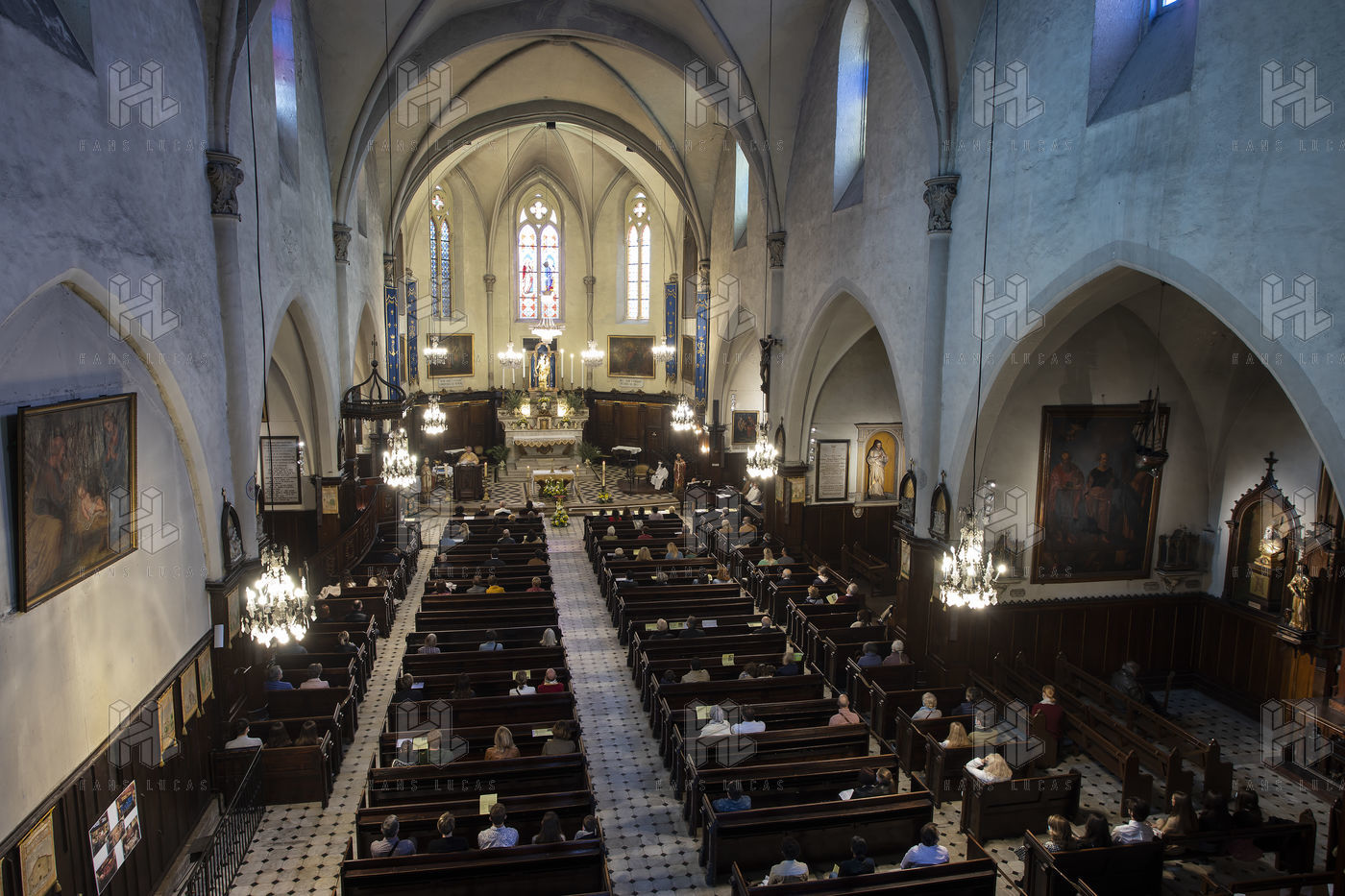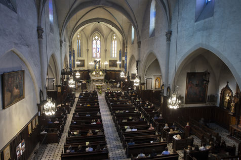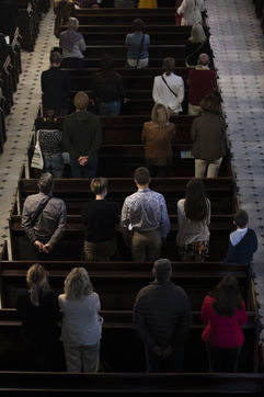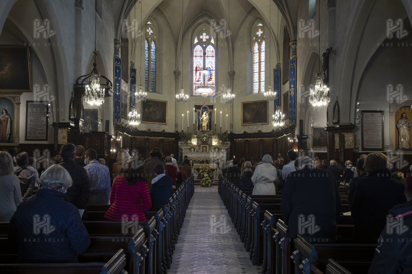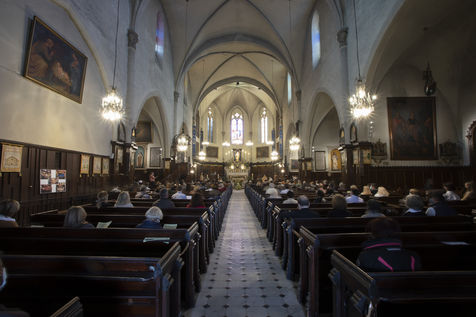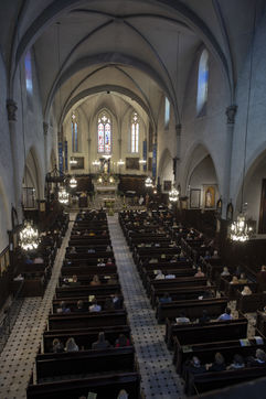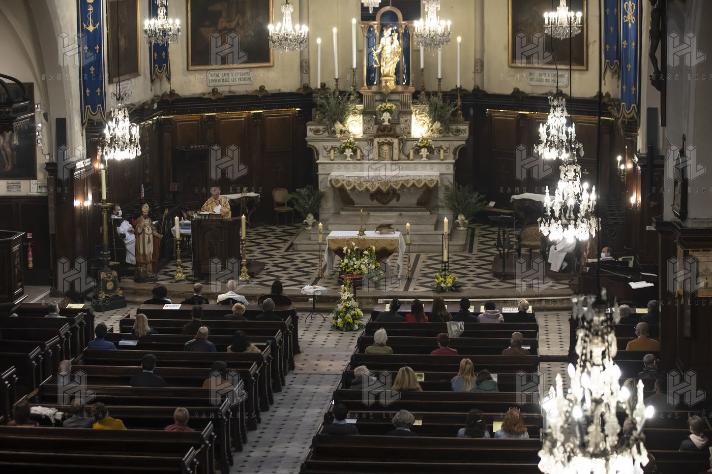 Believers attend Easter Mass in Notre Dame d'Esperance Church during the coronavirus (COVID-19) health crisis. One in two benches is forbidden to access so that the faithful respect social distancing.