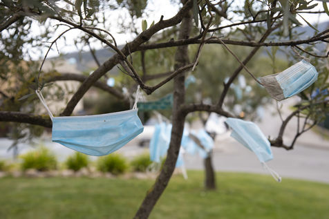 Des masques de protection facial ramassés par des citoyens dans les rues sont accrochés aux arbres d un rond point pour sensibiliser les gens sur la polution urbaine.