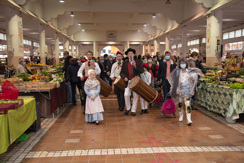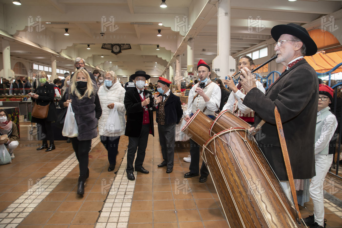 Vue du marché Forville pendant la crise sanitaire. Un groupe folklorique joue de la musique provençal dans les allées du marché.