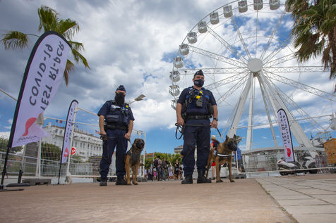Presentation of dogs trained in the detection of Covid-19 during major events. An unprecedented device from the Cannes town hall as part of the Comete project to fight against the spread of the coronavirus.
