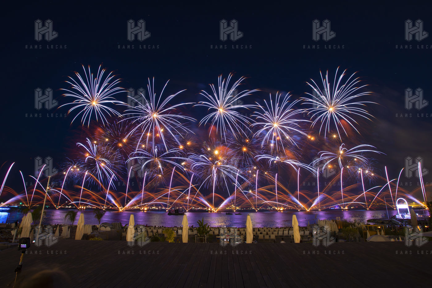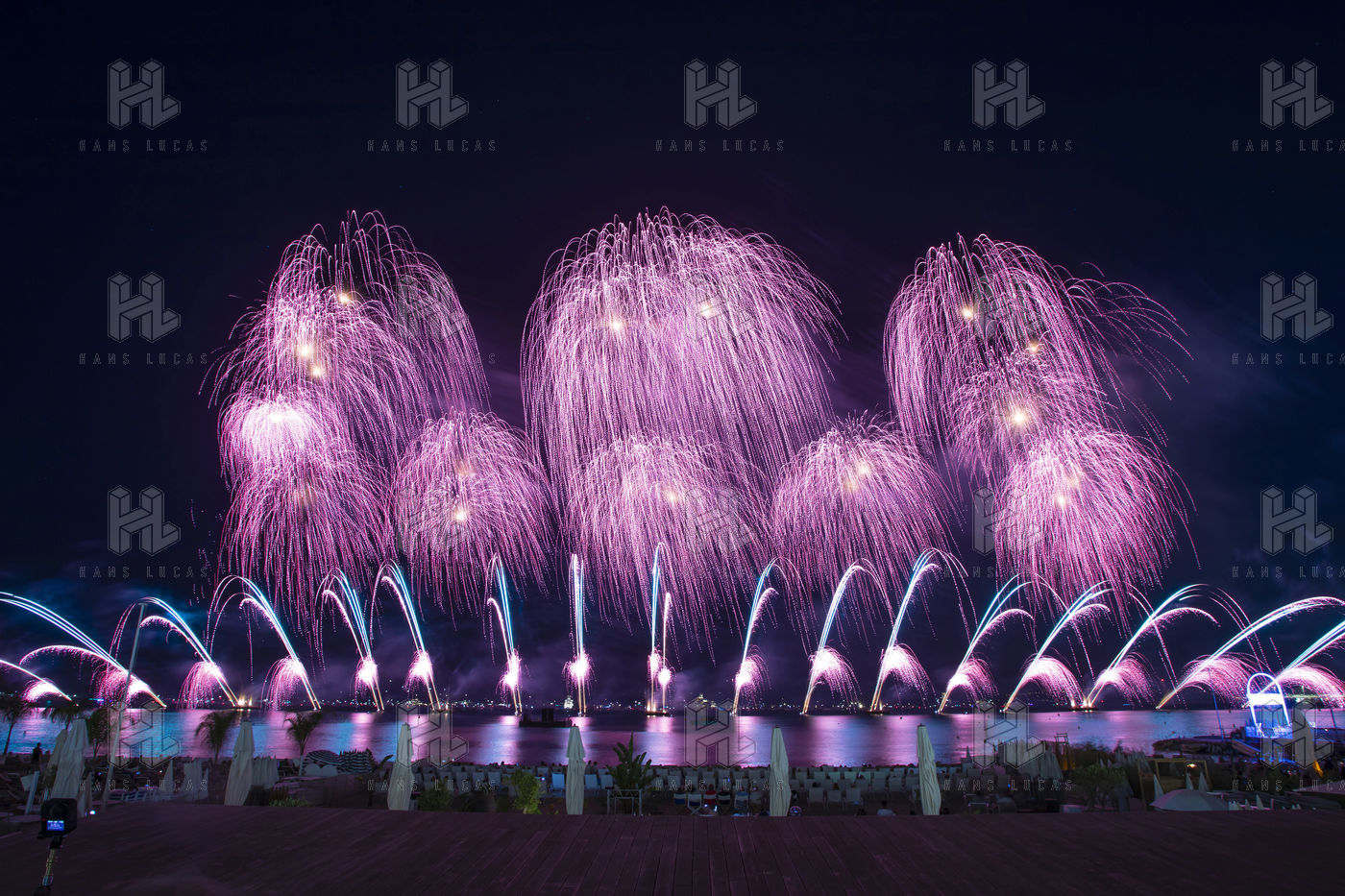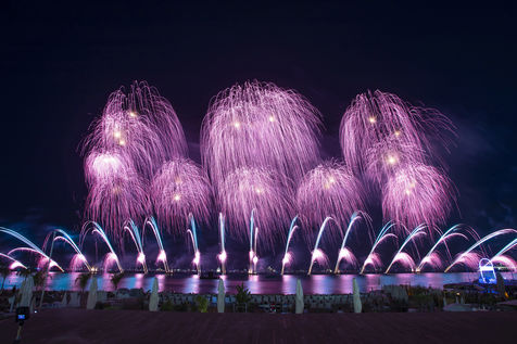 A fireworks display by Groupe F (France) called Red Carpet lights up the sky over the Croisette at the opening of the Pyrotechnic Art Festival.