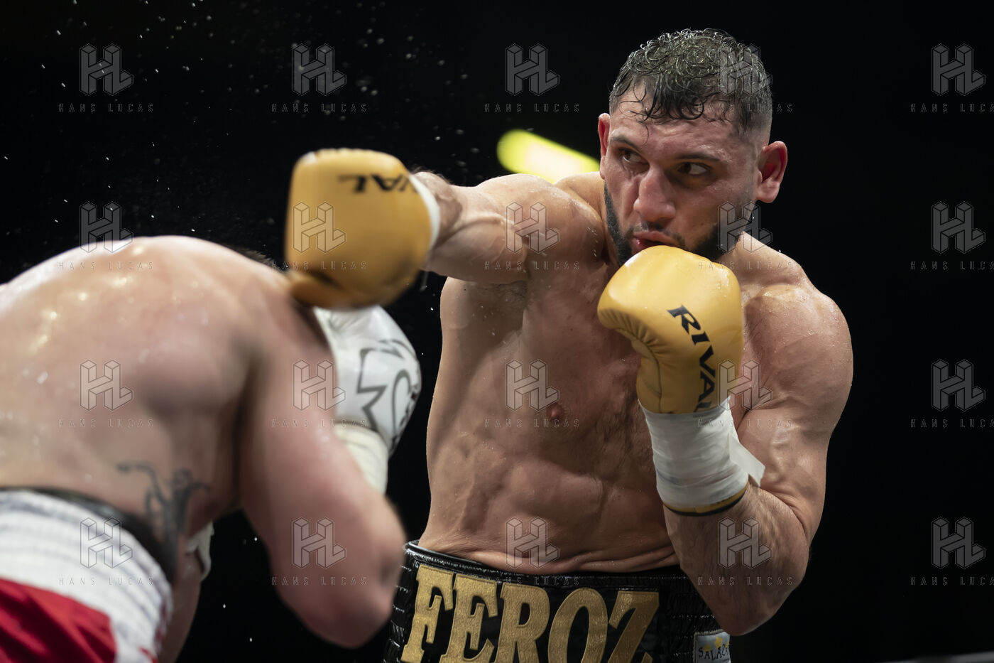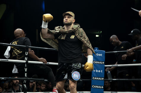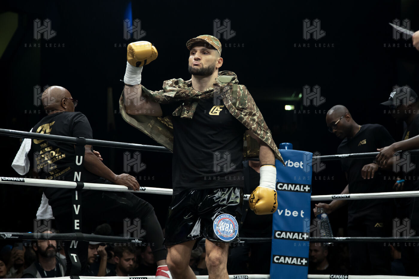 Le champion du monde français d origine armenienne Arsen Goulamirian affronte le boxeur russe Alexei Egorov lors du championnat du monde WBA des lourds-légers.