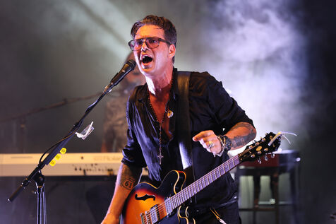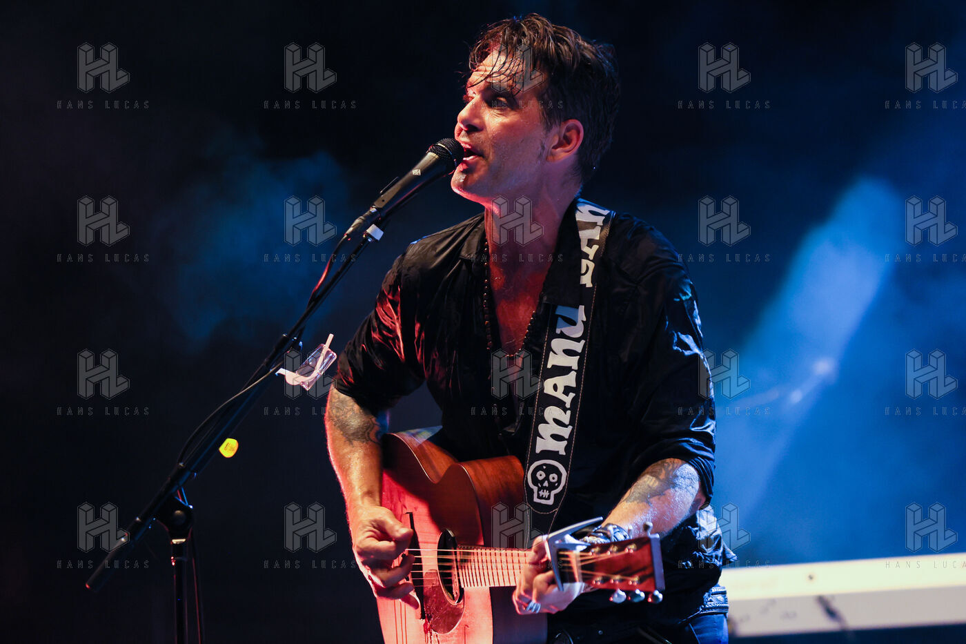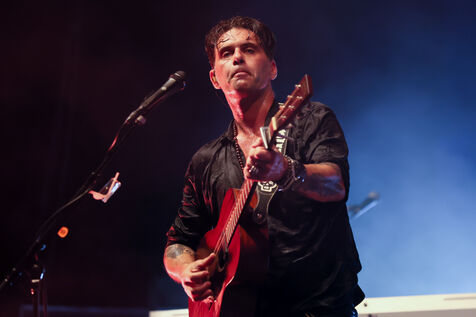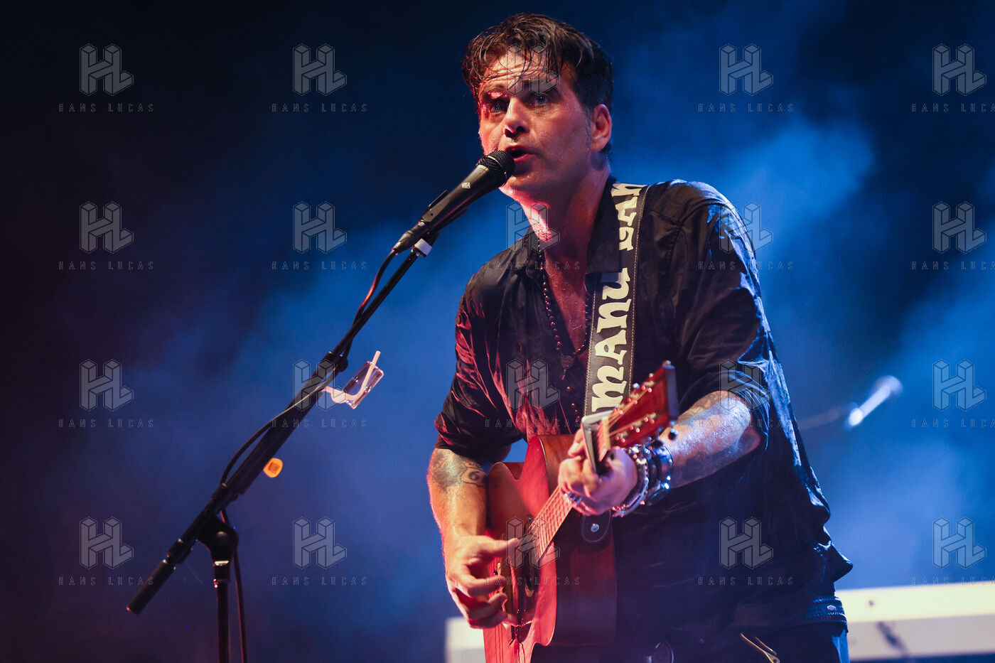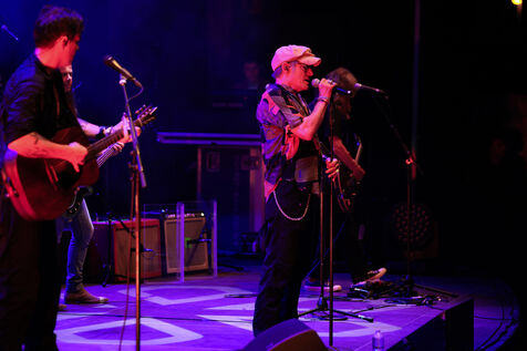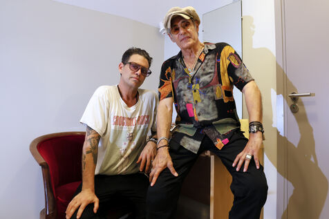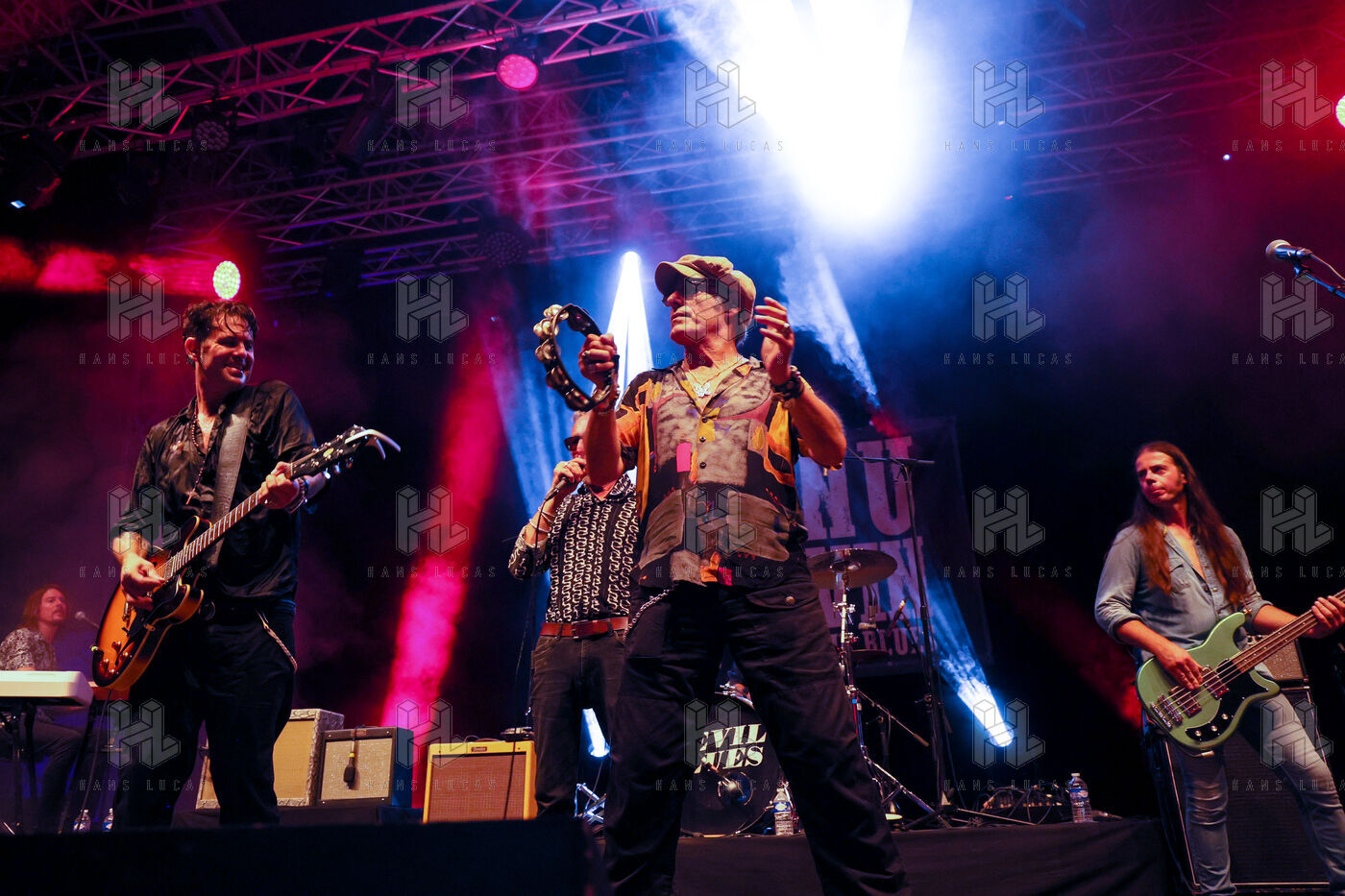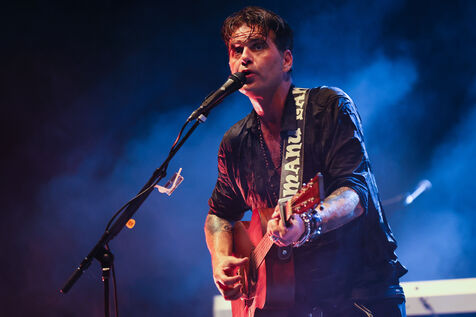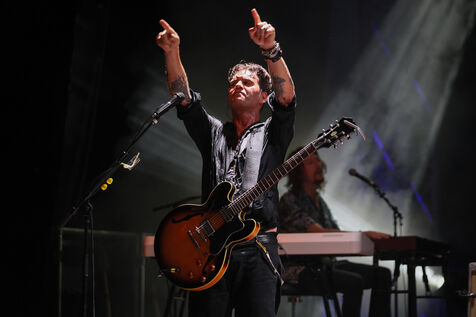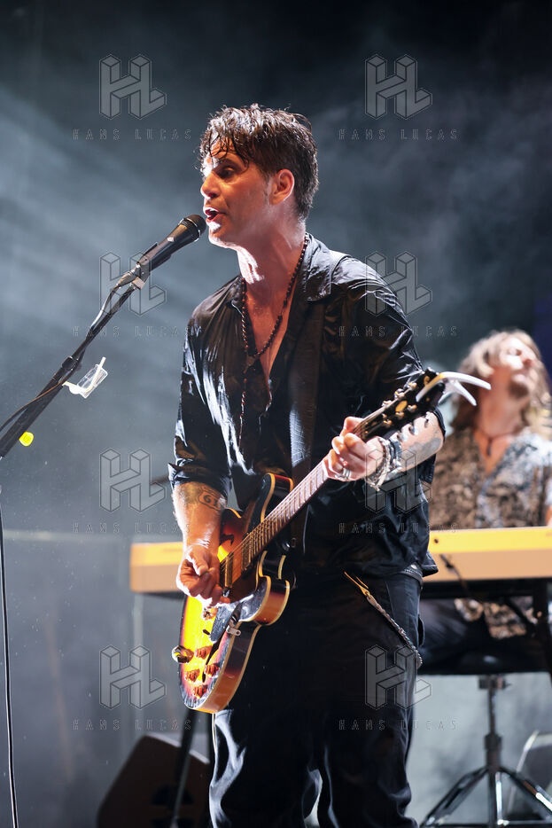 Singer guitarist and composer Manu Lanvin performs on stage at the Robinson Theatre, accompanied by the group The Devil Blues and his father Gerard Lanvin.