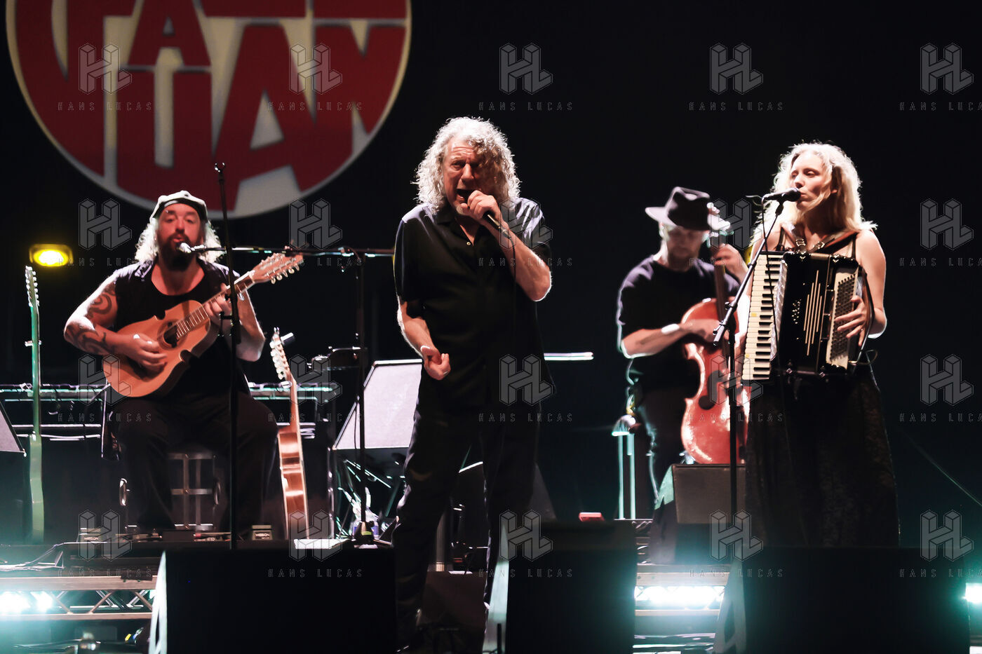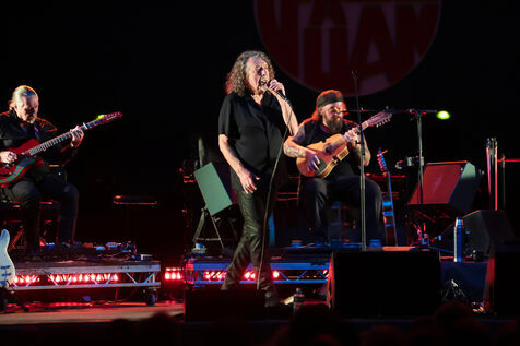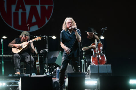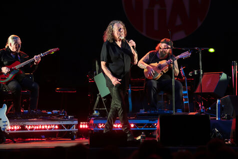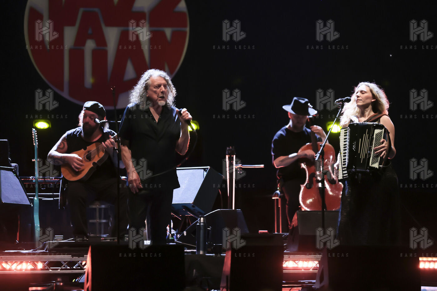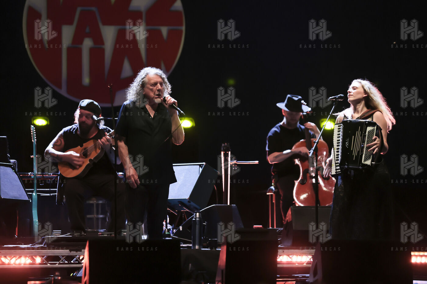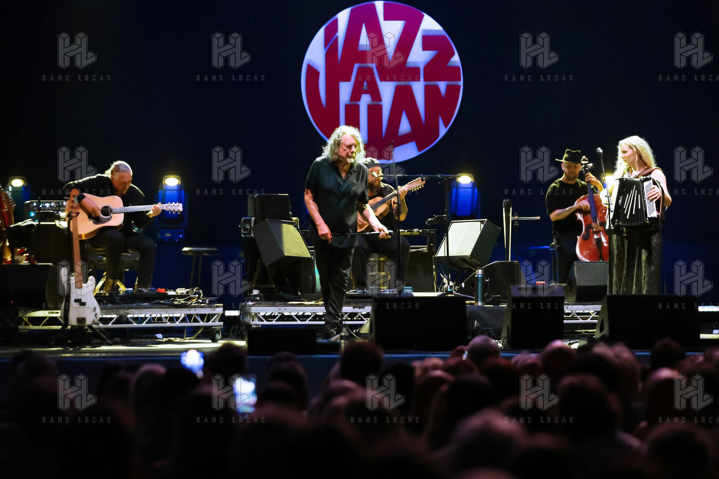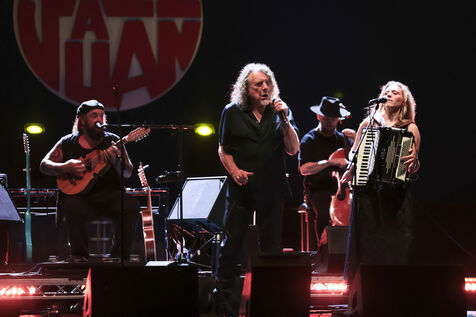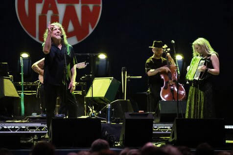 Robert Plant se produit avec son groupe Saving Grace et Suzi Dian sur la scène du festival Jazz à Juan 2025.