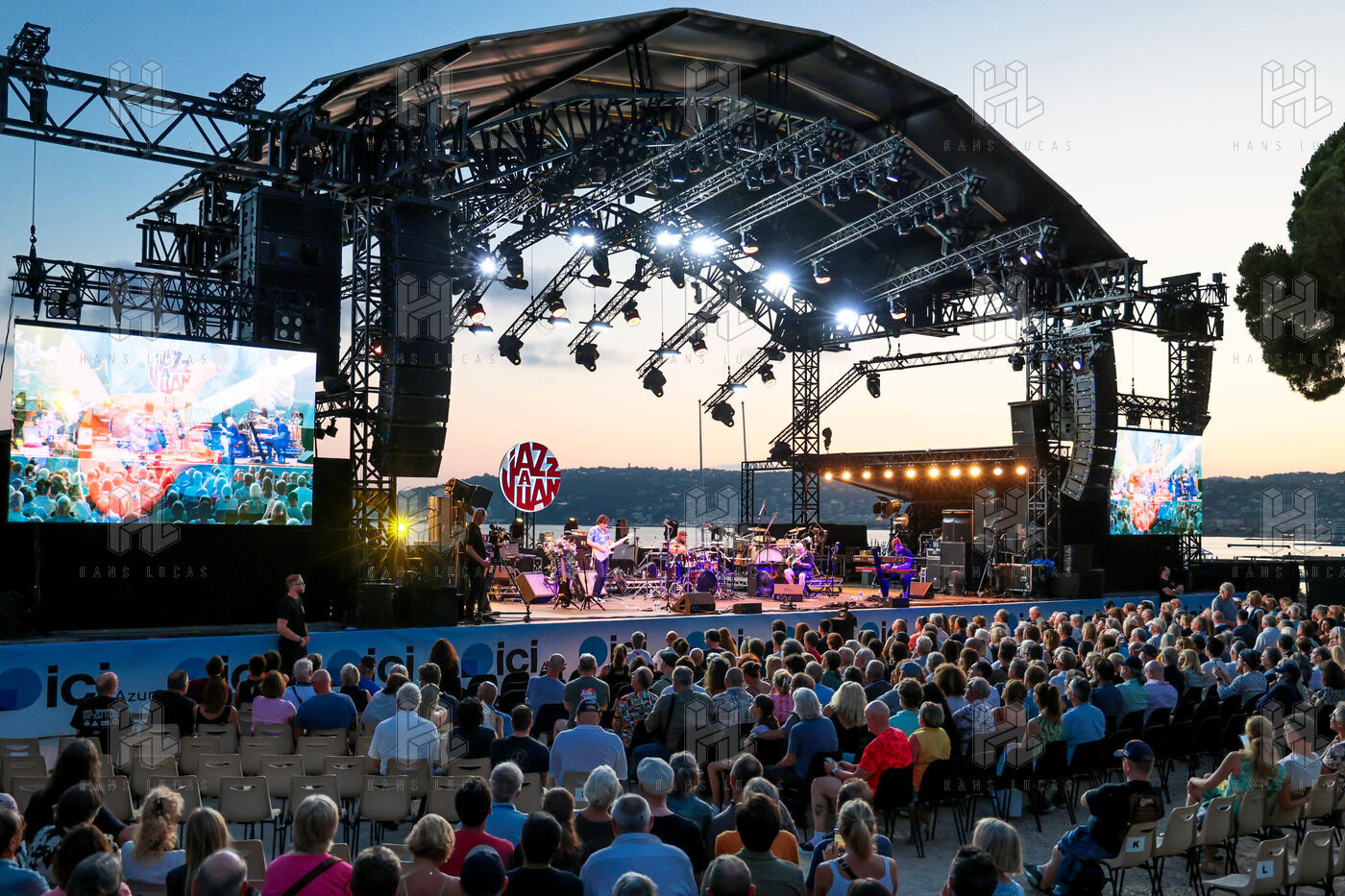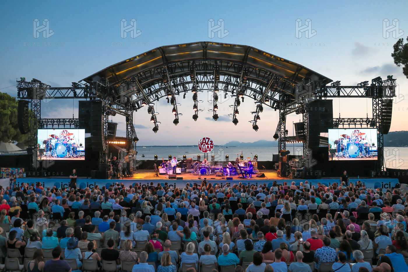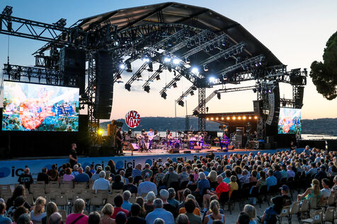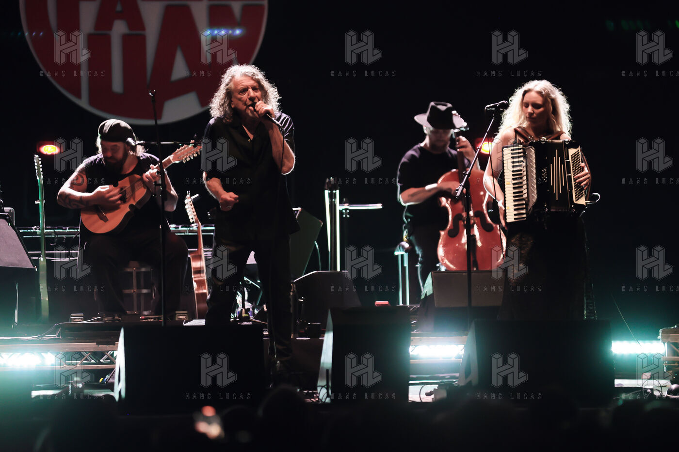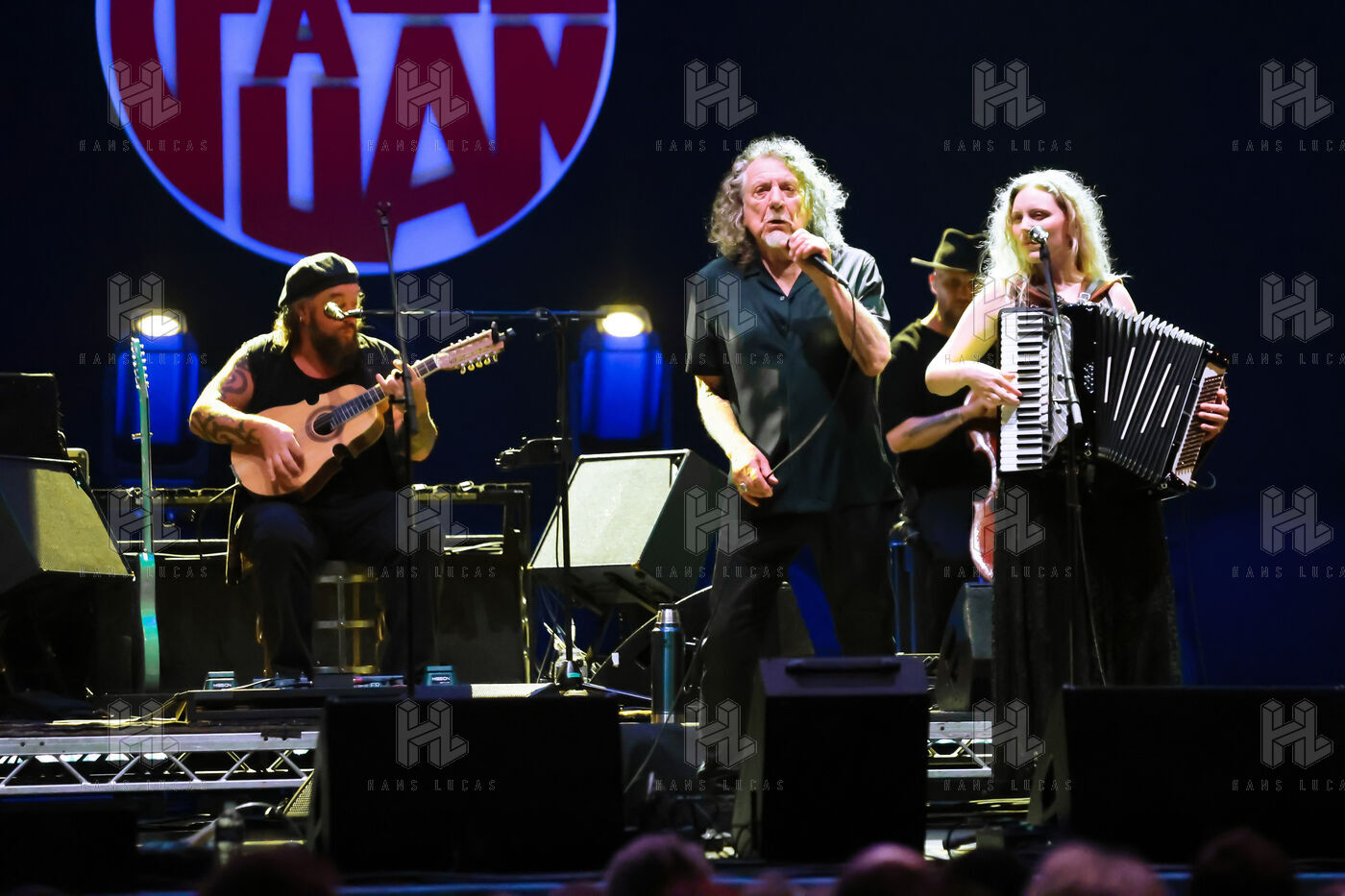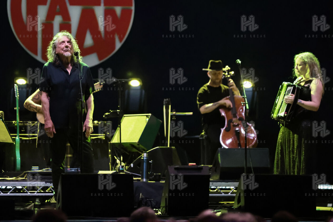 Robert Plant se produit avec son groupe Saving Grace et Suzi Dian sur la scène du festival Jazz à Juan 2025.