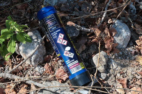 Nitrous oxide bottle abandoned in nature after being consumed.