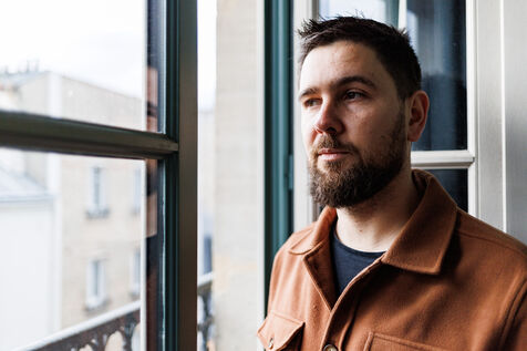 Portrait of french musician Luc Allieres in a parisian hotel. After years of playing in clubs or busking in the streets of New Orleans, Montreal and Istanbul, Luc has been back in his home village in the south of Toulouse for a few years now. With his partner Nadia, he founded the group Solak Balik ('left-handed fish' in Turkish), with whom they perform regularly in the Toulouse region and throughout France.