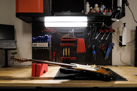 Organization, precision, patience and passion are the hallmarks of the man who designs his instruments from start to finish, from the body to the pickups, in a workshop where references to his atypical career are never far away.