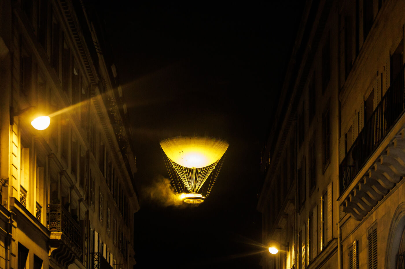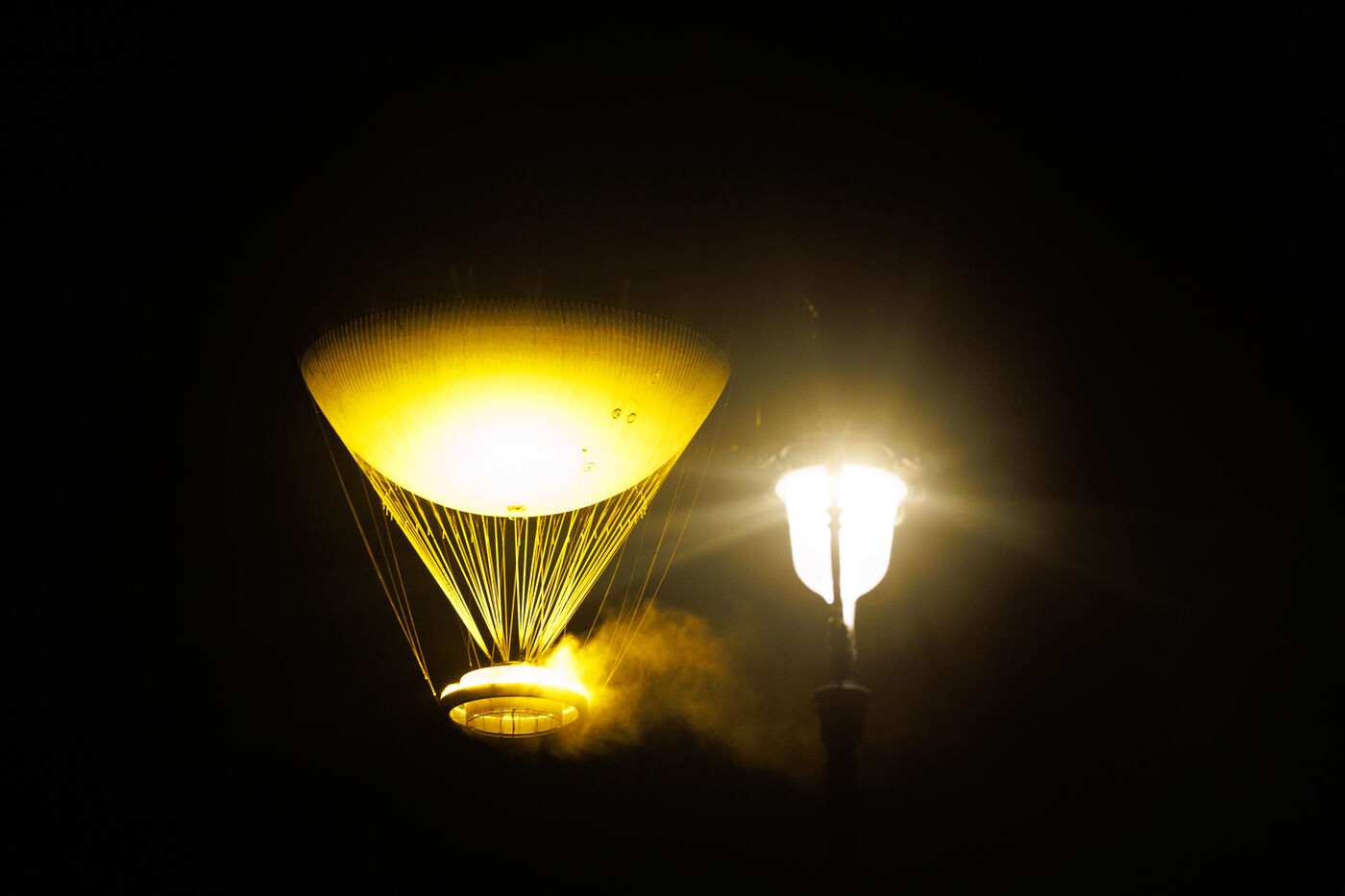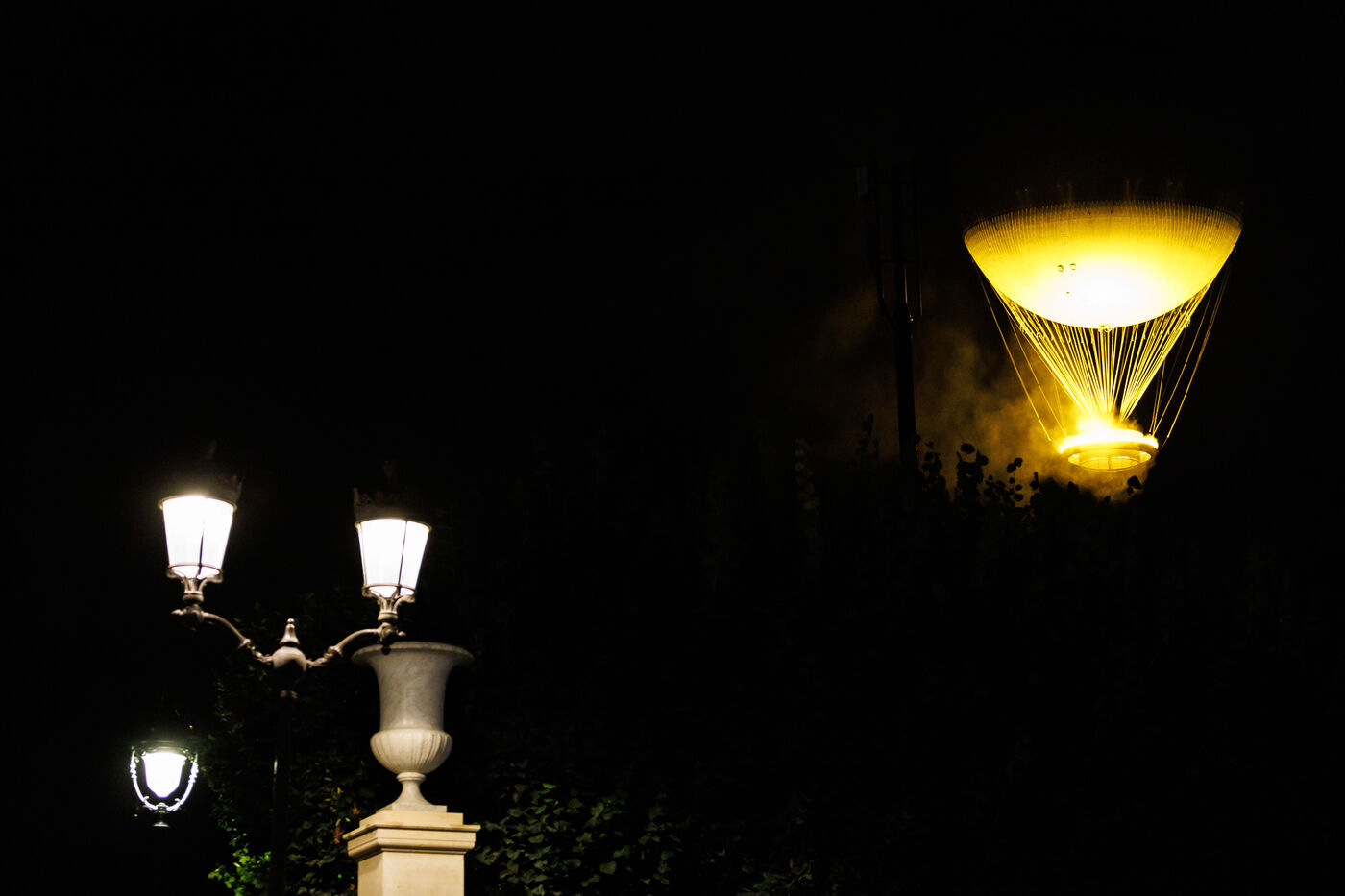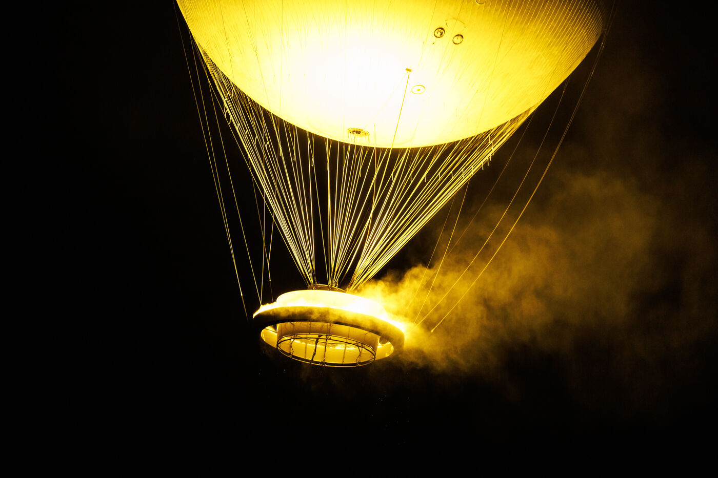 Flight of the Paris 2024 Olympic Games flame on August 3, 2024. Raised by a hot-air balloon, the flame is designed with a water vapor system and LED lights.