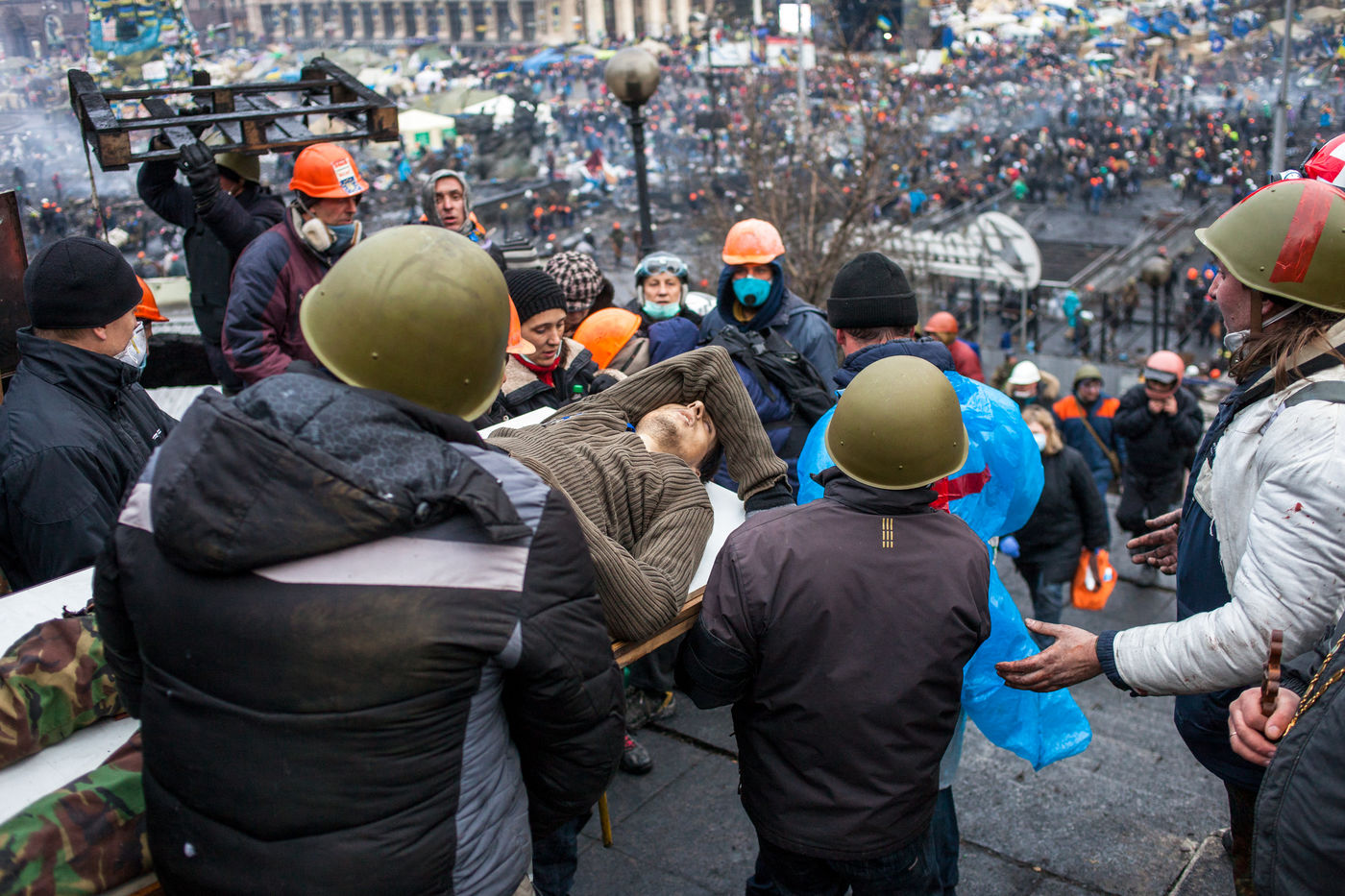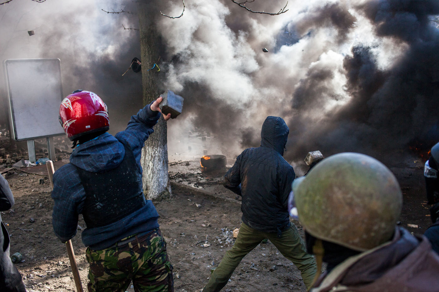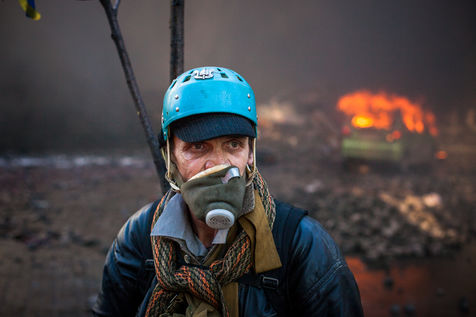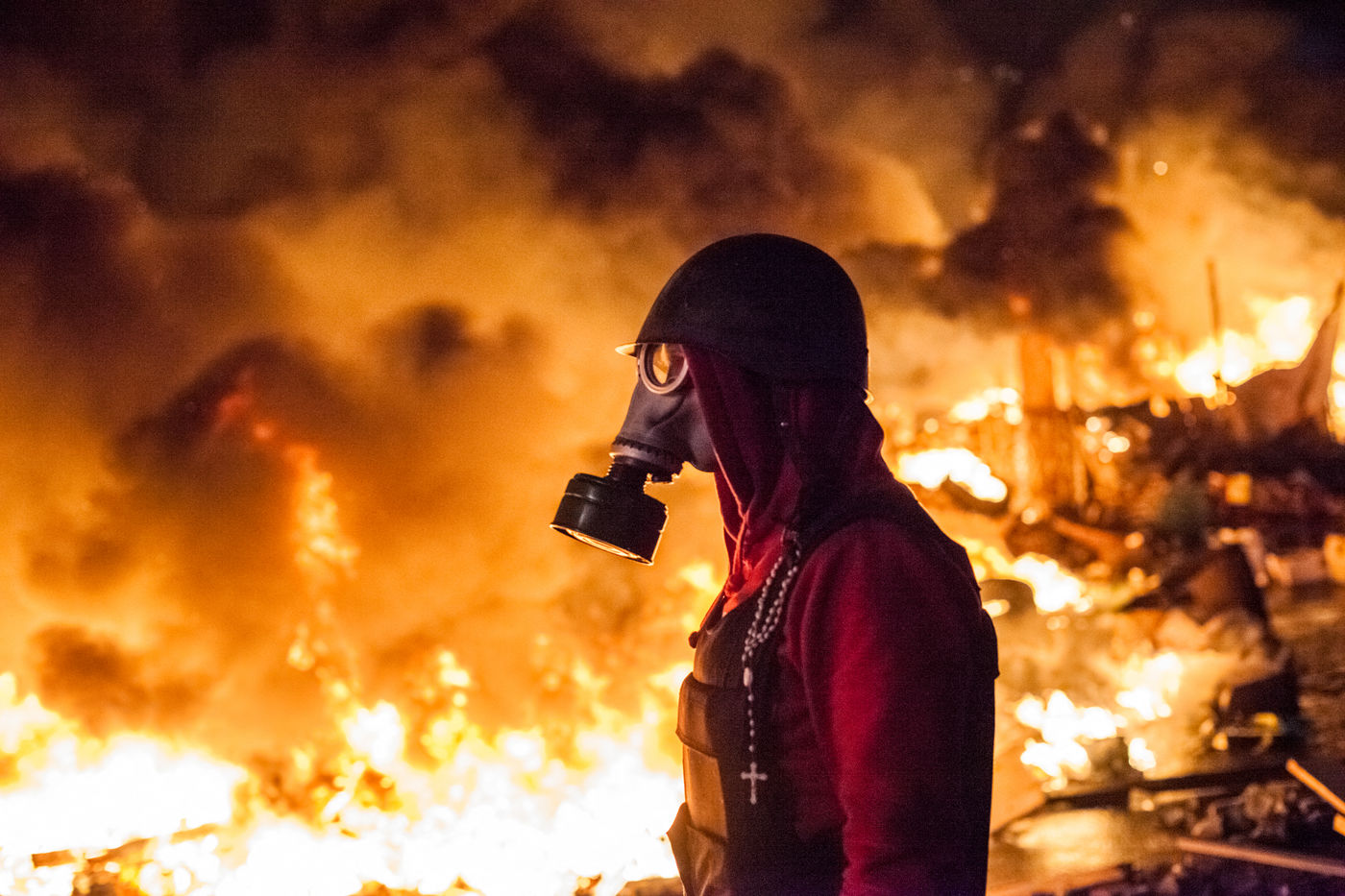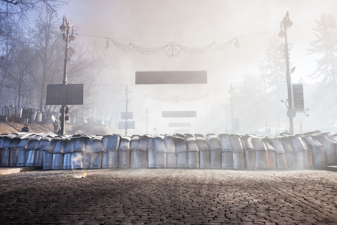 Février 2014, Kiev - Ukraine. La Place de l'indépendance à Kiev est le symbole du mouvement de contestation communément appelé « Le Maïdan ». Le 21 novembre 2013, le refus du gouvernement du président Ianoukovytch de ratifier l'accord d'association avec l'Union Européenne au profit de son voisin Russe, entraîne des manifestations de l'opposition pro-européenne sur la place de l'indépendance. Alors que l'insatisfaction gagne la population, les manifestants affluent de tout le pays. Des tentes et barricades sont installées quelques jours plus tard pour protéger les manifestants de la répression policière de plus en plus violente. Trois mois plus tard, la place ne désemplit pas alors que le rapprochement du président Ianoukovitch et de son allié russe est de plus en plus flagrant. Face aux tentatives de faire taire les manifestants par le vote de lois sanctionnant les rassemblements et les arrestations sommaires, le mouvement se renforce. Dès lors, la lutte se propage et les manifestants dénoncent maintenant leurs privations de libertés d'expression, le glissement vers la dictature et l'ingérence du pouvoir russe. Le 18 février 2014, les forces spéciales anti-émeute lancent l'assaut final sur la place où sont désormais rassemblés plus de 20 000 manifestants. Dans un dernier acte de résistance, ces derniers montent un mur de feu pour empêcher l'avancée des forces de l'ordre bien mieux équipées. Cernés de toute part, les insurgés tiendront bravement la place durant la nuit, au prix de nombreux morts et blessés. Les images suivantes couvrent la période du 18 au 22 février durant cette lutte acharnée entre la police et les manifestants. Cet événement marquera la destitution du président Ianoukovytch qui sera contraint de quitter le pays.