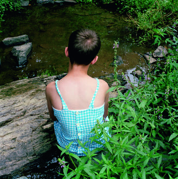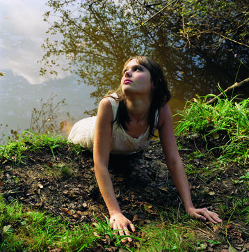 Et cette autre Narcisse en robe tout aussi blanche, les mains enfoncées dans l'humus et les lèvres peintes, entre-t-elle ou sort-elle de l'eau ? Ses yeux retournés signifient-ils qu'elle s'en tire ou qu'elle s'enfonce ? Derrière elle, un fond de branches et de nuages, jusqu'à ce que... renversement de perspective : l'oeil comprend l'effet de bascule, le décor n'est que reflet dans le fleuve.