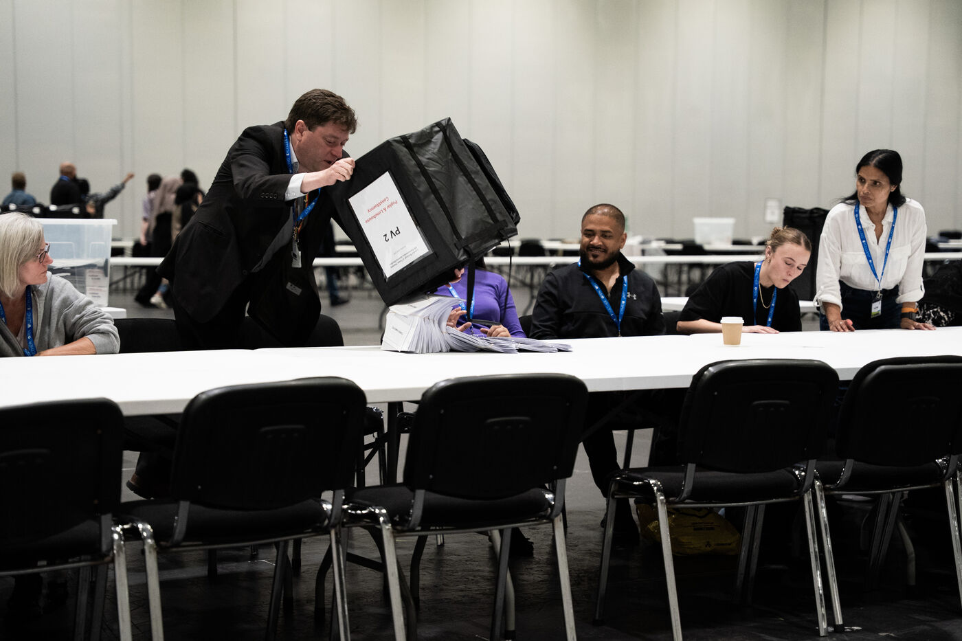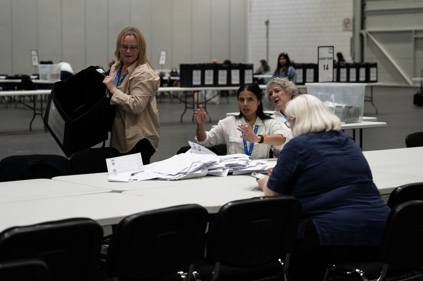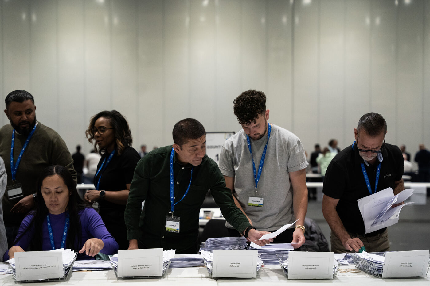 On the night of the UK general elections on 4 July 2024, I documented the vote count for the borough of Tower Hamlets at the ExCeL Centre in London. Normally hidden from public view, this behind-the-scenes process revealed both the logistical complexity and the emotional intensity of an election night. From the arrival of ballot bags to the official announcements, the space filled with staff, party members, journalists and candidates — all navigating anticipation, fatigue, and tension. This series offers a visual record of that long night, where democracy is measured one paper at a time.