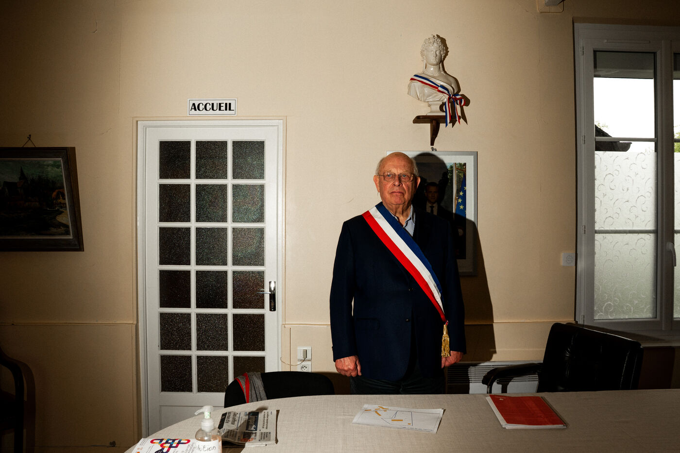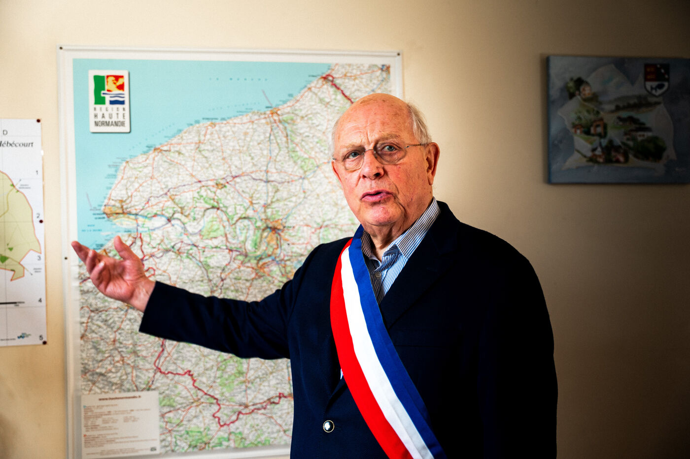 Portrait of François Letierce, mayor of Hébécourt (Somme), a rural village of 650 inhabitants, photographed inside the town hall on 23 April 2025. At 79, this entrepreneur and farmer, also involved in private education and managing a local water syndicate, is completing his fourth term. “I see it as a mission. You can’t just go to mass and not act.” After 43 years of municipal service, he is preparing to hand over: “You have to know when to step aside.”