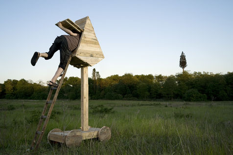 The idea behind this project grew out of the fact that a mobile phone relay antenna has been built about 20m from my apartment window. Although I am more than concerned about this infringement on my surroundings, I couldn?t quite find the necessary impetus to join in the local protests; making banners, signing petitions, meeting MPs etc. The phone company played deaf. I was however strongly motivated to produce a series of photographs on this new form of pollution, microwave transmission. When I found out about relay antennas disguised as trees I found the energy to fight. The physical relationship to my subject was obvious from the first photographs I took. I found myself following in the footsteps of Don Quichotte, playing a fantasy figure ready to fight and I wanted to follow his madness and bravery, navigating between something imaginary and a statement of protest.