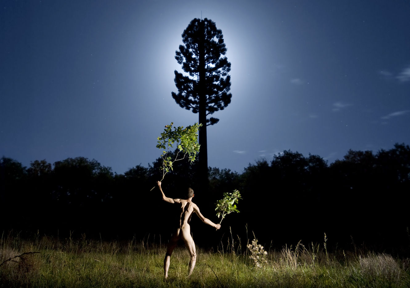 A l'origine de ce projet il y a une antenne relais de téléphonie mobile installée à une vingtaine de mètres des fenêtres de mon appartement. Bien que particulièrement soucieux de cette atteinte à mon cadre de vie, je n'arrivais que peu à mobiliser les forces nécessaires pour me joindre à la contestation des riverains; fabrication de banderoles, collecte de signatures, rencontre des élus... L'opérateur, lui, faisant la sourde oreille. J'étais cependant fortement décider à entreprendre un travail photographique sur cette nouvelle pollution, les micro-ondes pulsées. C'est en découvrant l'existence de pylônes camouflés en arbre que j'ai retrouvé l'énergie du combat. Cette relation physique au sujet s'est imposée d'elle-même lors des premières prises de vues. Me trouvant ainsi sur les pas de Don Quichotte, incarnant un personnage fantasque et va-t-en-guerre, j'ai voulu le suivre dans sa folie et son courage, naviguant entre l'imaginaire et un propos revendicatif.