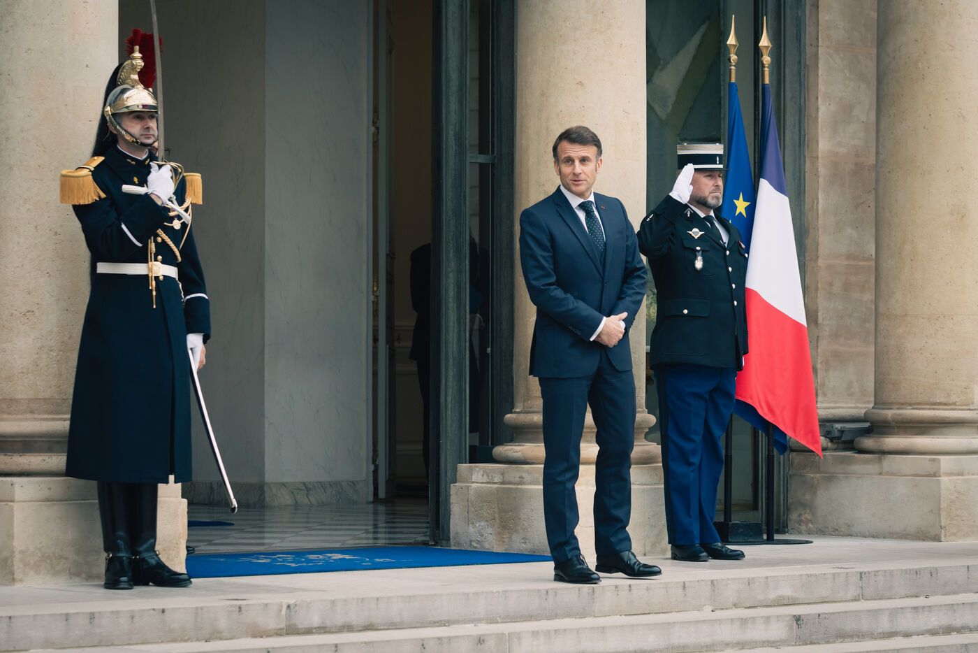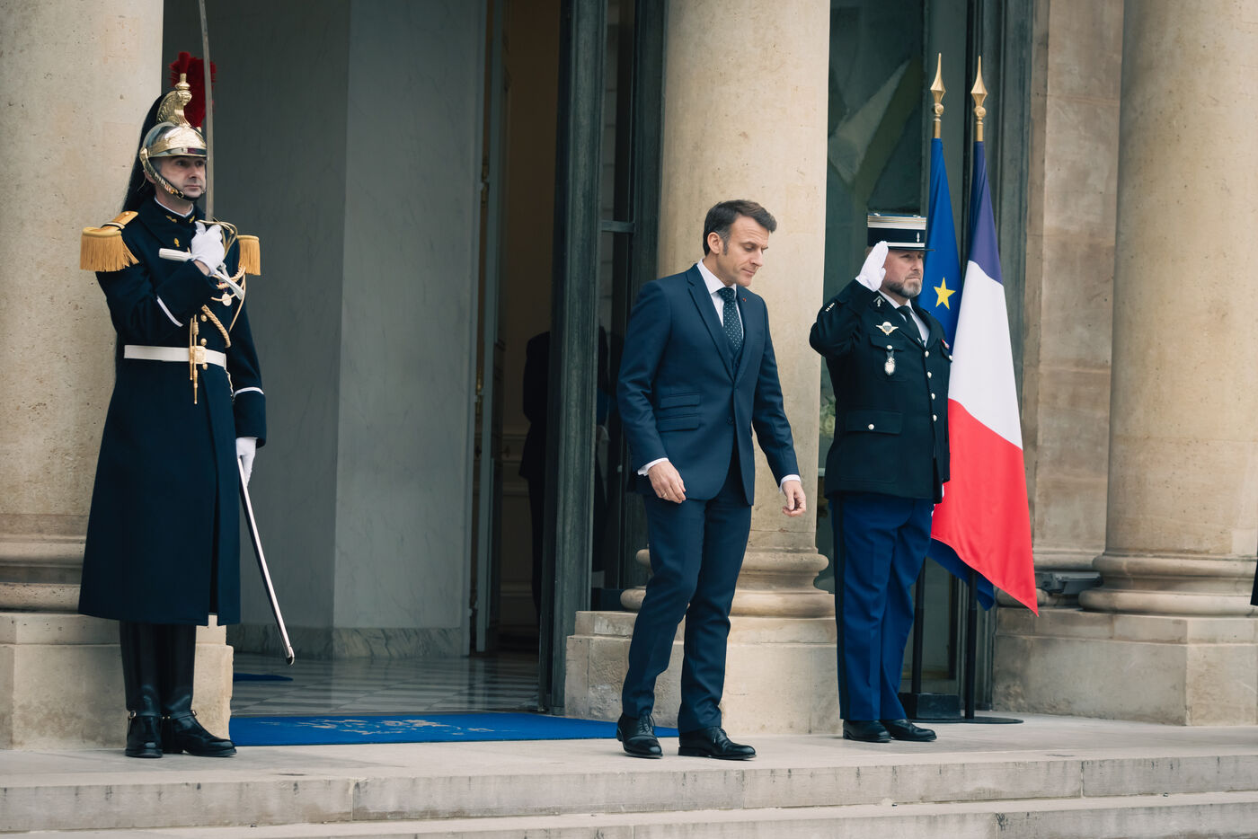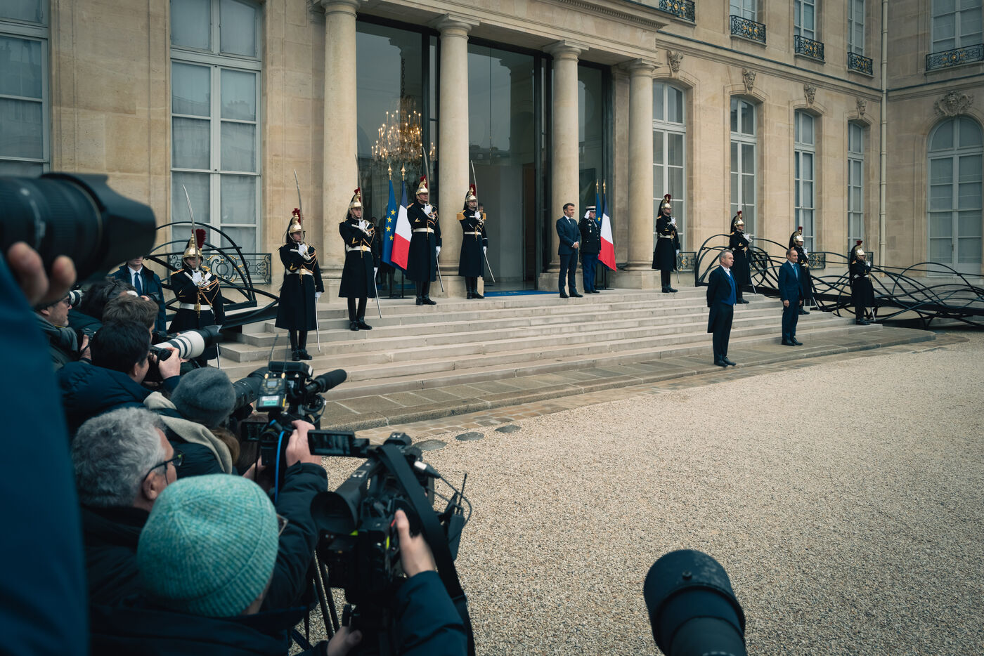 Le président français Emmanuel Macron accueille le chancelier allemand Olaf Scholz à l'Élysée le 22 janvier 2025, à l'occasion d'un déjeuner de travail visant à renforcer la coopération franco-allemande et à promouvoir une Europe forte et unie face aux défis mondiaux.