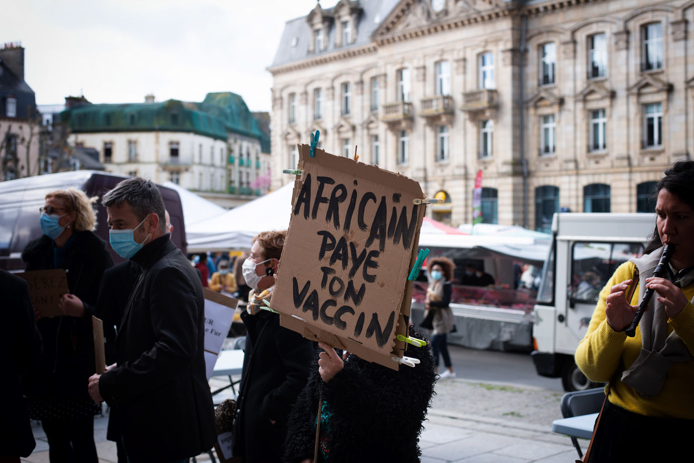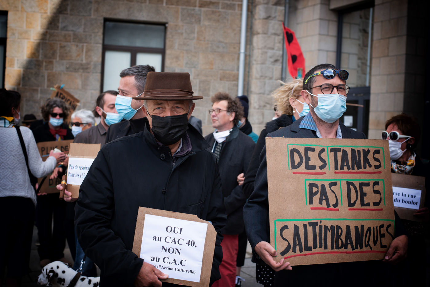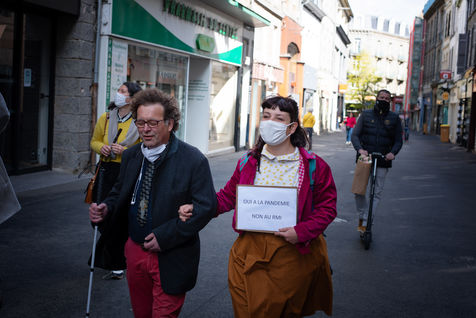 Market day in Saint-Brieuc, May 2021: occupants, actors, technicians, musicians etc... engage a strange procession with provocative slogans. This "fake right-wing demonstration" denounces the actions or positions considered as deleterious, towards the unemployed and more widely the precarious. This action is part of the movement of occupation of theaters, places of convergence of struggles, where intermittent entertainment, technicians, musicians, and other "precarious" resist the announced reform of unemployment insurance, which were to enter into force on 1 July 2021.