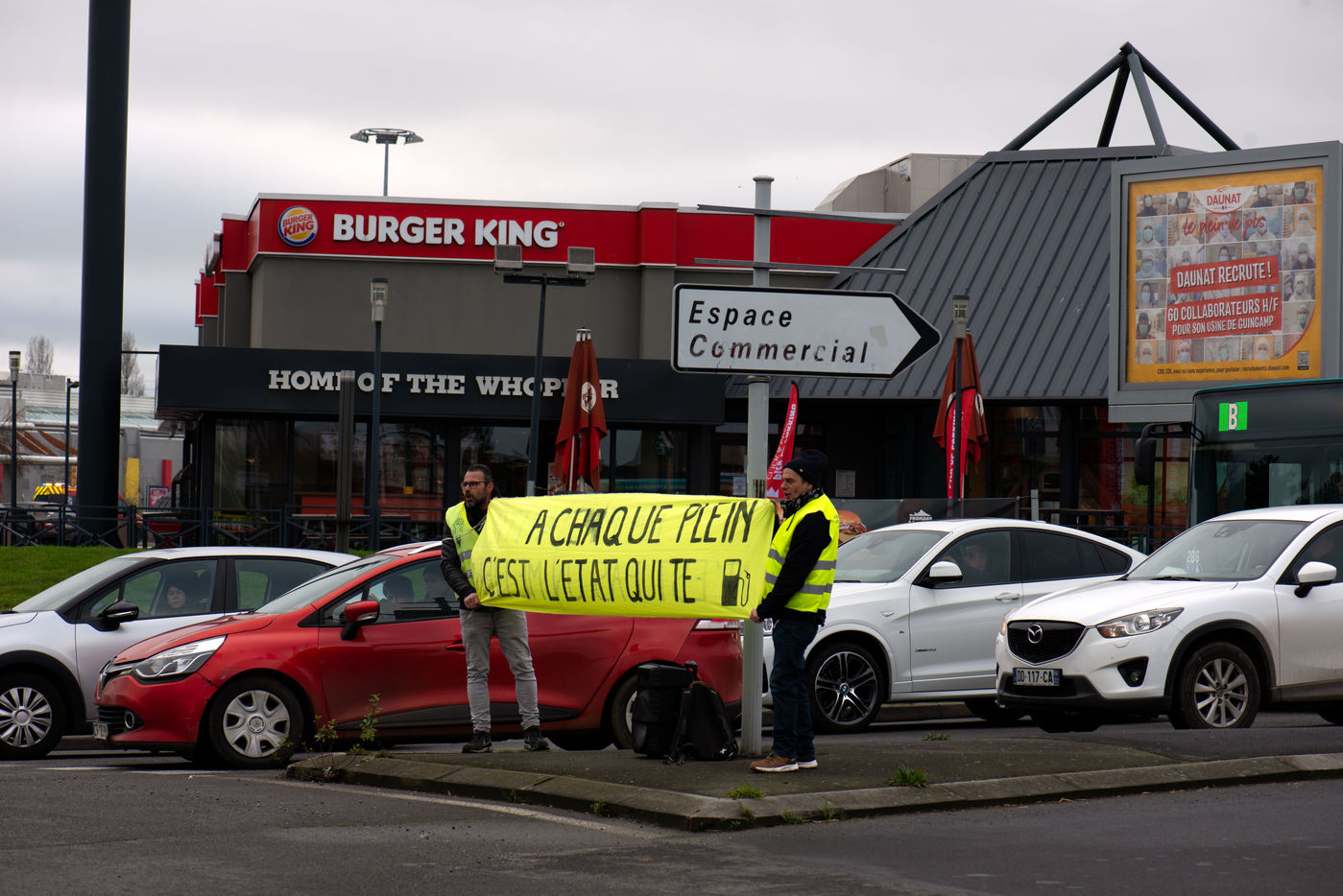 Action de quelques gilets jaunes sur une rond-point de Saint-Brieuc, contre la hausse des prix du carburant.