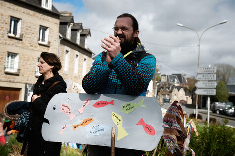 Carnaval évoquant les luttes locales : éoliennes offshore, usine à saumons, algues vertes ... mais aussi les méga-bassines de Sainte Soline.