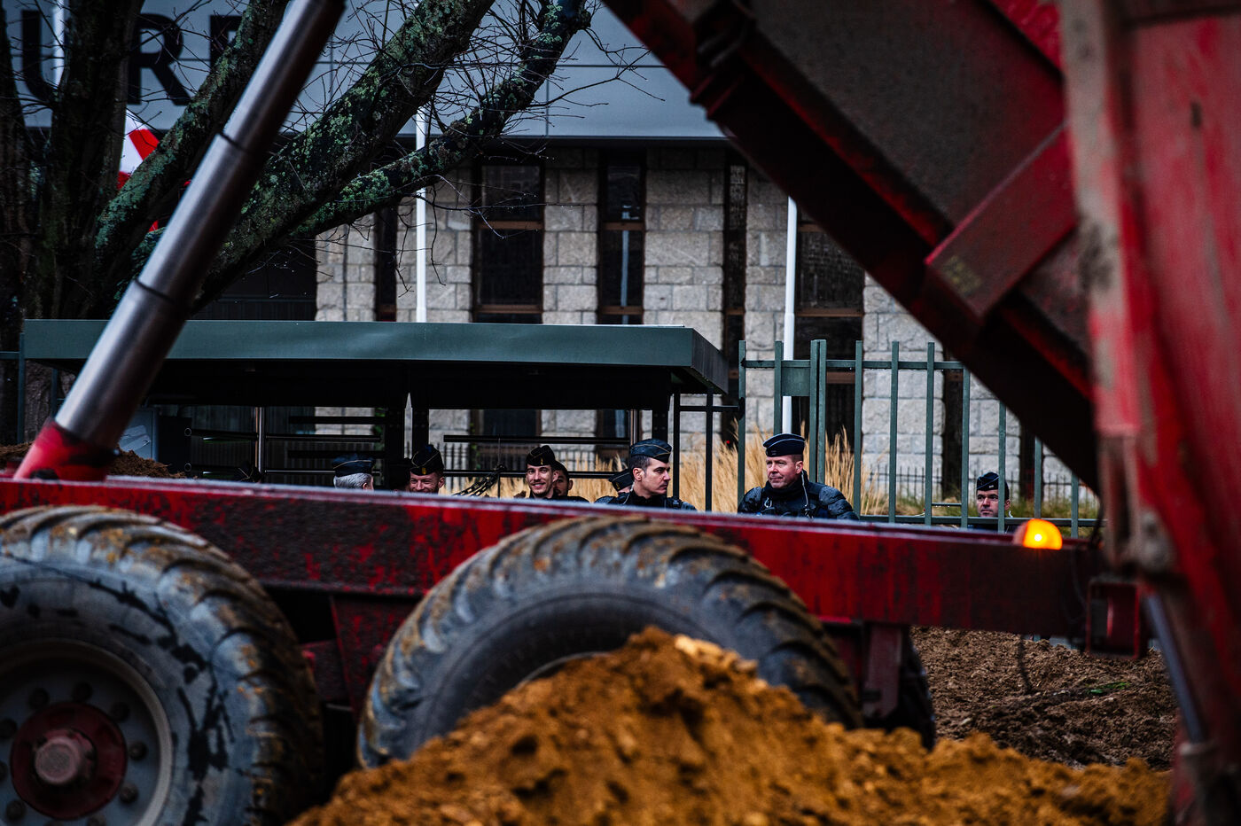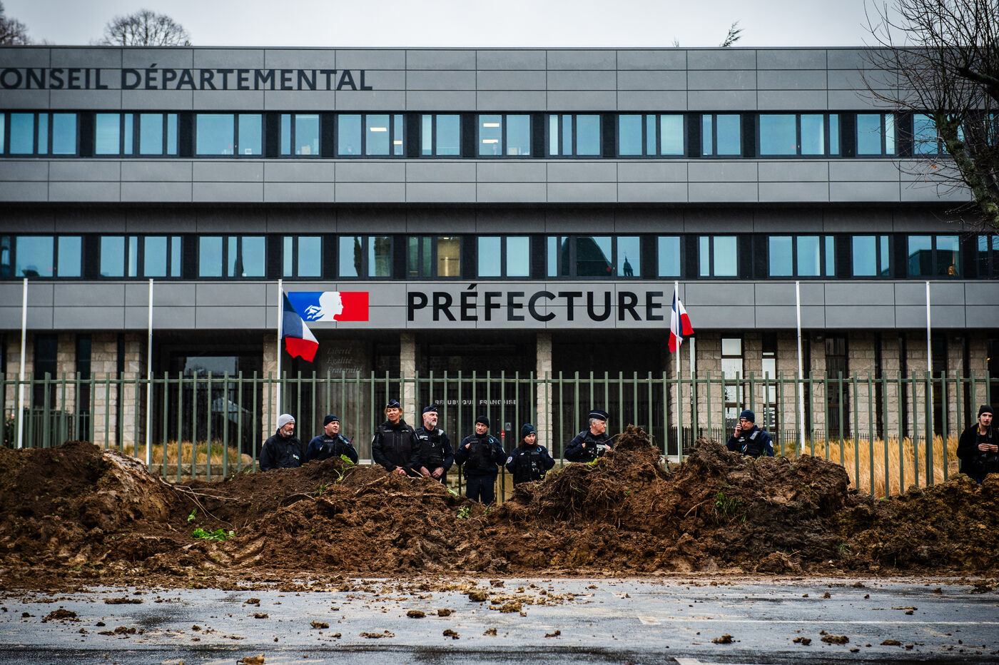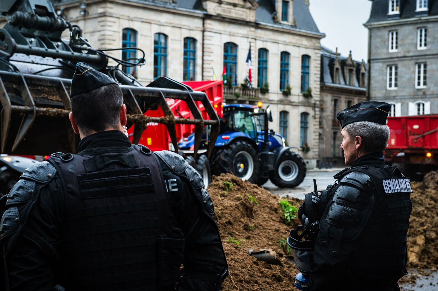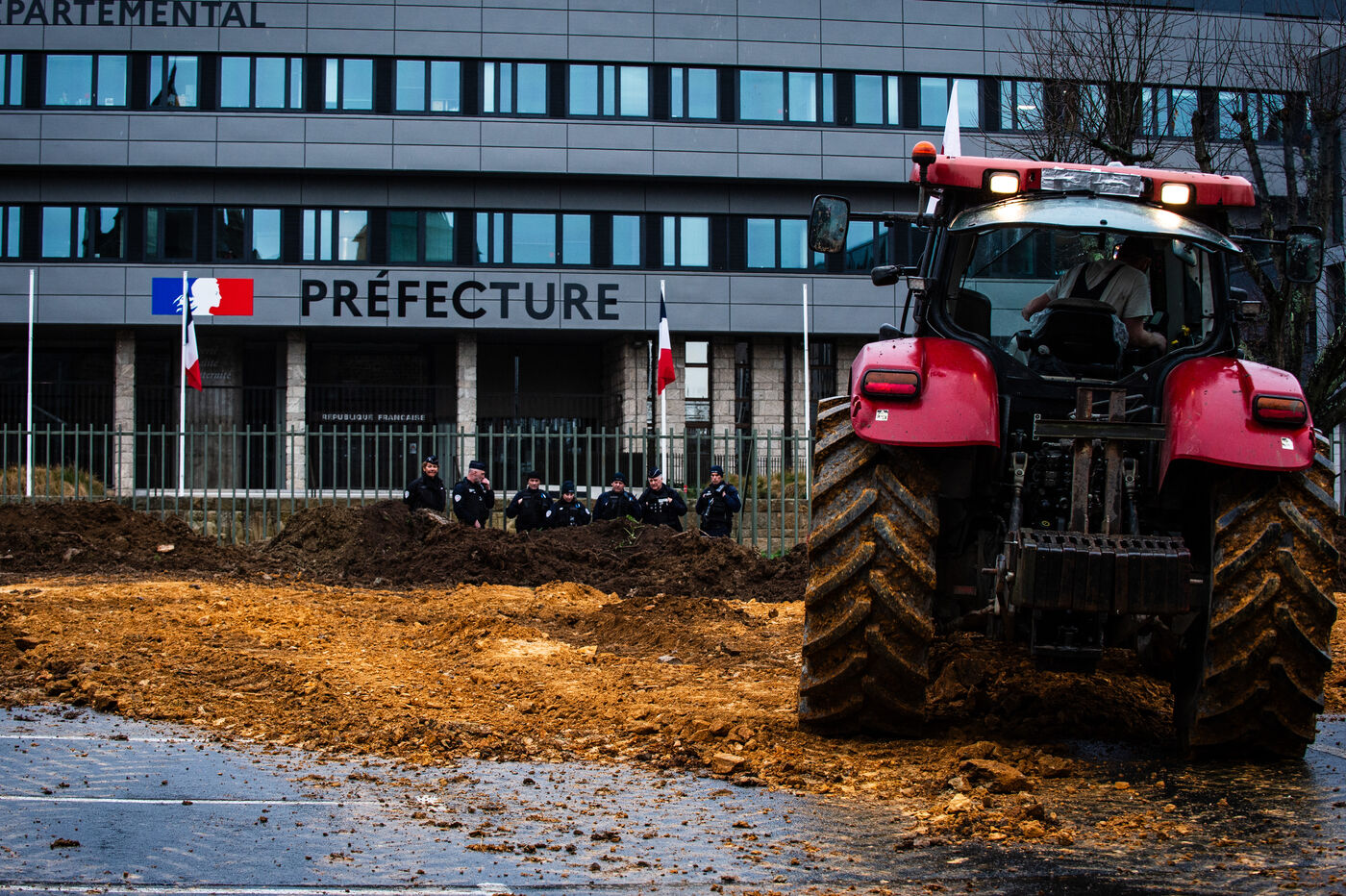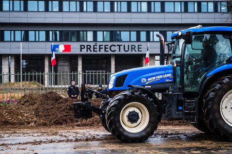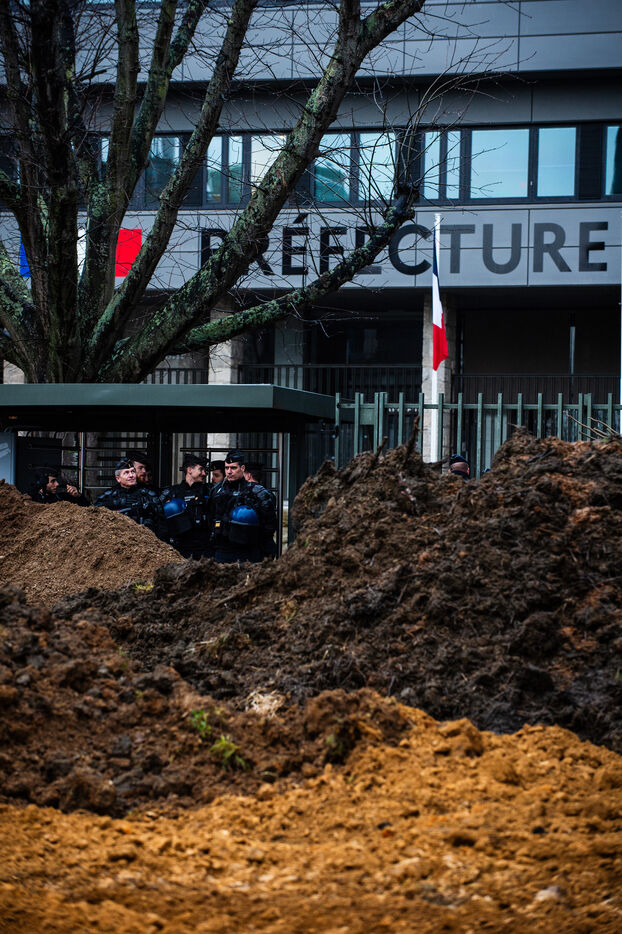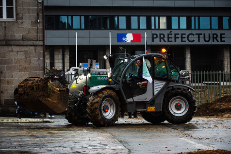 Symbolic action by the Jeunes agriculteurs (JA) and the Fédération départementale des syndicats d'exploitants agricoles, (FDSEA) des Côtes d'Armor, on Wednesday February 21, 2024 at the Saint-Brieuc prefecture. After blocking the RN12, the farmers dumped several skips of earth in front of the large number of gendarmes and police officers present, to create a meadow. A tractor then sowed the seeds of the future meadow, in reaction to the ban on turning over permanent meadows.