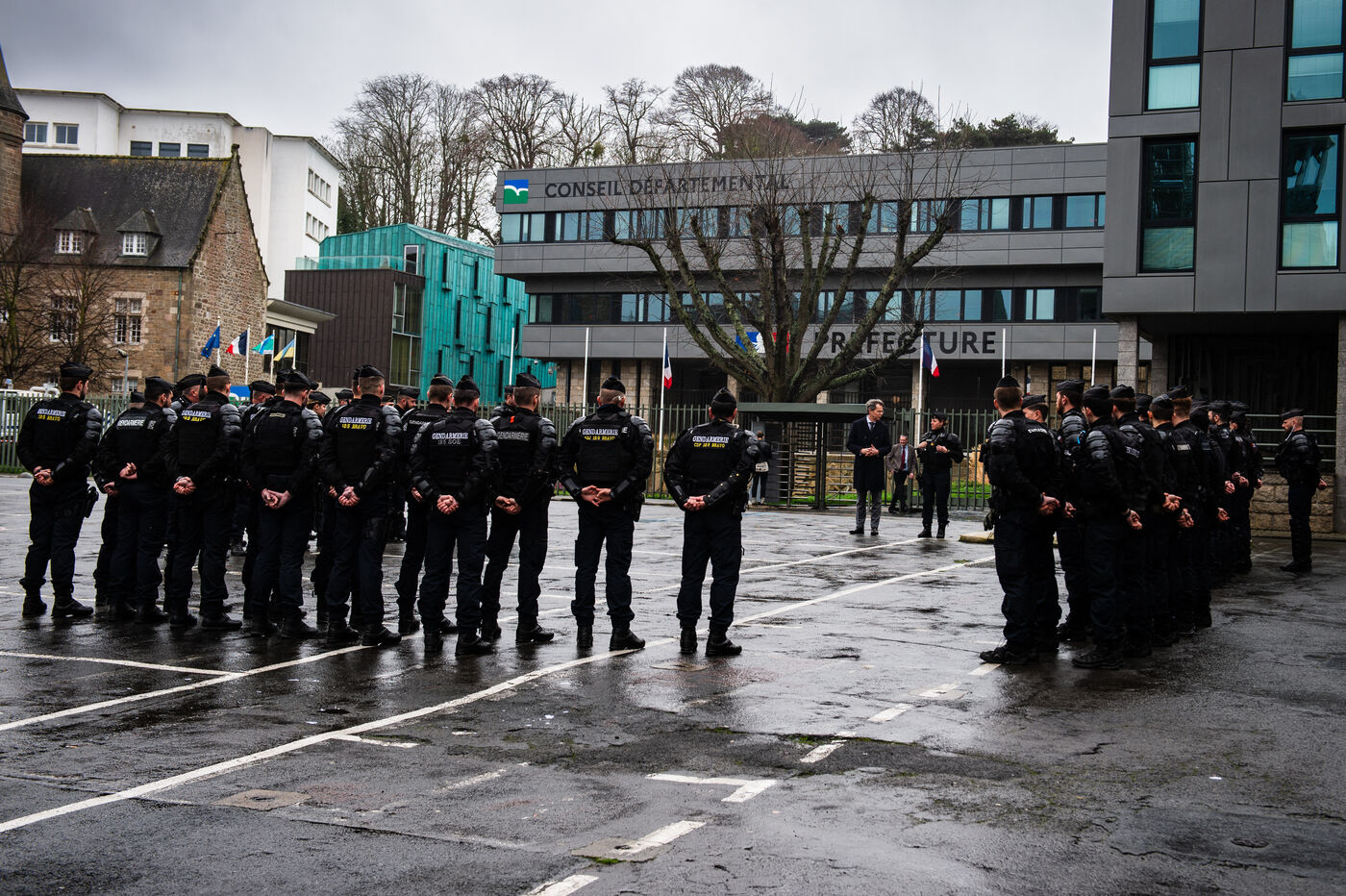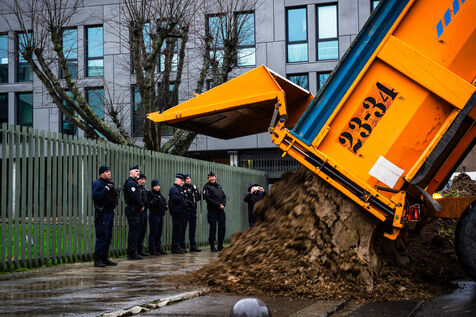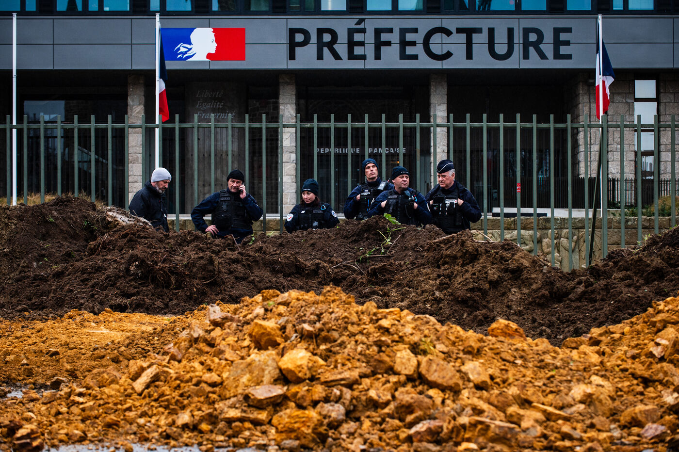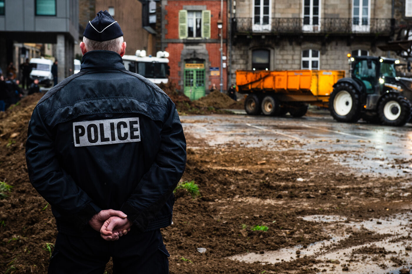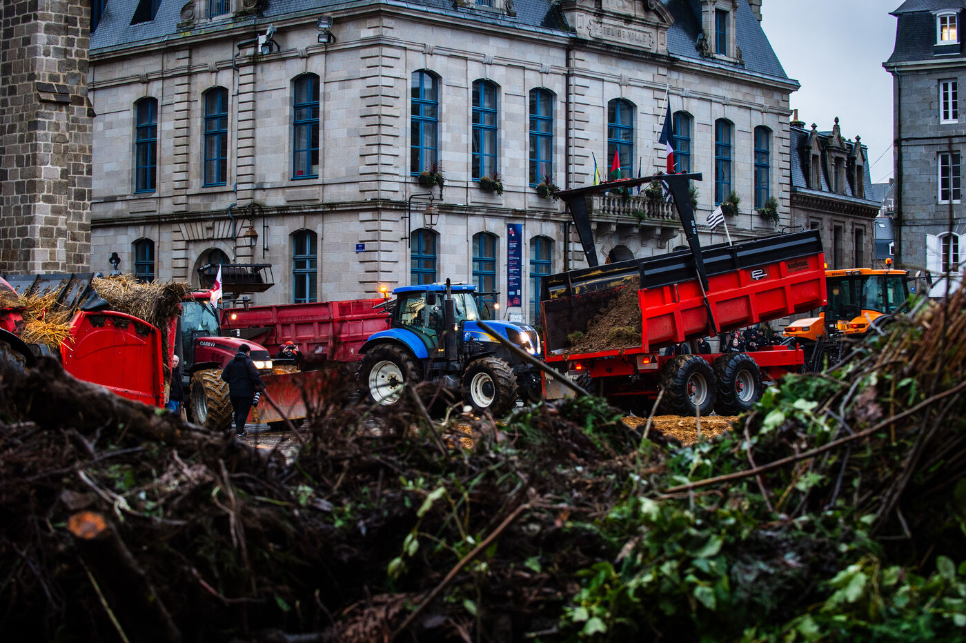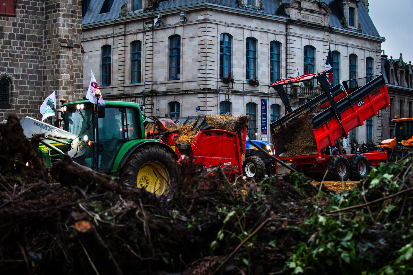 Symbolic action by the Jeunes agriculteurs (JA) and the Fédération départementale des syndicats d'exploitants agricoles, (FDSEA) des Côtes d'Armor, on Wednesday February 21, 2024 at the Saint-Brieuc prefecture. After blocking the RN12, the farmers dumped several skips of earth in front of the large number of gendarmes and police officers present, to create a meadow. A tractor then sowed the seeds of the future meadow, in reaction to the ban on turning over permanent meadows.
