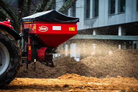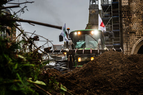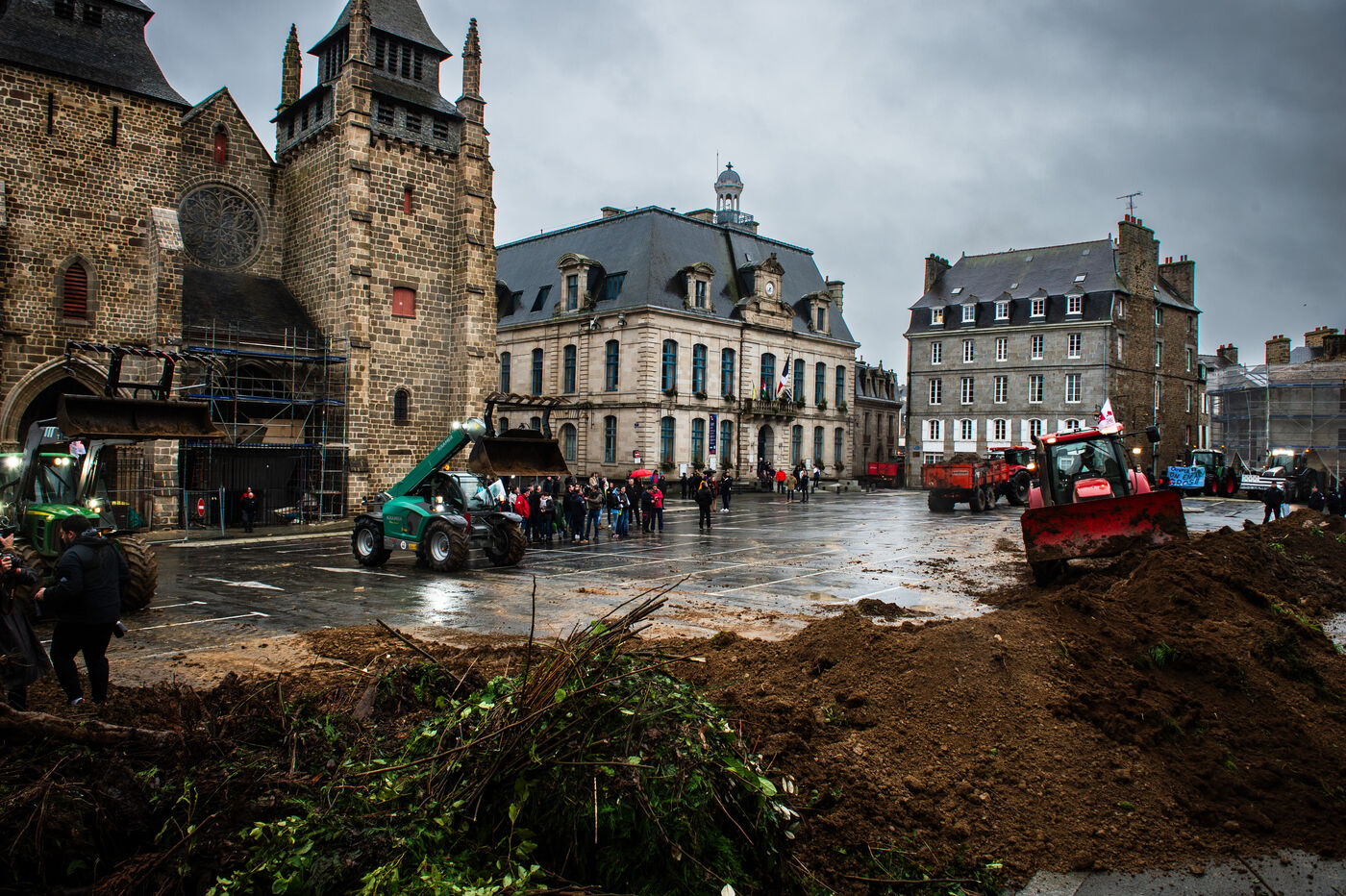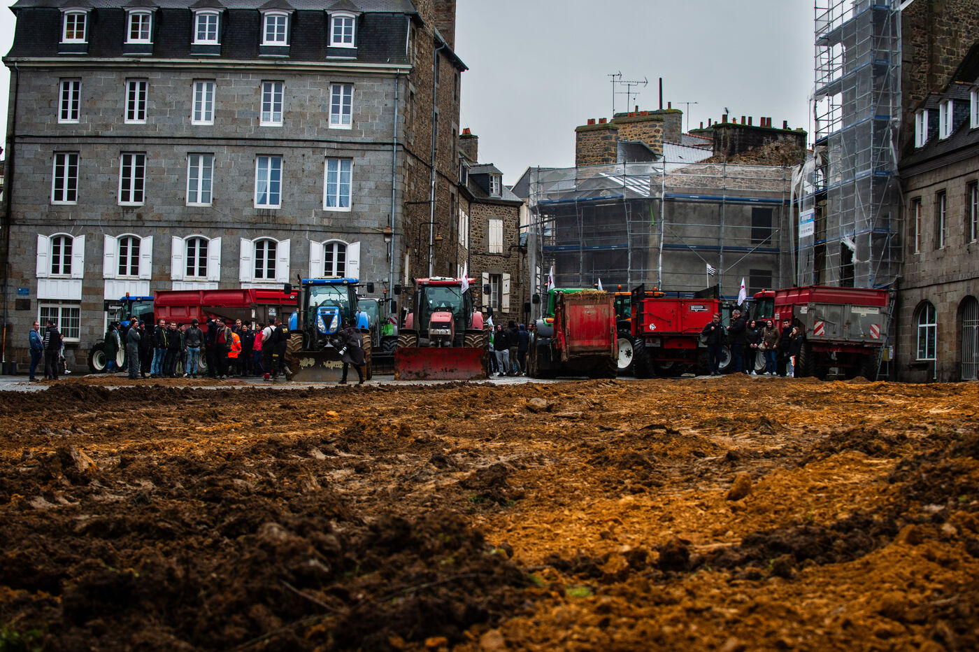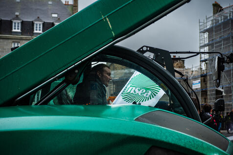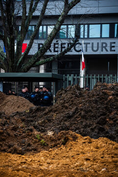 Action symbolique des Jeunes agriculteurs (JA) et de la Fédération départementale des syndicats d'exploitants agricoles, (FDSEA) des Côtes d'Armor, le mercredi 21 février 2024 à la préfecture de Saint-Brieuc. Apres avoir bloqué la RN12, les agriculteurs.trices, ont déversé plusieurs bennes de terre devant les gendarmes et policiers présents en grand nombre, de façon à constituer une prairie. Un tracteur a donc semé les graines de la future prairie, ceci en réaction à l'interdiction de retournement des prairies permanentes.