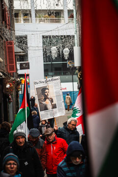 Manifestation organisée par le collectif "Paix Palestine" en hommage aux enfants tués, blessés ou morts de faim à Gaza. Une plaque commémorative avec l'inscription "Place des Enfants de Gaza" et mentionnant une période allant du 7 octobre 2023 au 7 décembre 2024 évoquant les plus de 16 000 enfants tues ou morts de faim à Gaza a été fixée sur un arbre du centre ville de Saint-Brieuc.